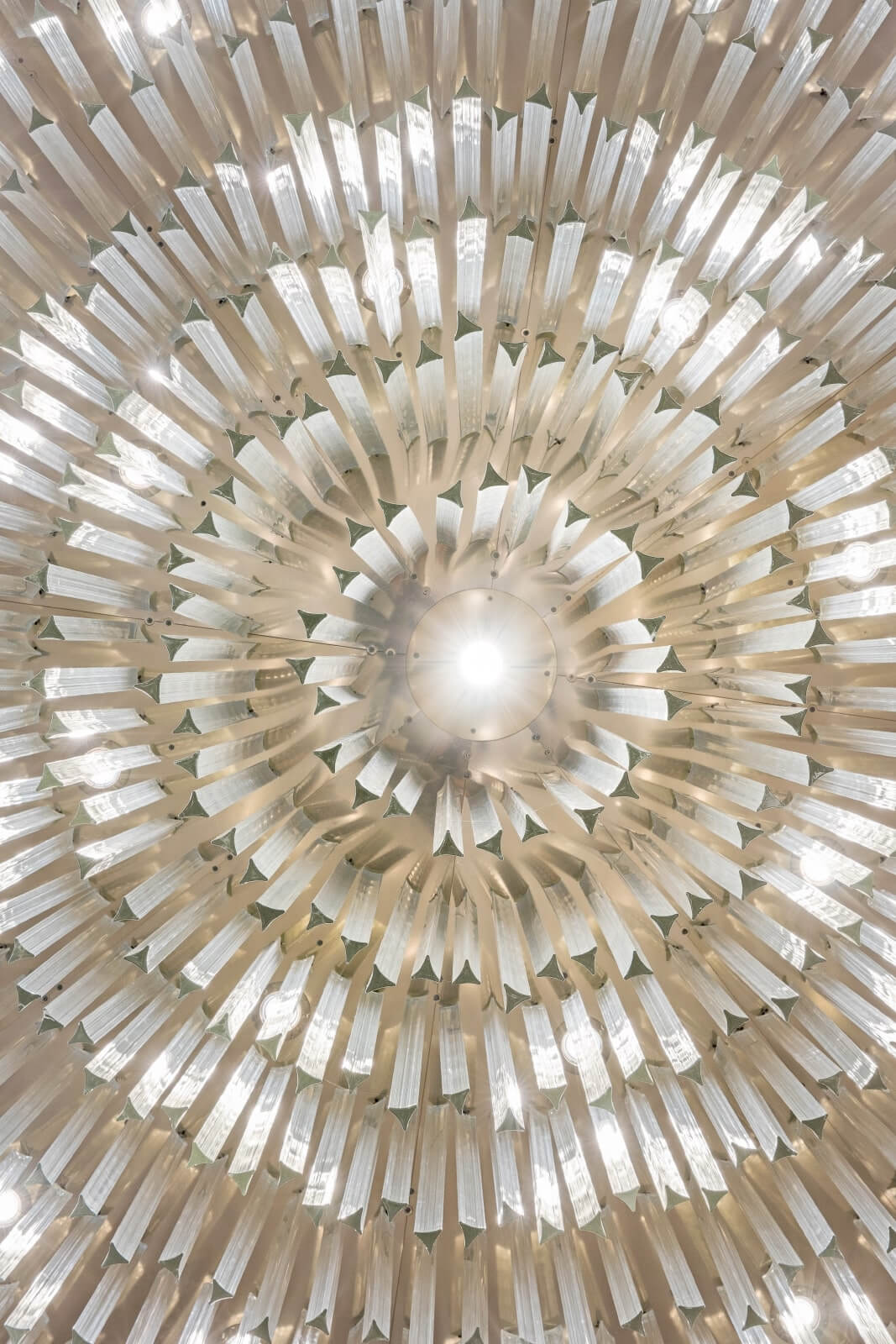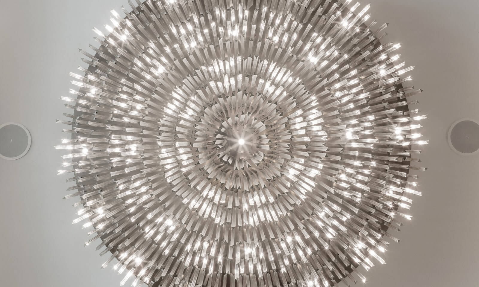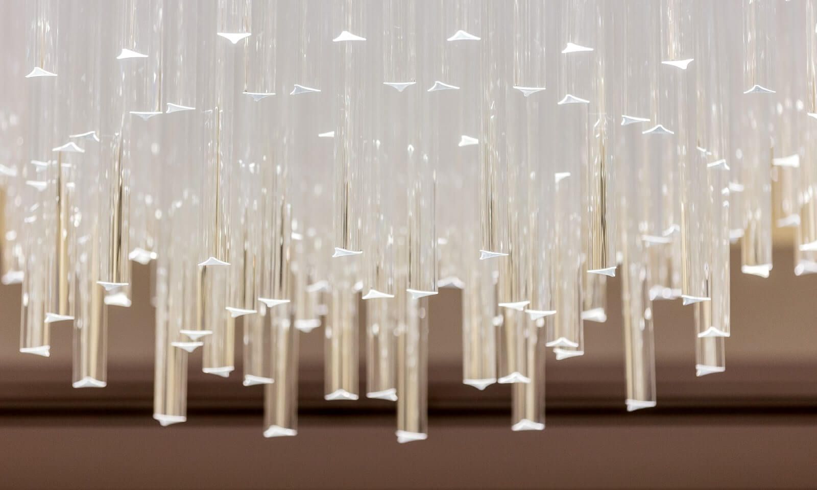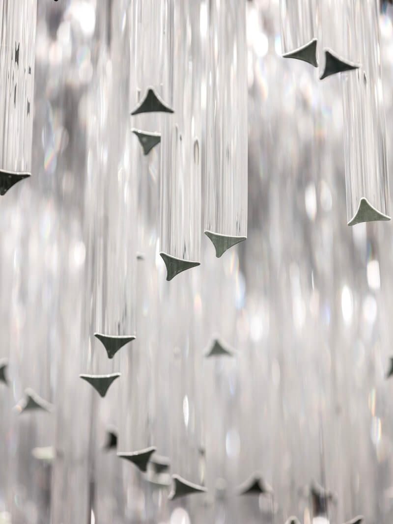 The installation is formed triangular prisms in flawlessly polished technical glass. Choosing this shape rather than the classically shaped crystal components creates an intriguing piece that provides a different aesthetic from different angles. When observed from below, this installation creates the impression of a flower in full bloom.