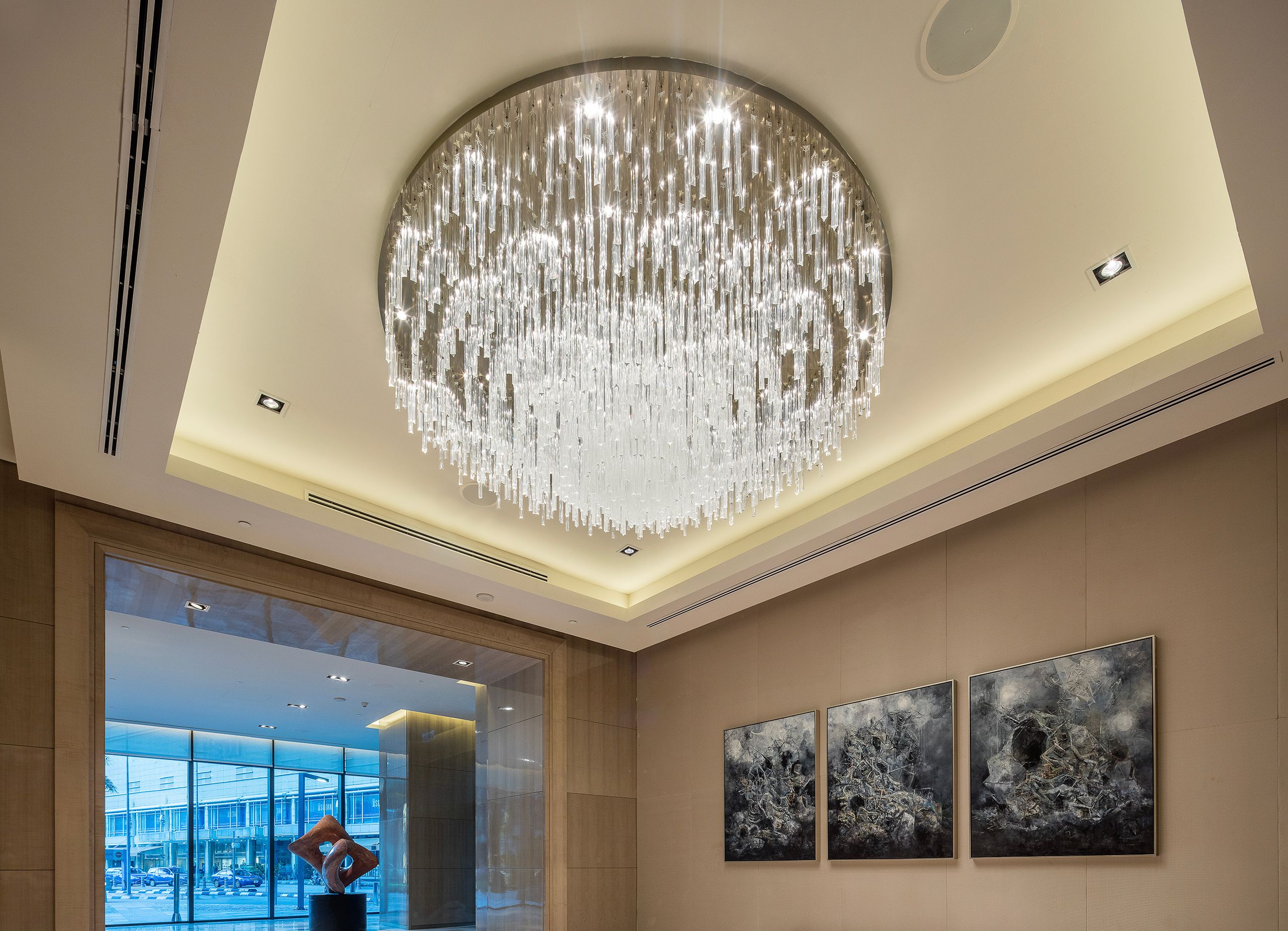 We designed the installation as a centrepiece for the hotel’s lobby. Given the clean, contemporary interiors we created a more pared-down but still visually delightful interpretation of the the traditional chandelier.