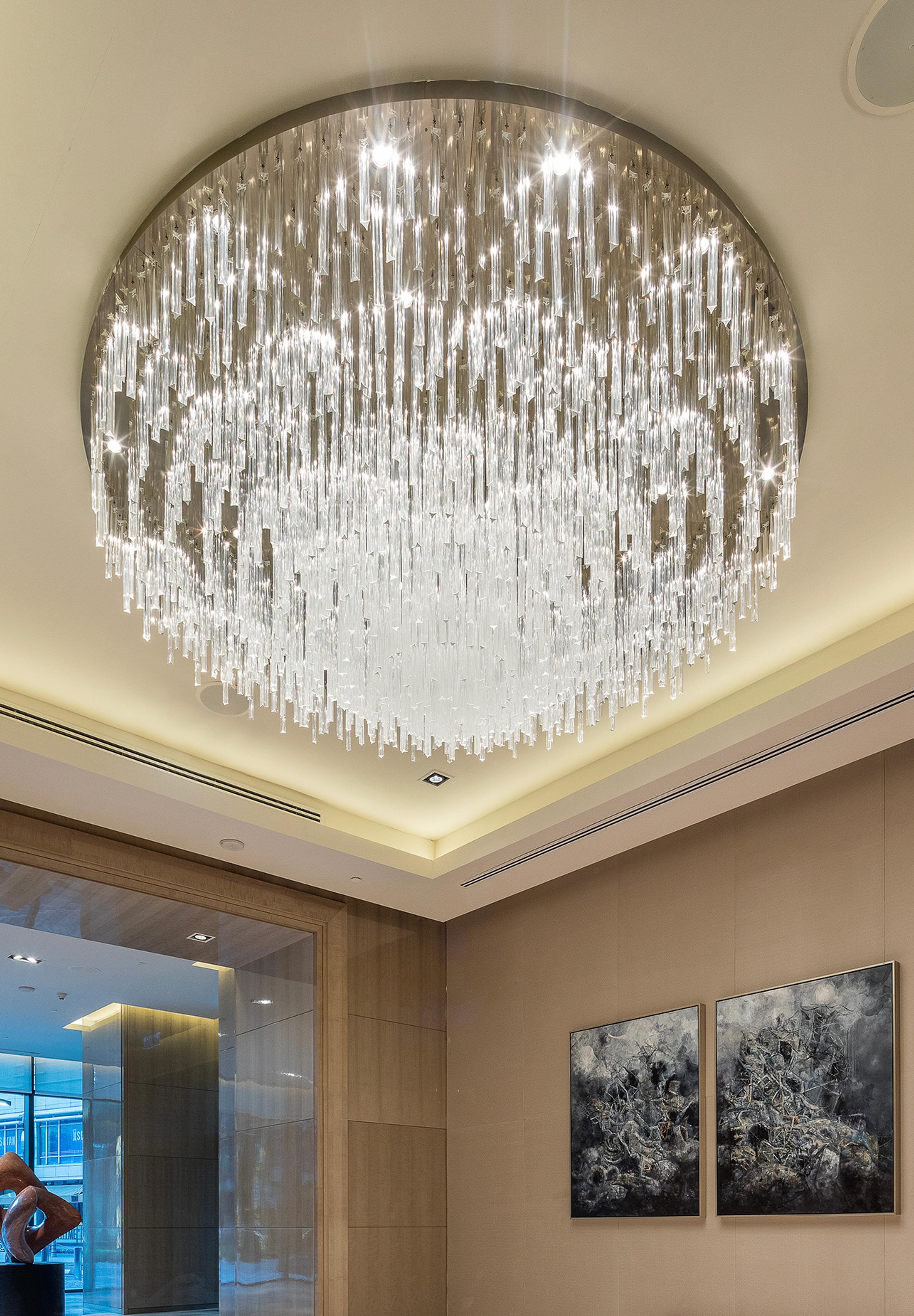 It includes a total of 868 prism components in seven different lengths, ranging from 250 to 900 mm. The final effect is a dramatically original chandelier, perfect for the contemporary luxury of the interior.