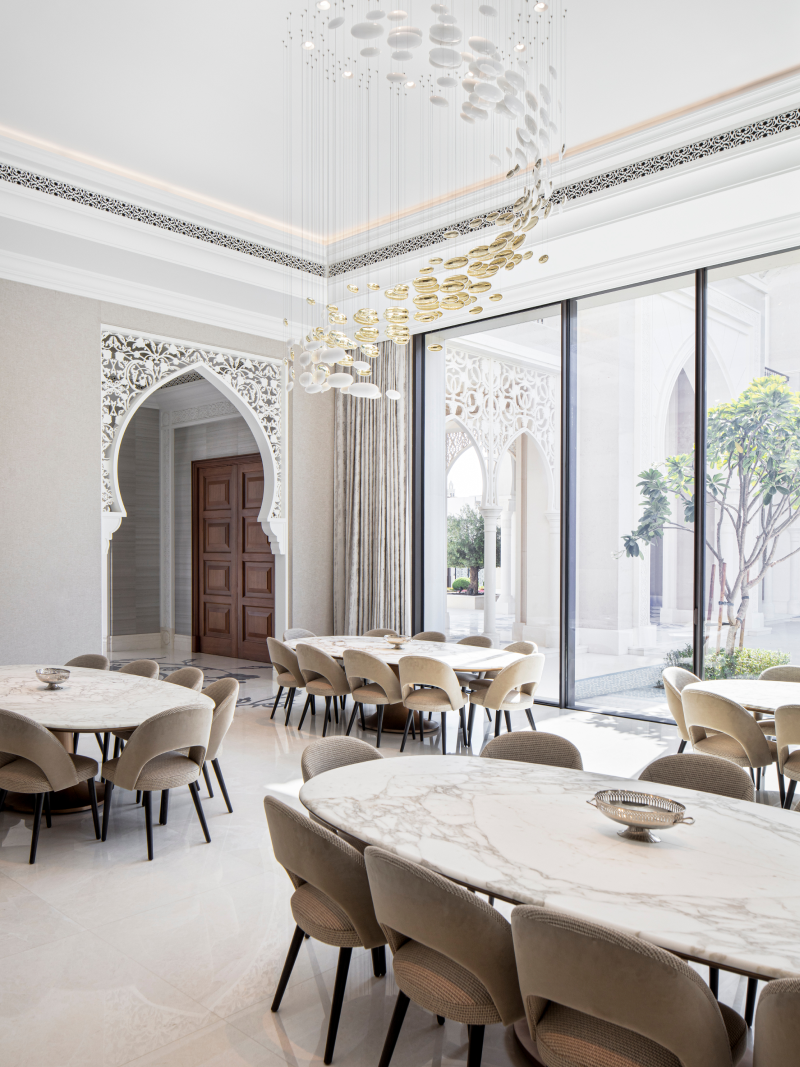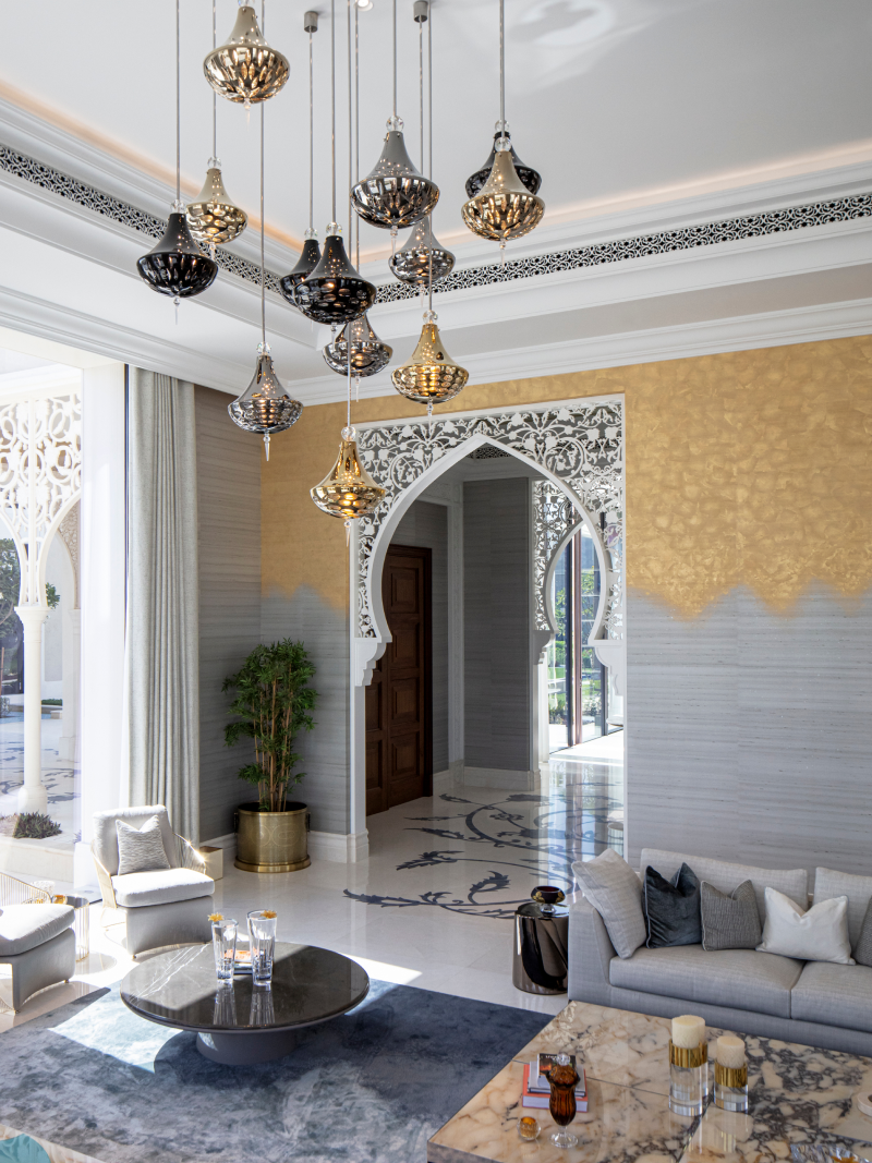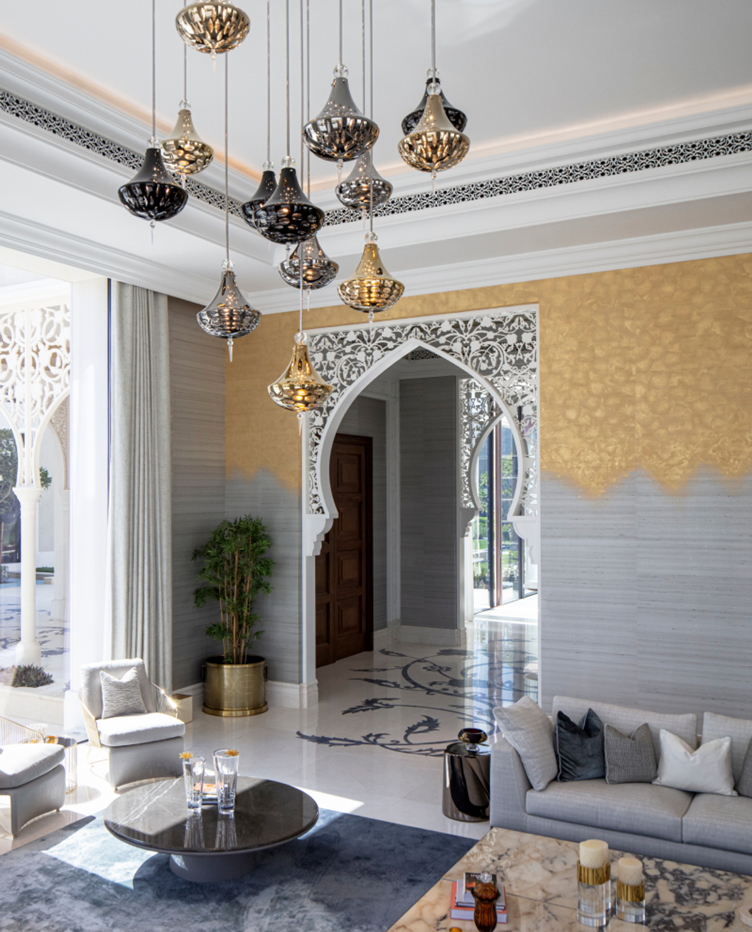 The designs also incorporate traditional motifs from the Middle East, including delicately crafted crystal lanterns suspended through the interior.