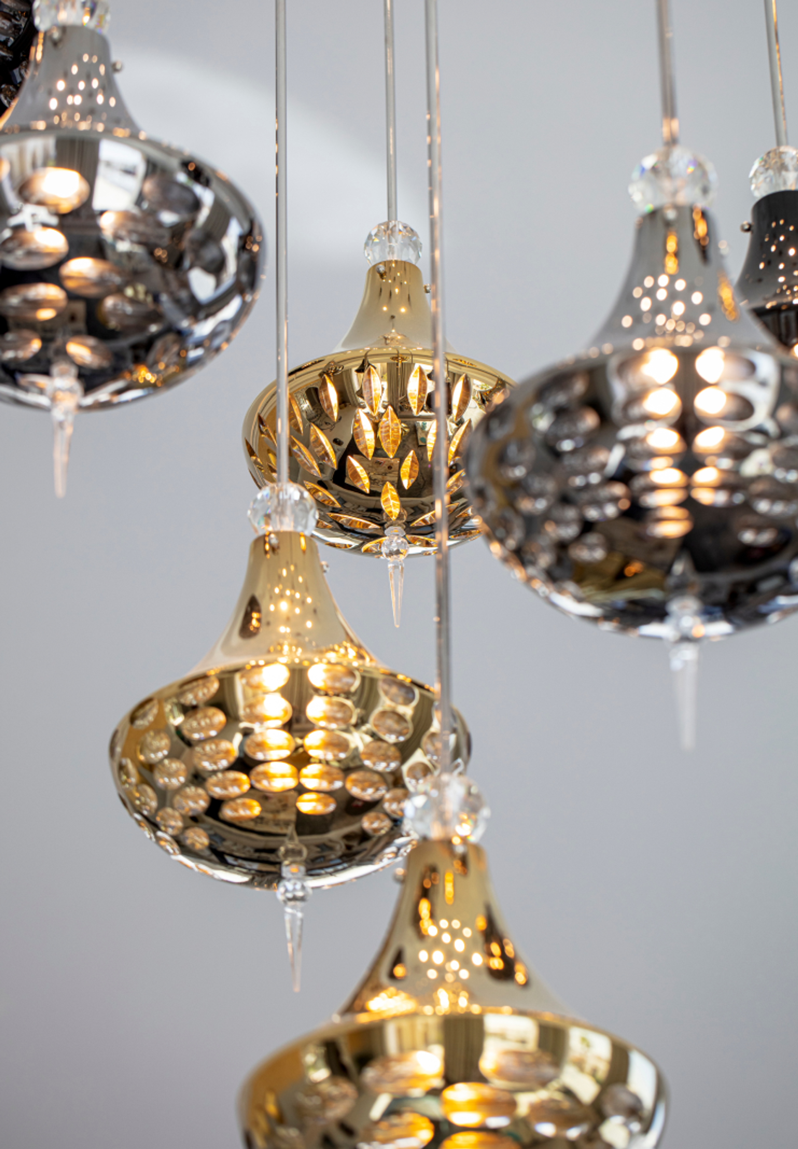 Based on our BOWLS collection, we created the centrepiece for the dining area formed of handblown glass components finished in contrasting cool white and warm golden hues to create a wave of light through the space.