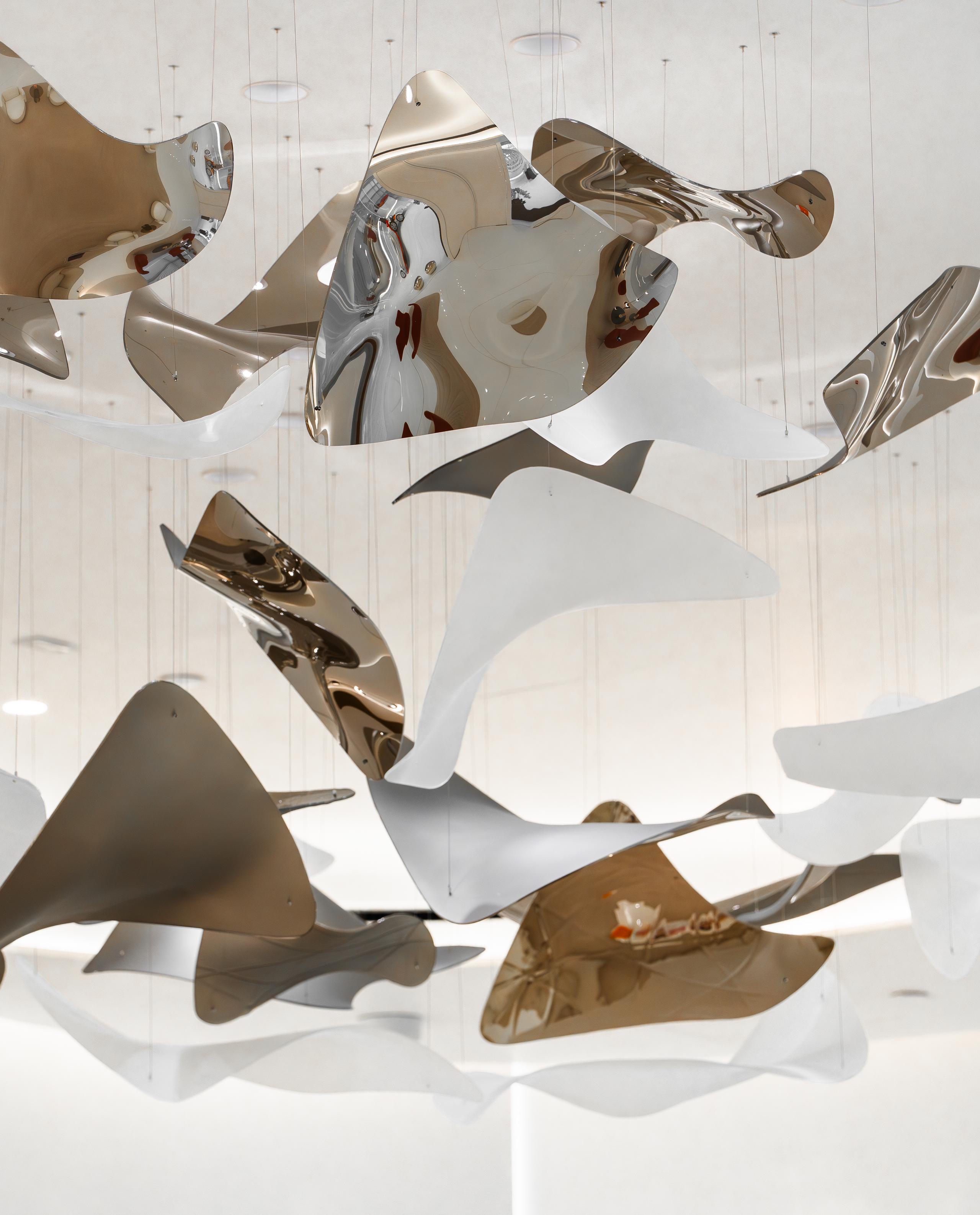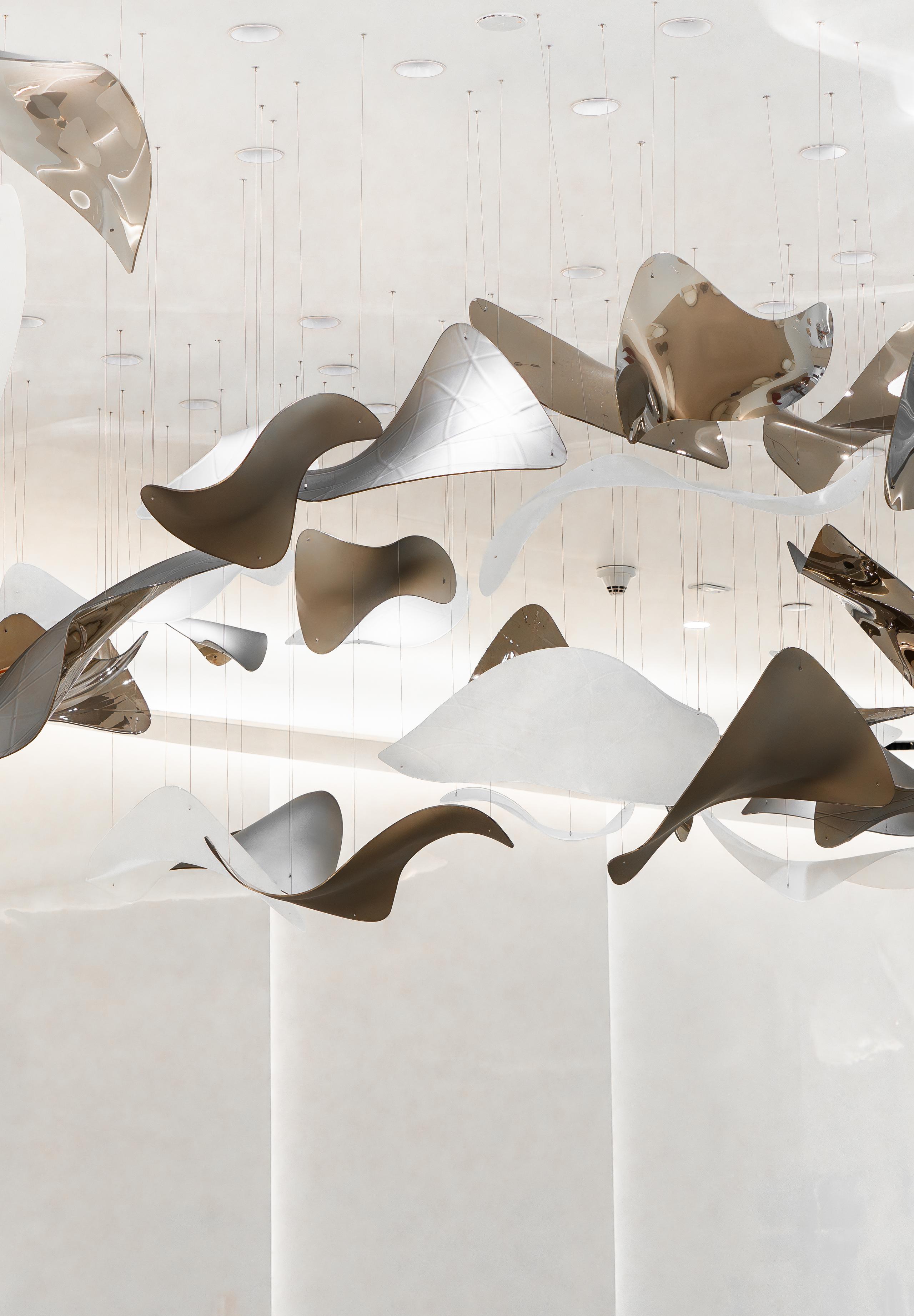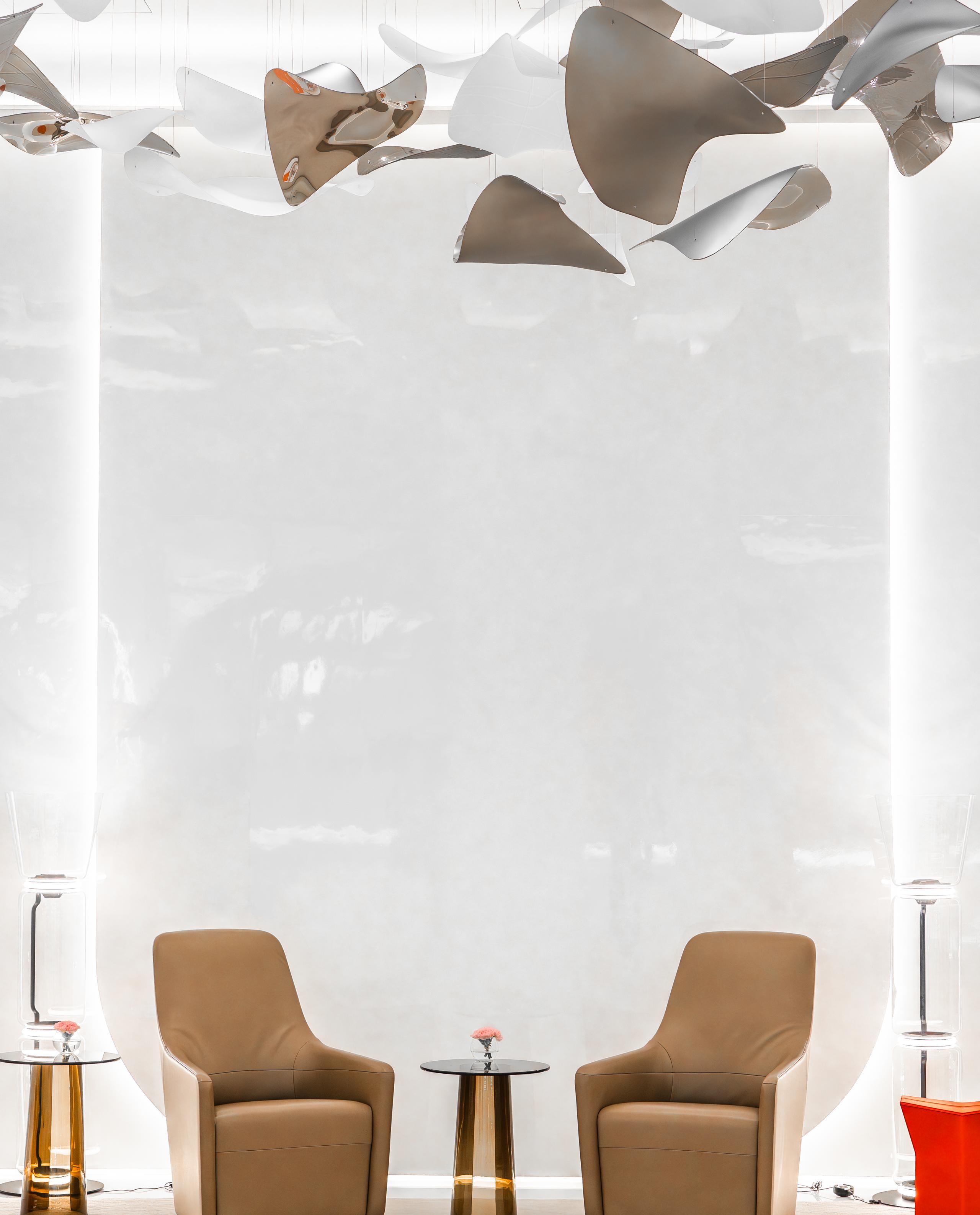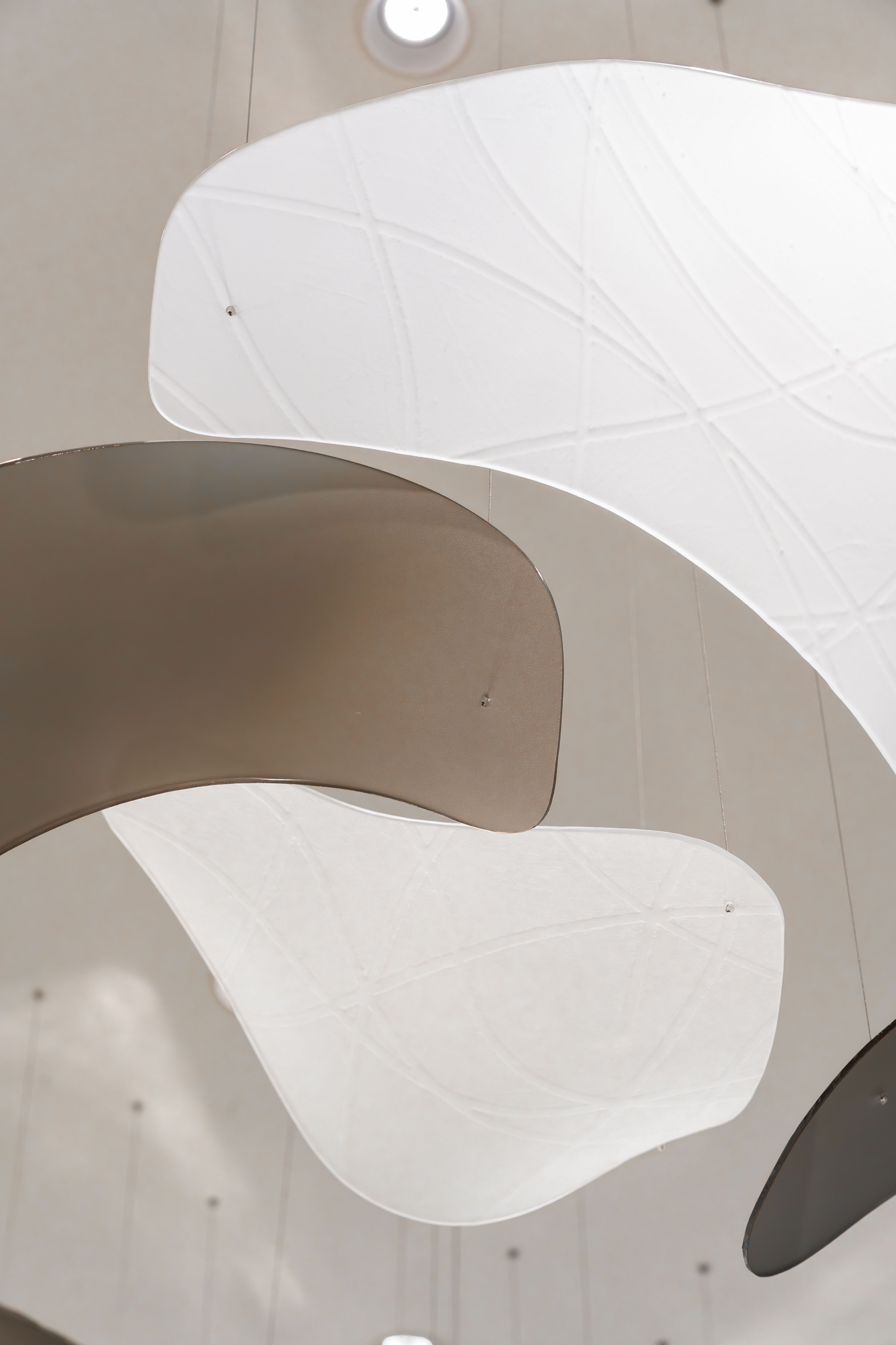 Collaborating closely with the design team, we adapted our Flux collection to echo the aerodynamic curves of airplane wings in motion. The resulting bespoke creation seamlessly integrates form and function, embodying the elegance of flight and bringing an airy sense of modernity to the VIP lounges.