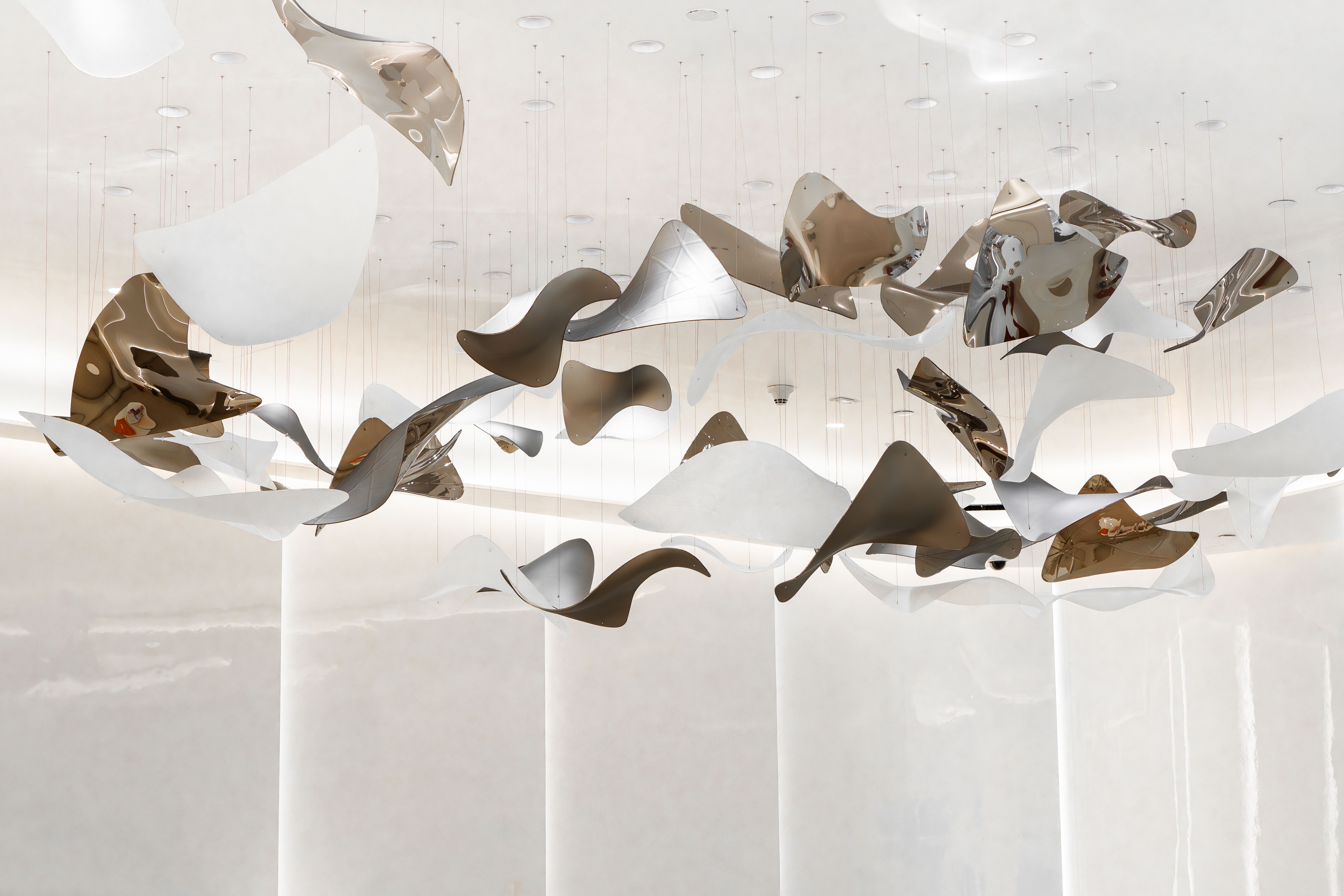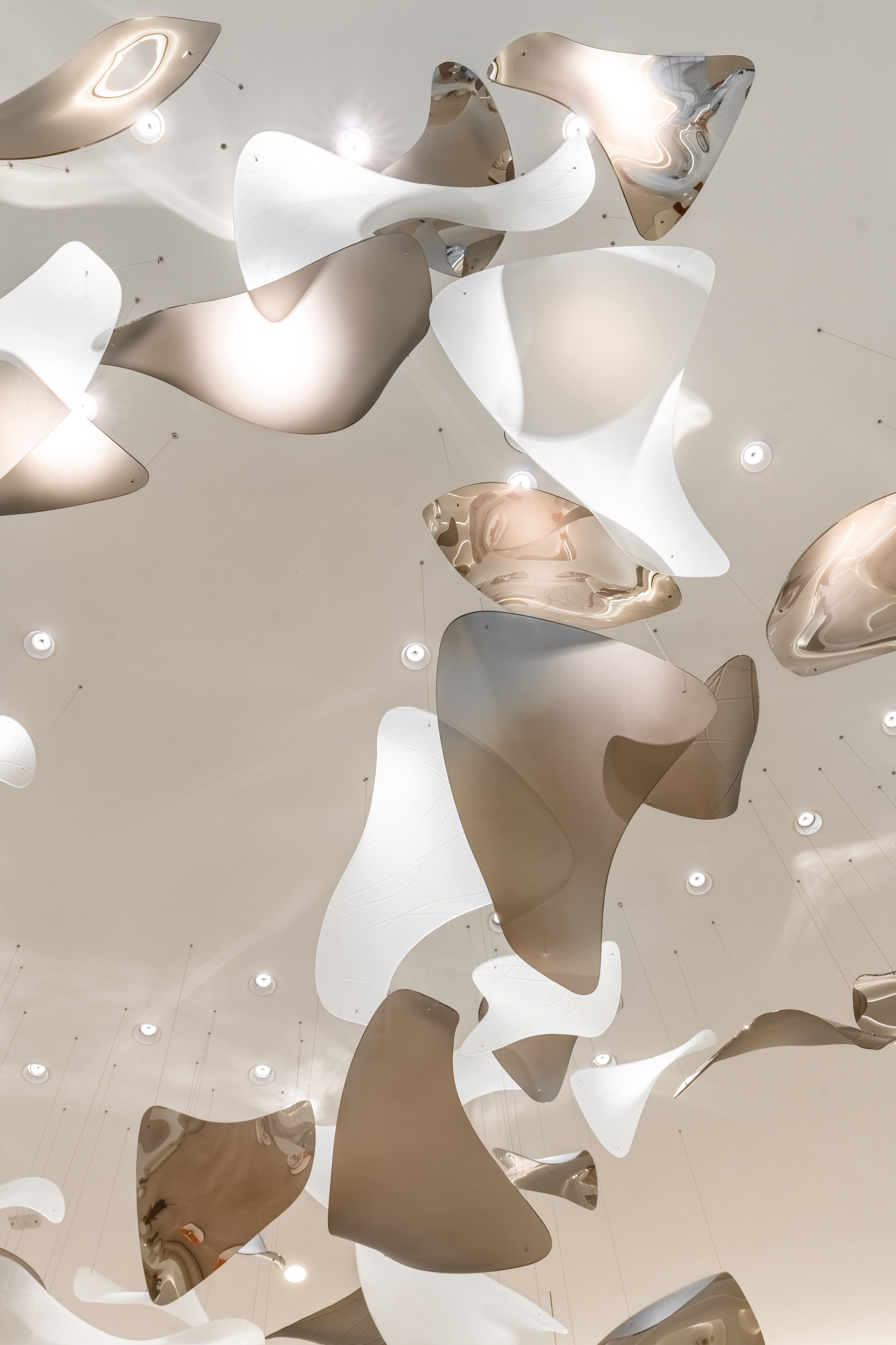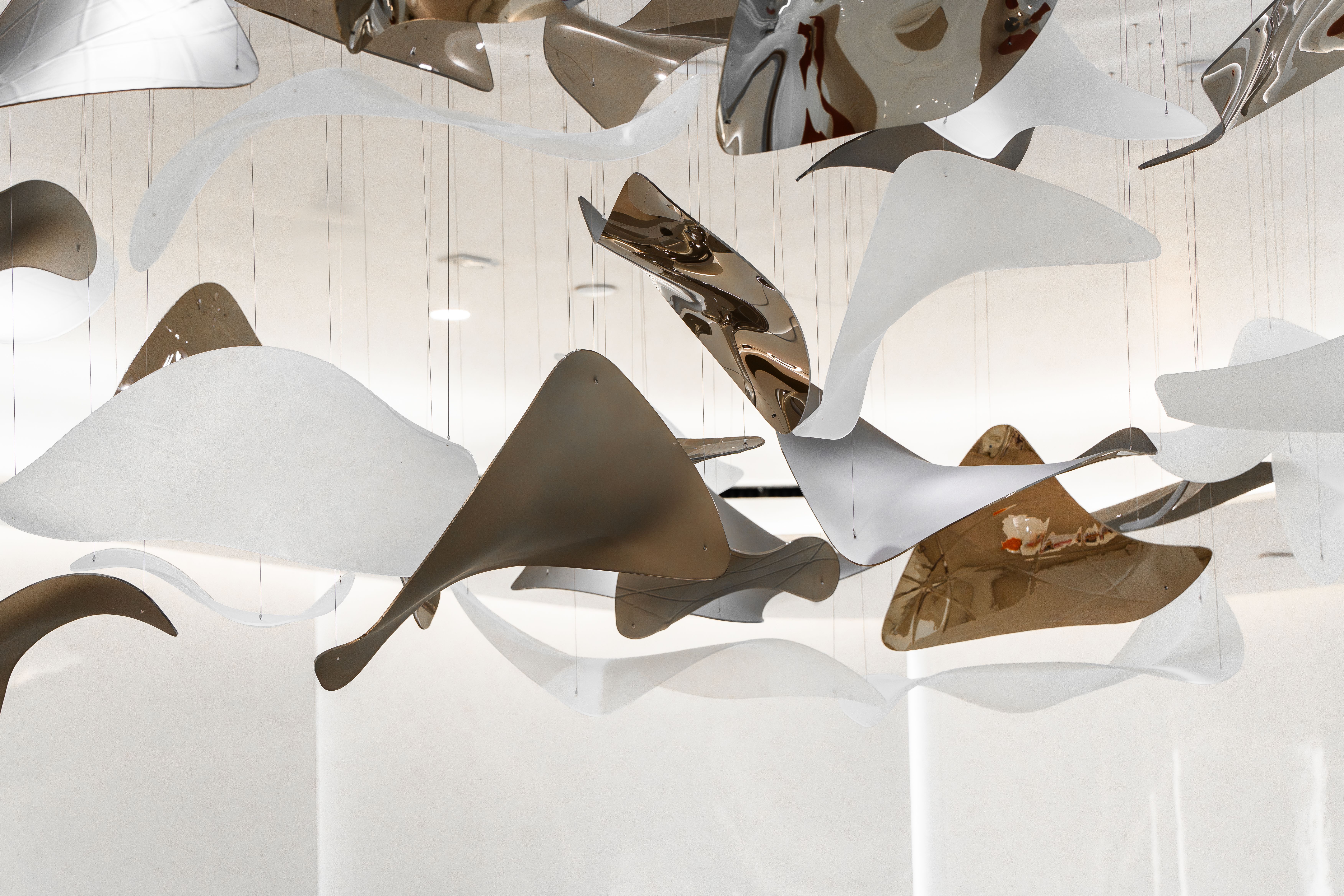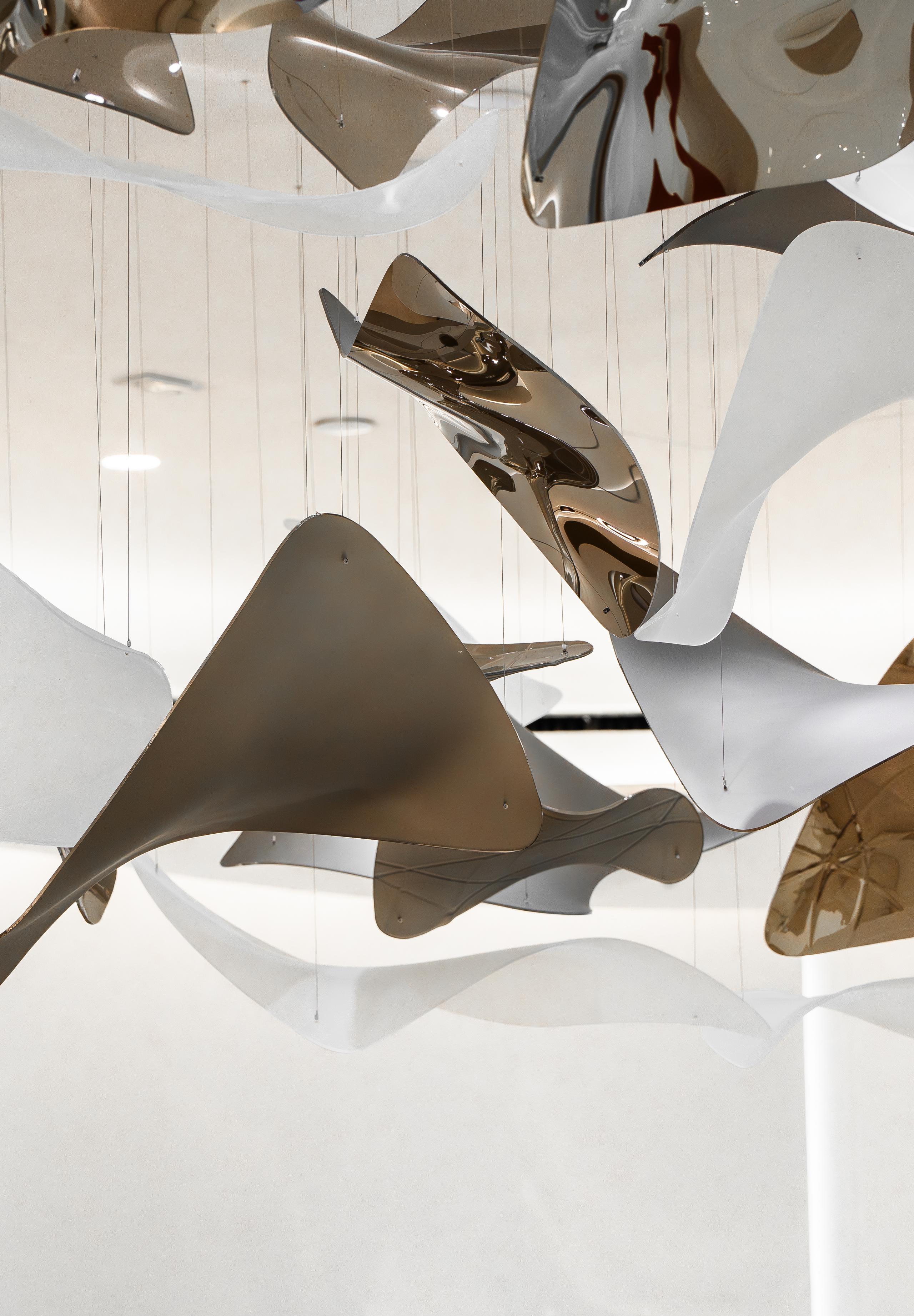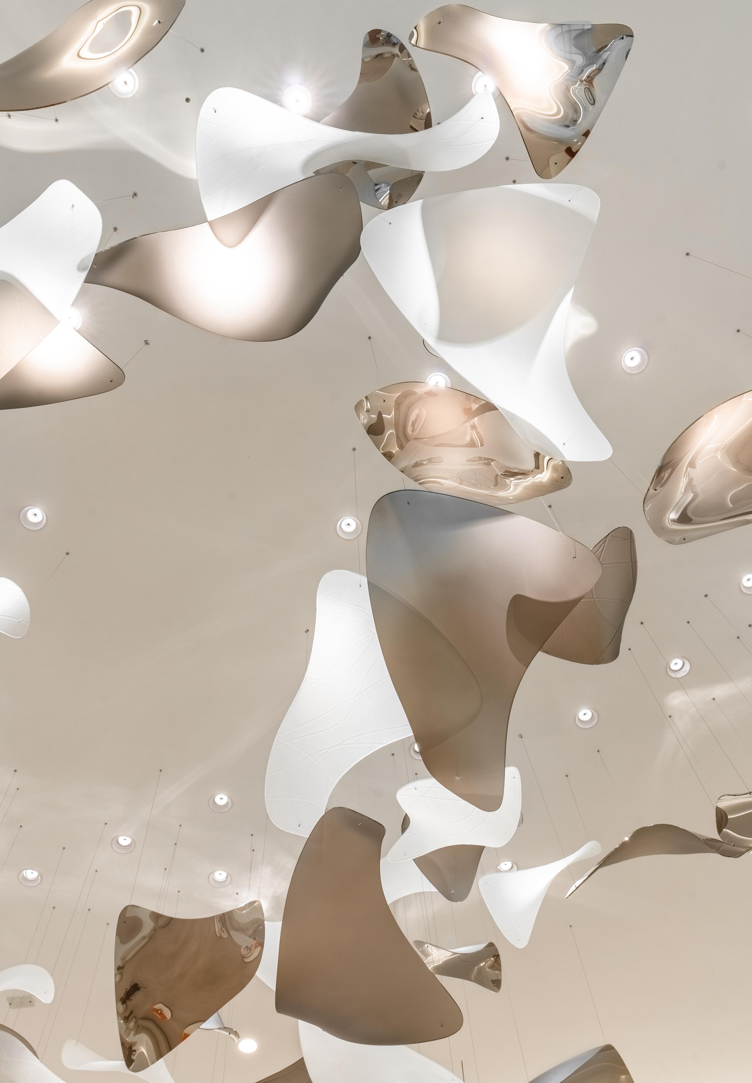 Collaborating closely with the design team, we adapted our Flux collection to echo the aerodynamic curves of airplane wings in motion. The resulting bespoke creation seamlessly integrates form and function, embodying the elegance of flight and bringing an airy sense of modernity to the VIP lounges.