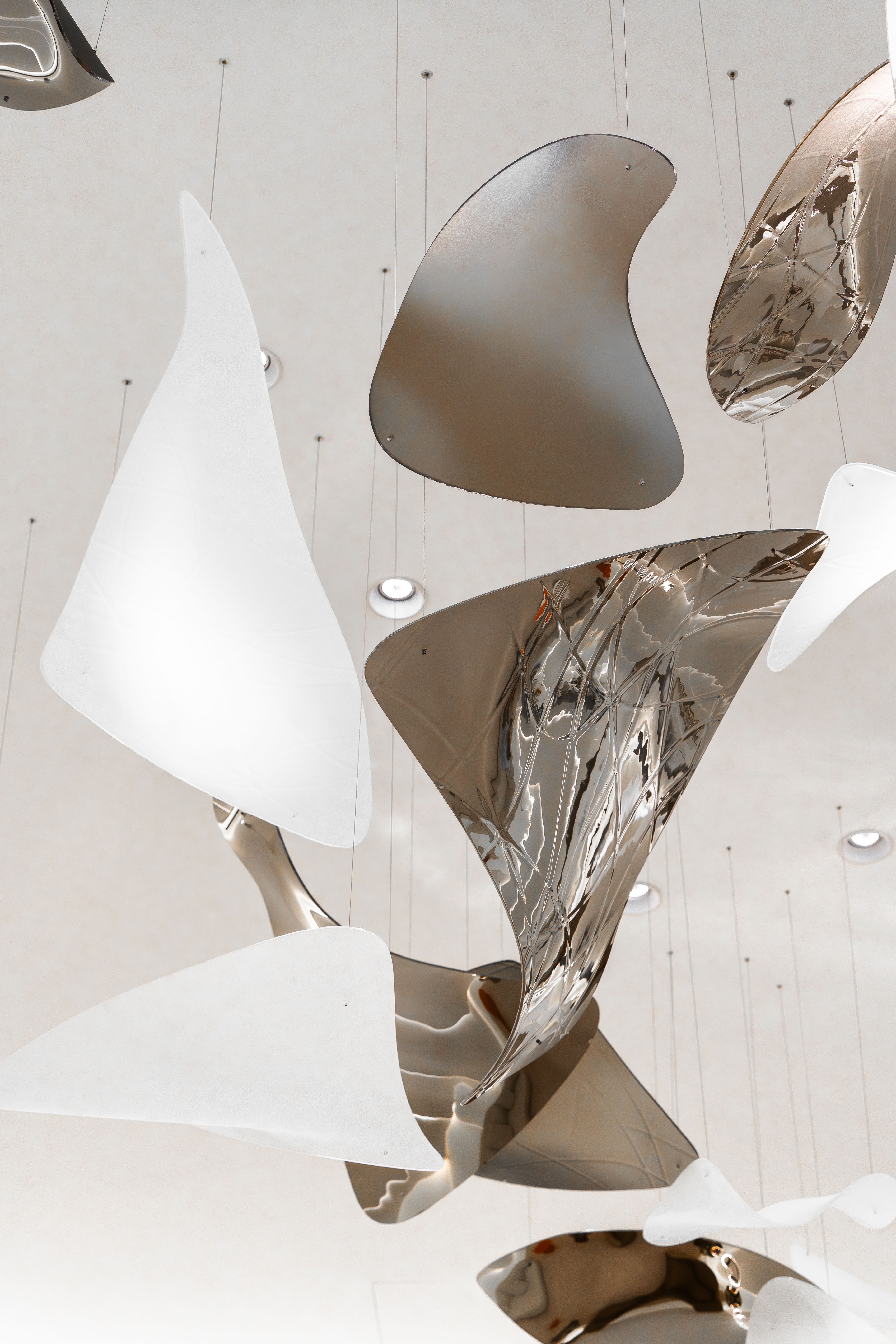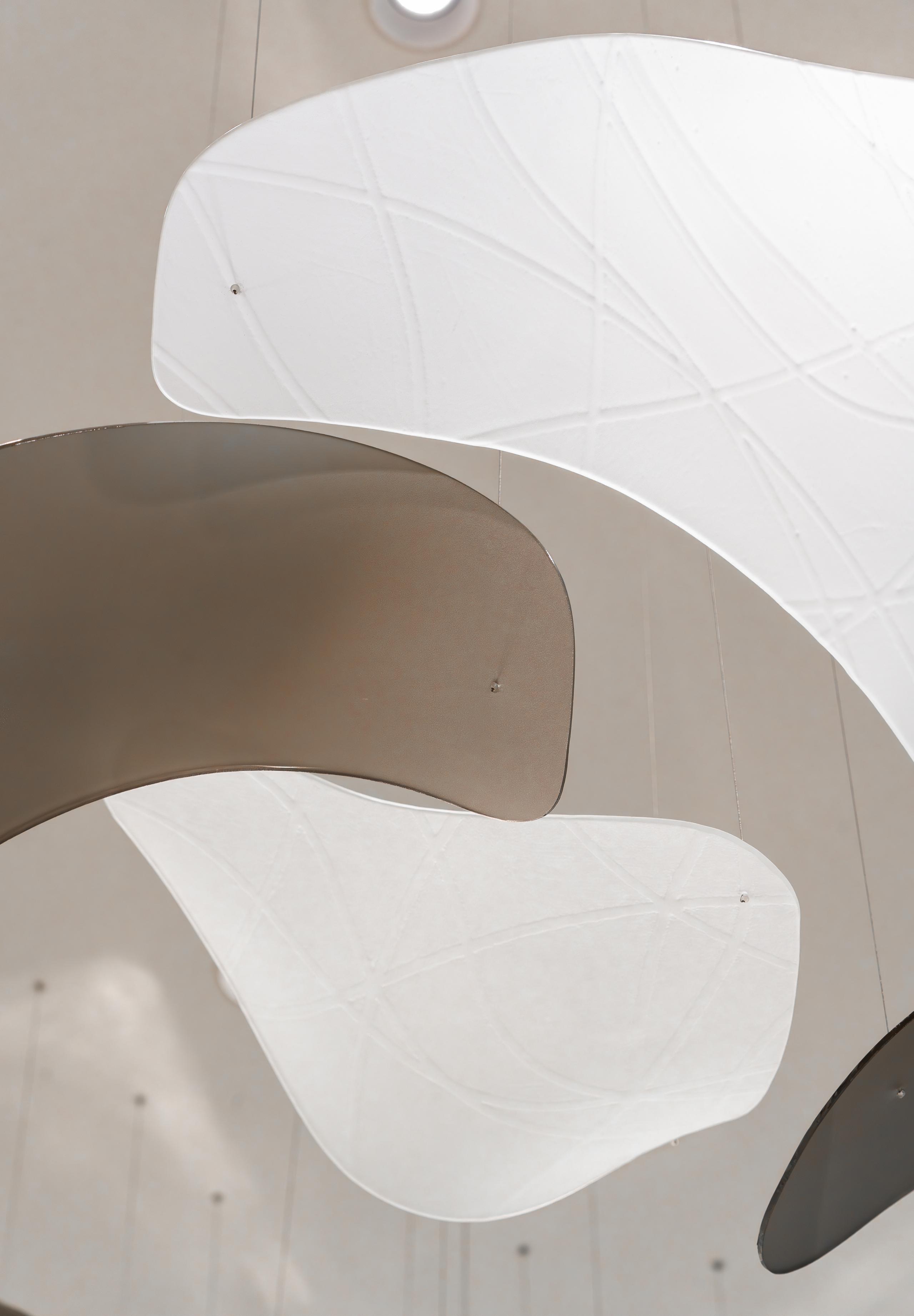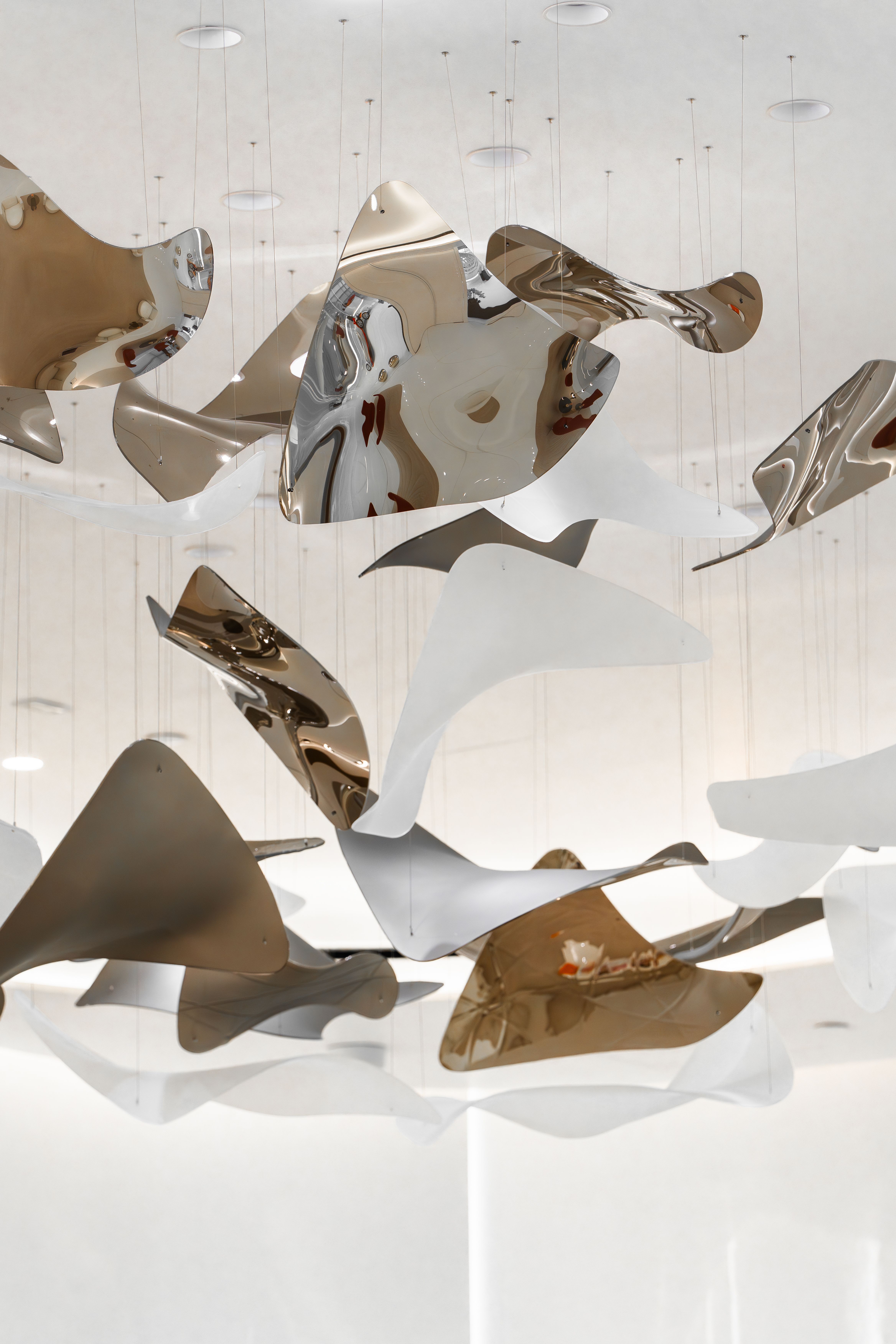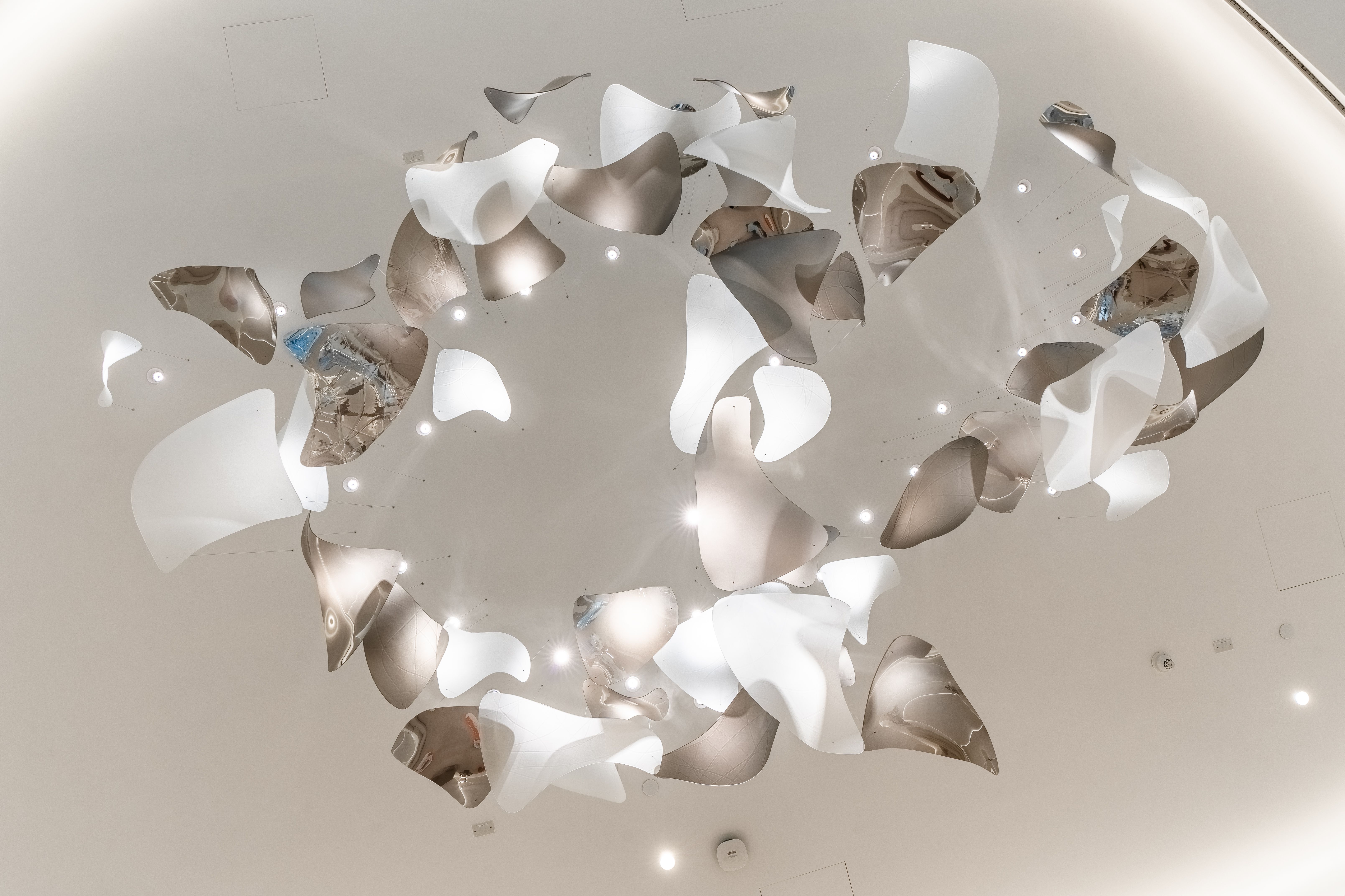 Collaborating closely with the design team, we adapted our Flux collection to echo the aerodynamic curves of airplane wings in motion. The resulting bespoke creation seamlessly integrates form and function, embodying the elegance of flight and bringing an airy sense of modernity to the VIP lounges.