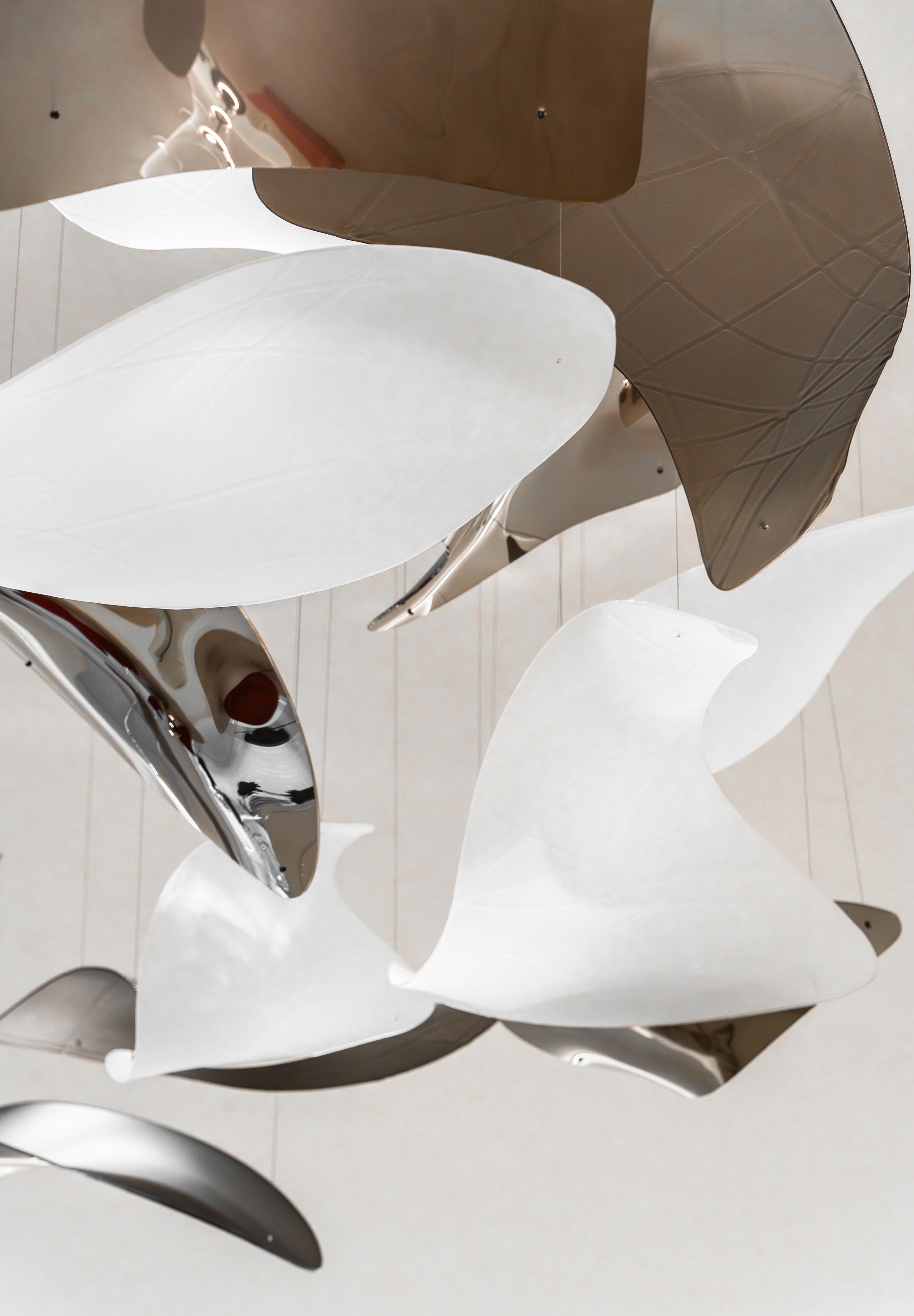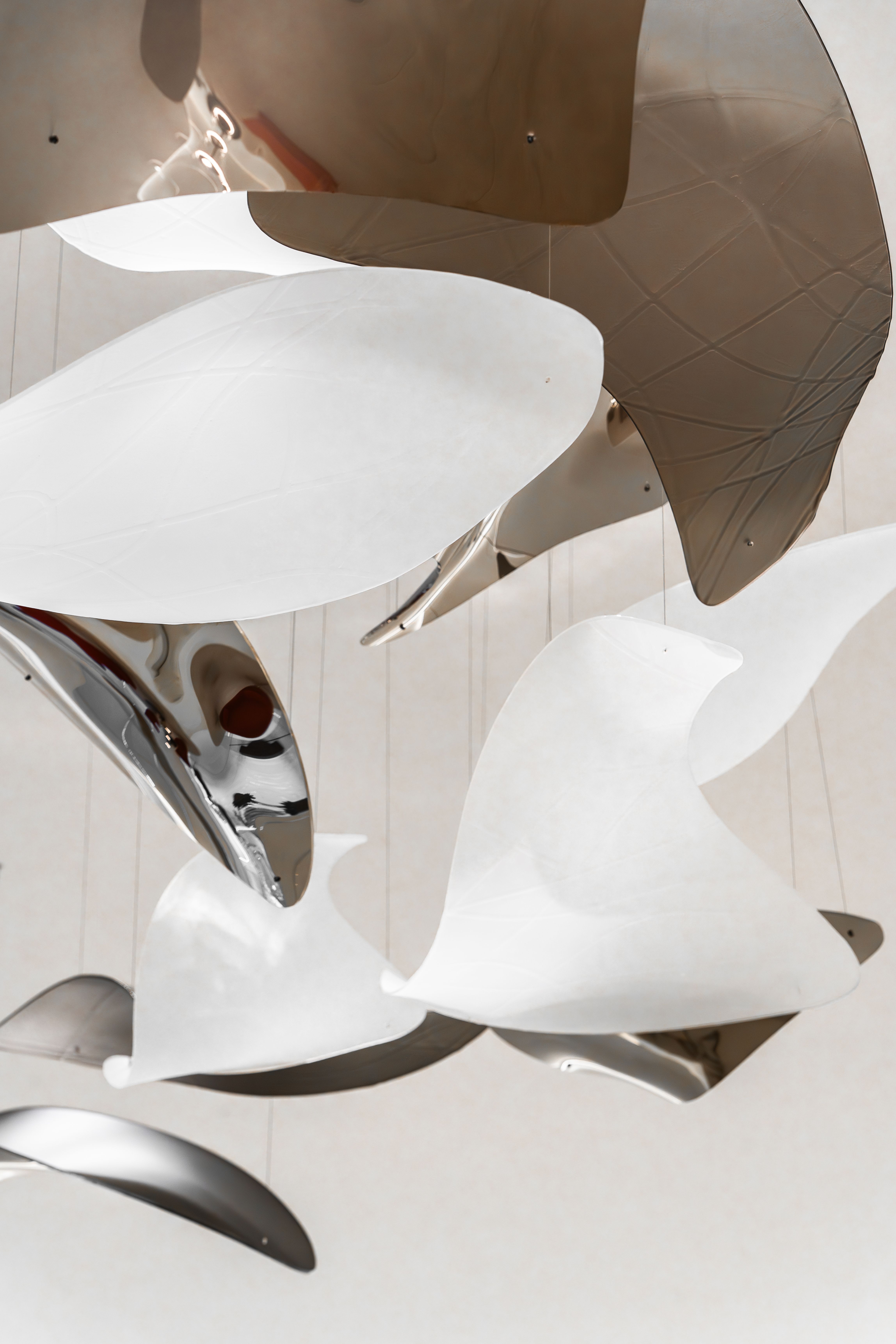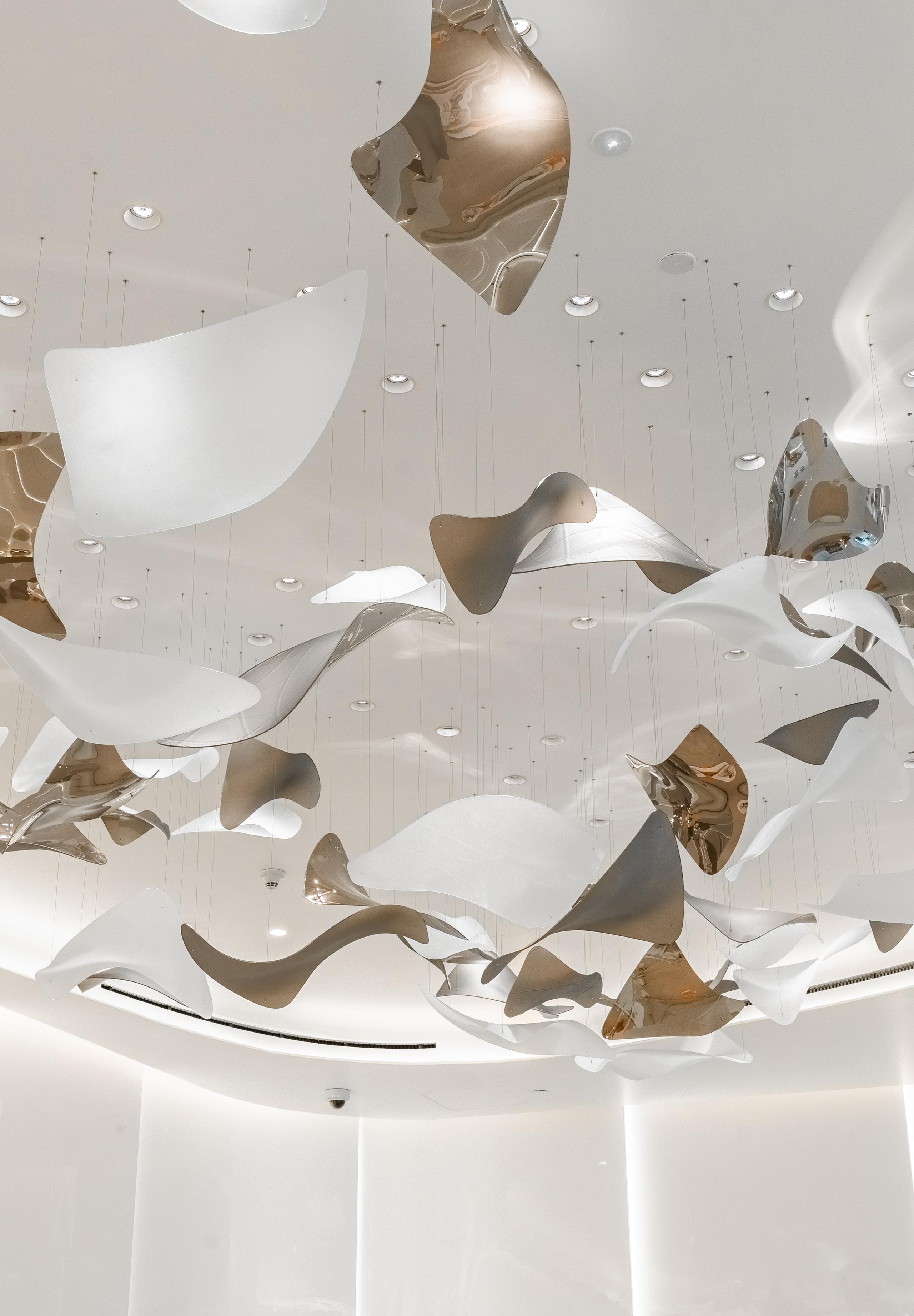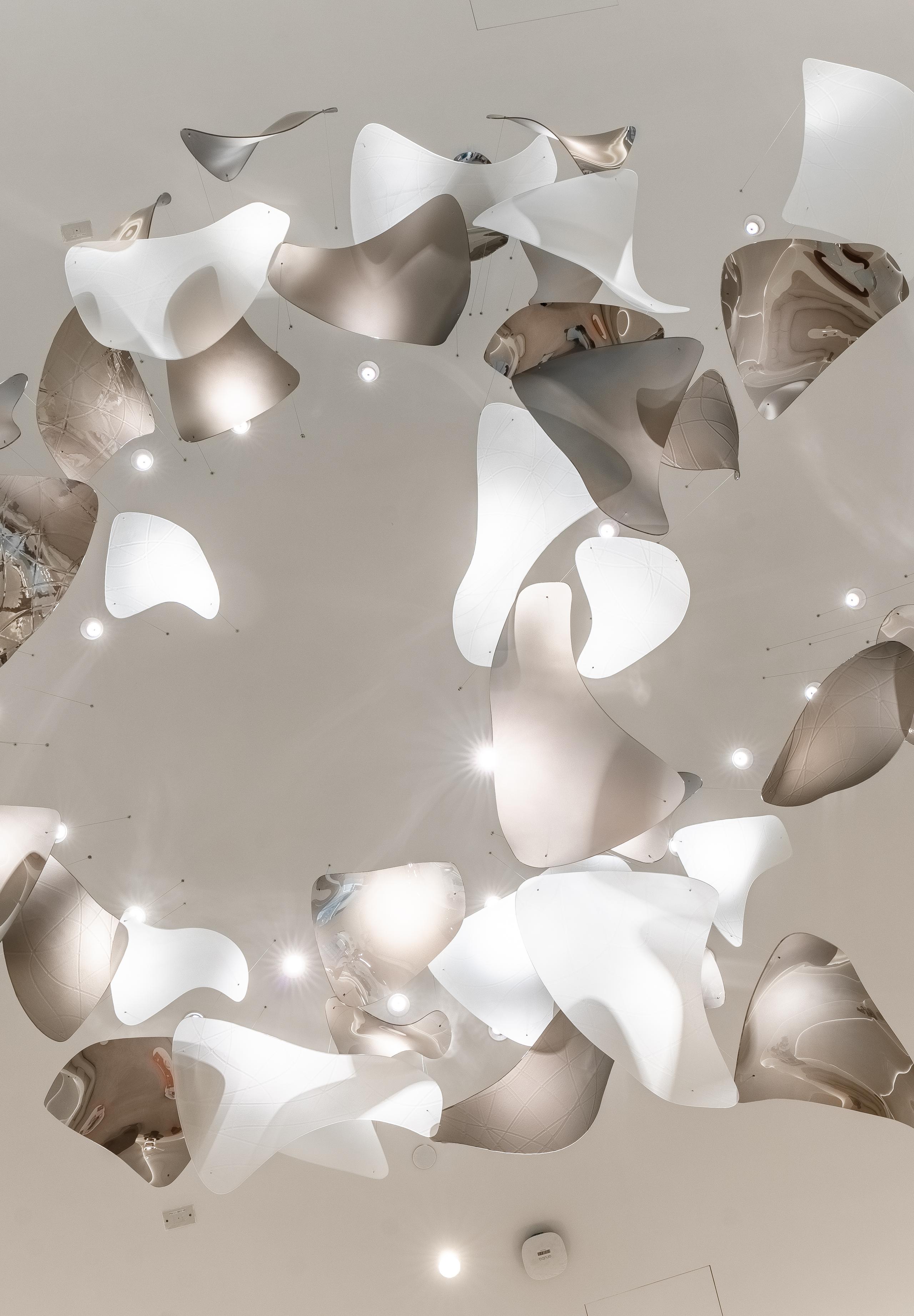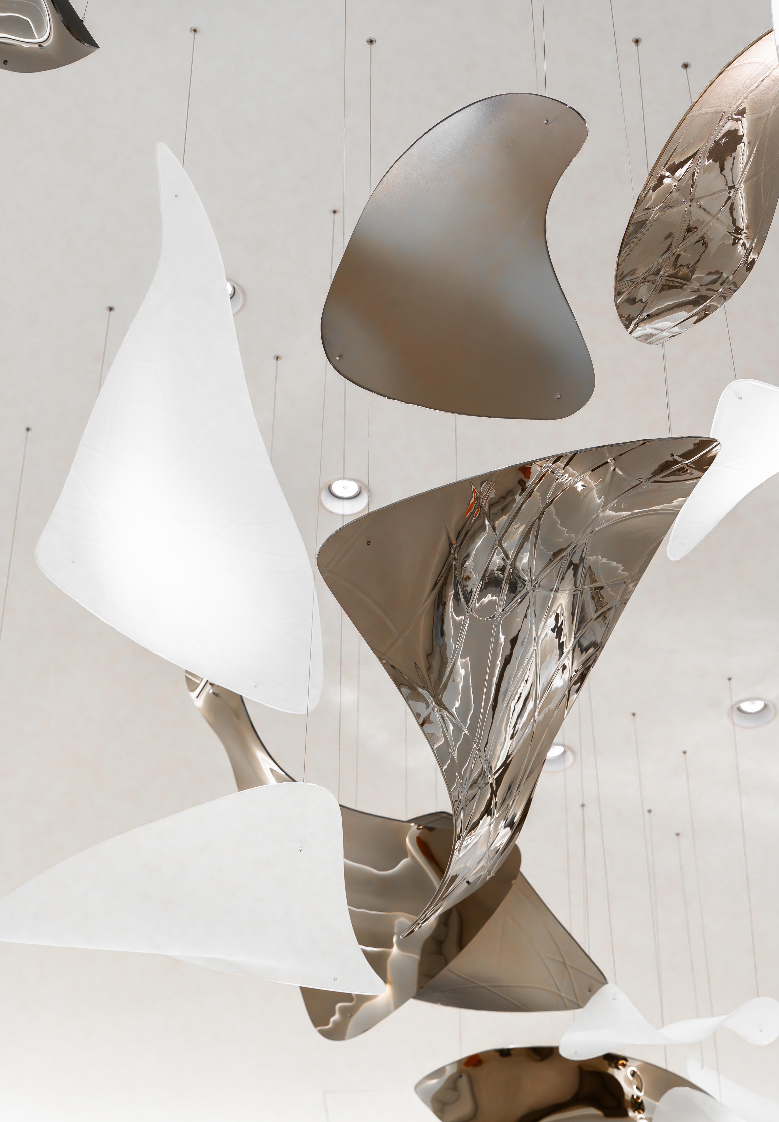 Collaborating closely with the design team, we adapted our Flux collection to echo the aerodynamic curves of airplane wings in motion. The resulting bespoke creation seamlessly integrates form and function, embodying the elegance of flight and bringing an airy sense of modernity to the VIP lounges.