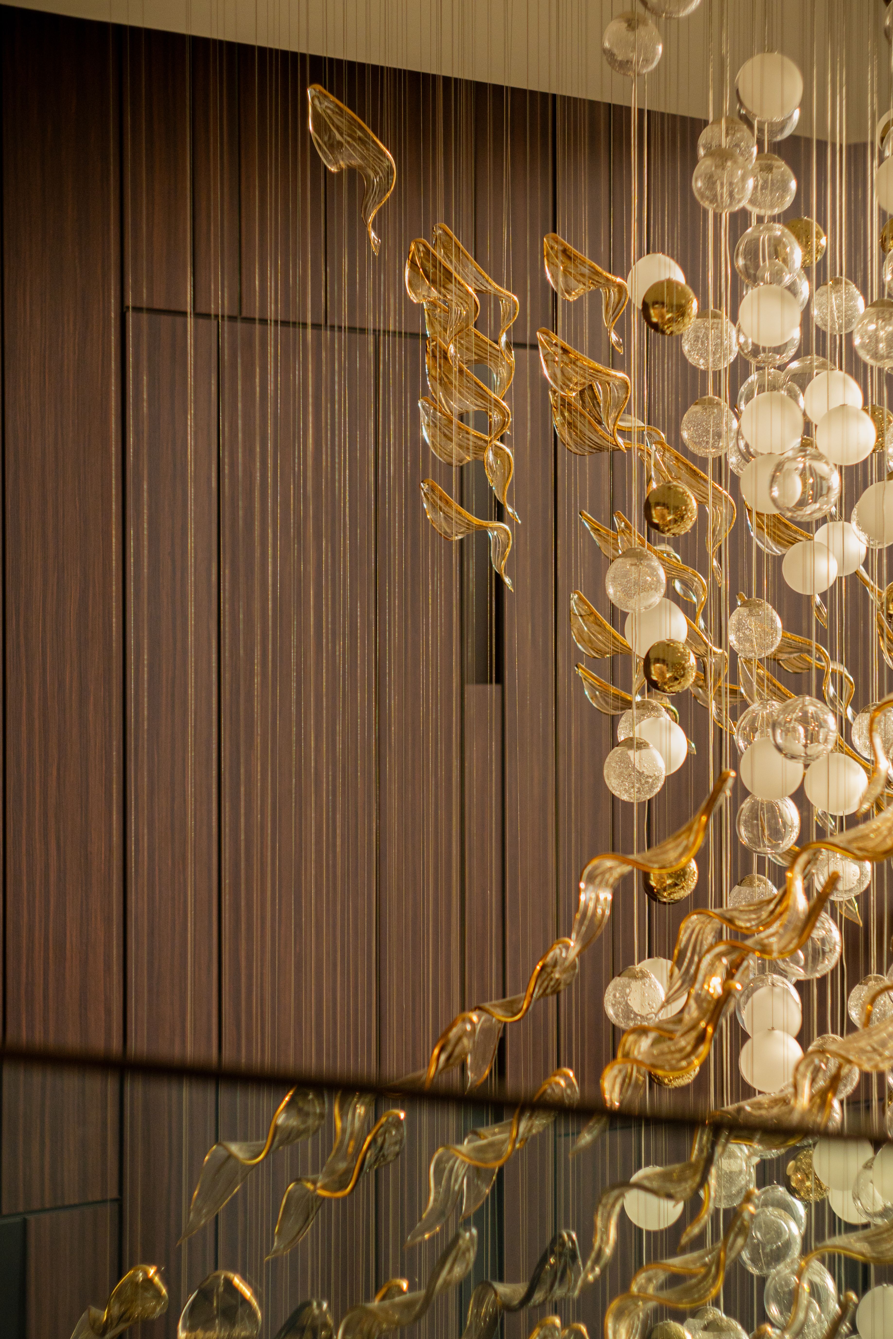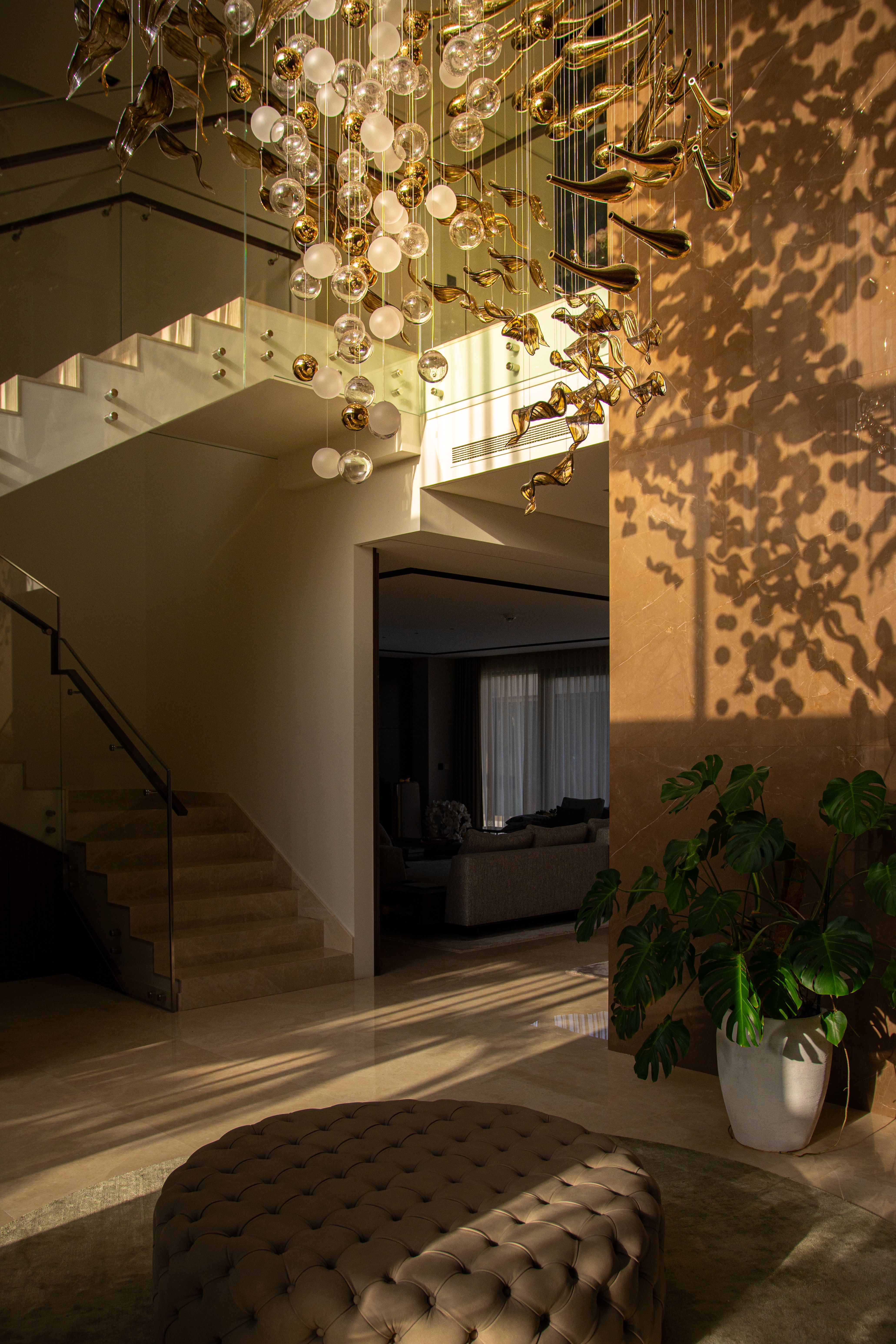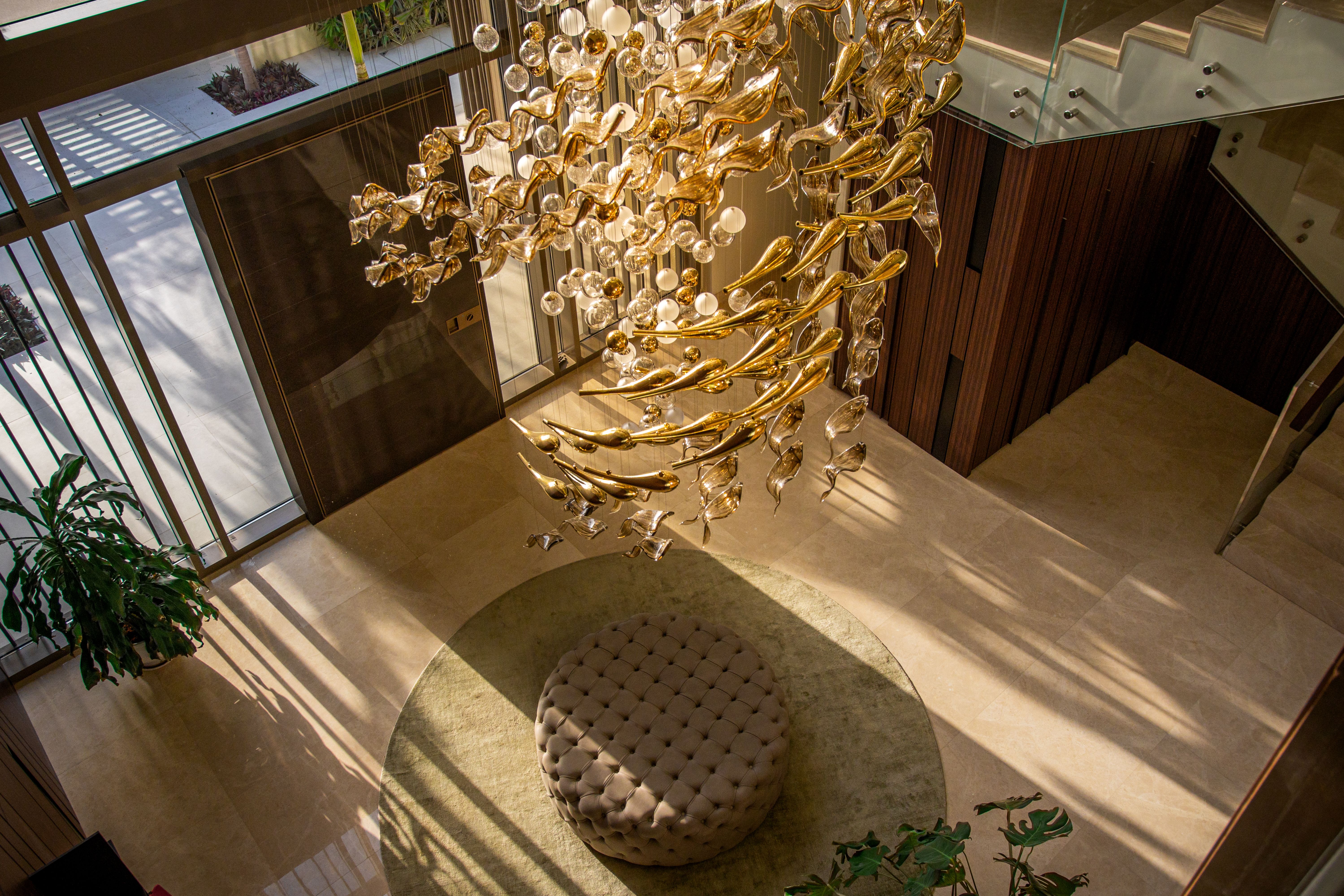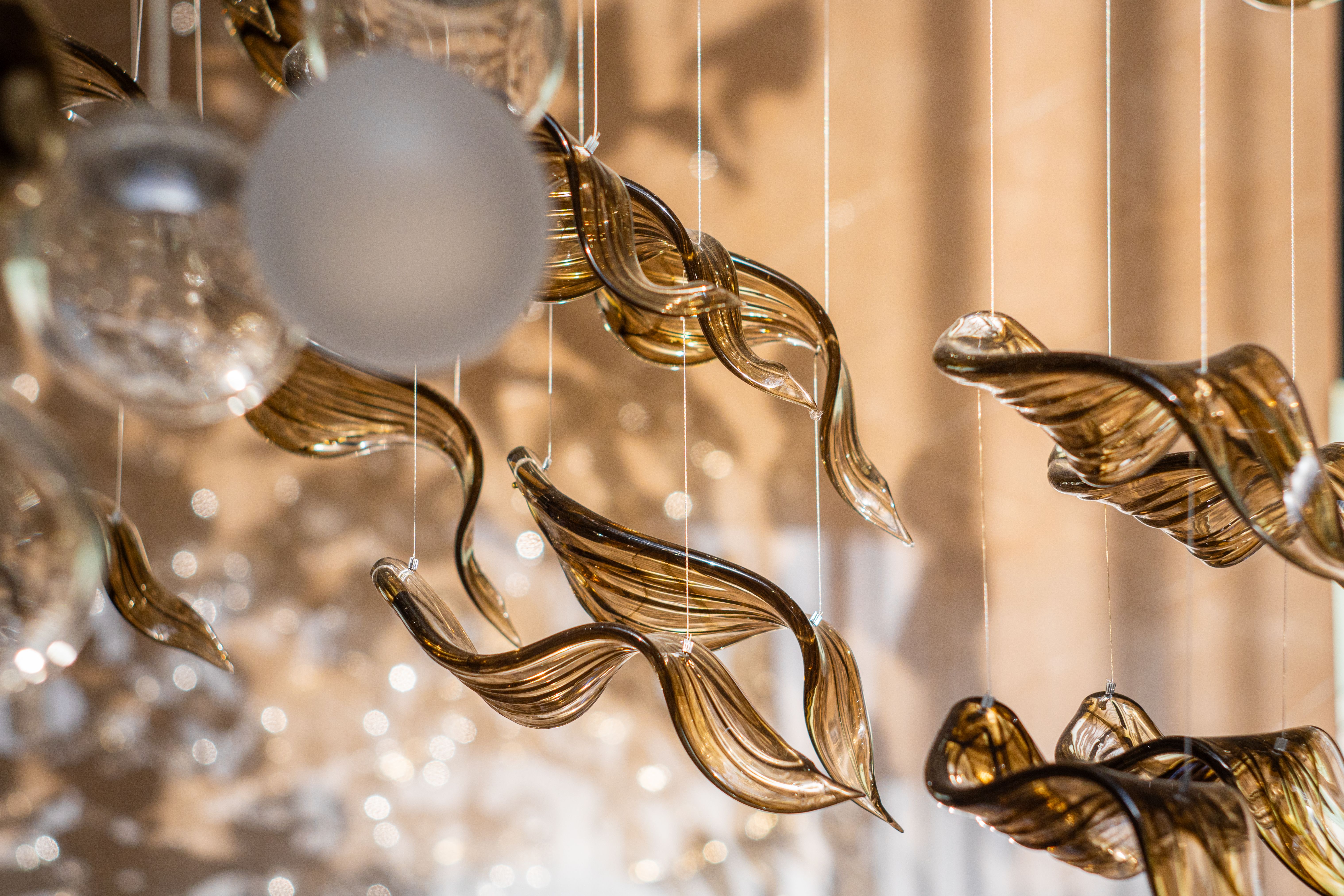 At the heart of the double-height entrance stands a bespoke five-metre Sans Souci installation. Composed of handblown glass in clear, opal, and tobacco-misted finishes, and complemented by components enhanced with golden nanocoating, it forms a dynamic centrepiece that transforms throughout the day. As natural and ambient light shift, the installation reveals subtle changes in tone, depth, and reflection – adding an unmistakable sense of movement and character to the interior.
