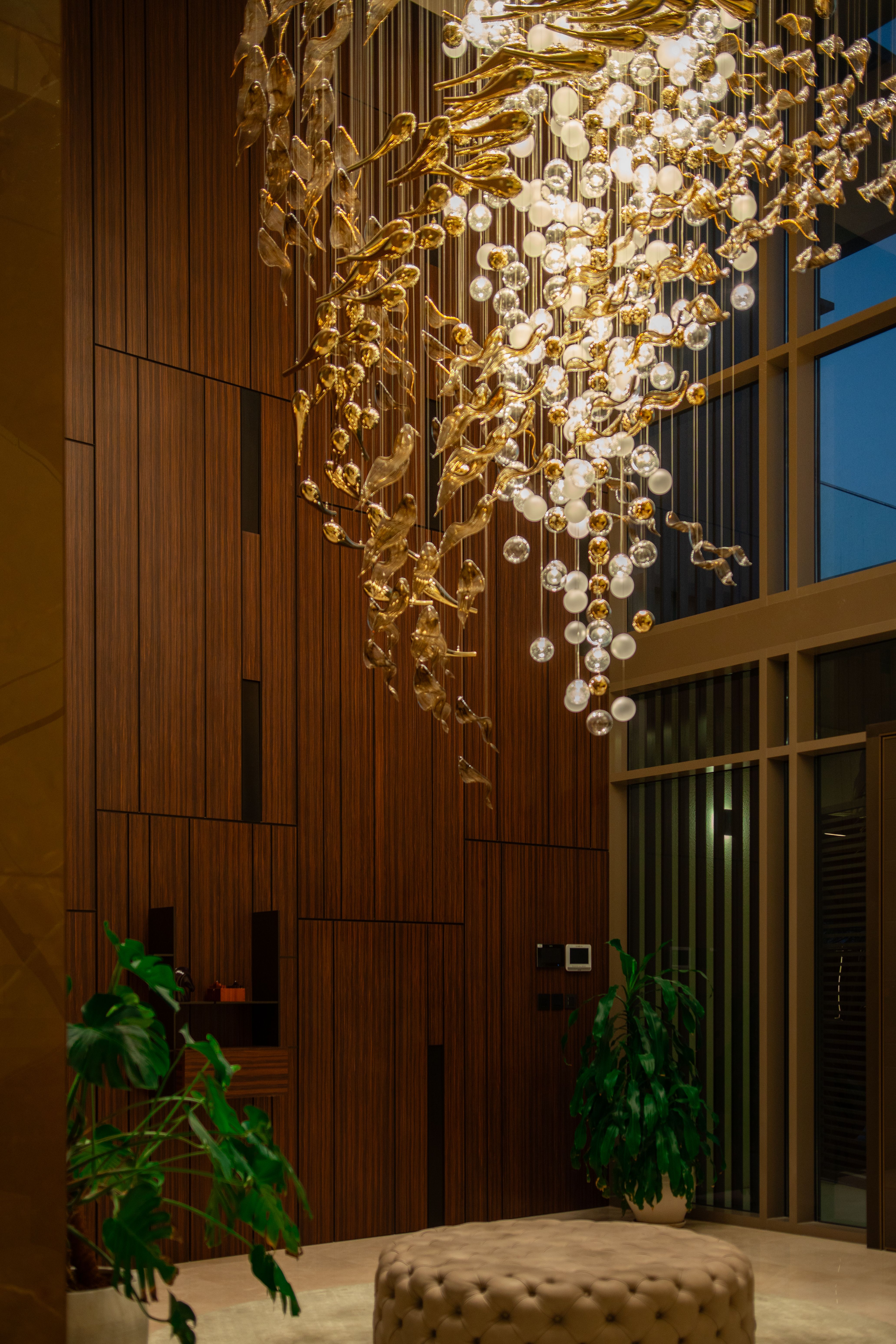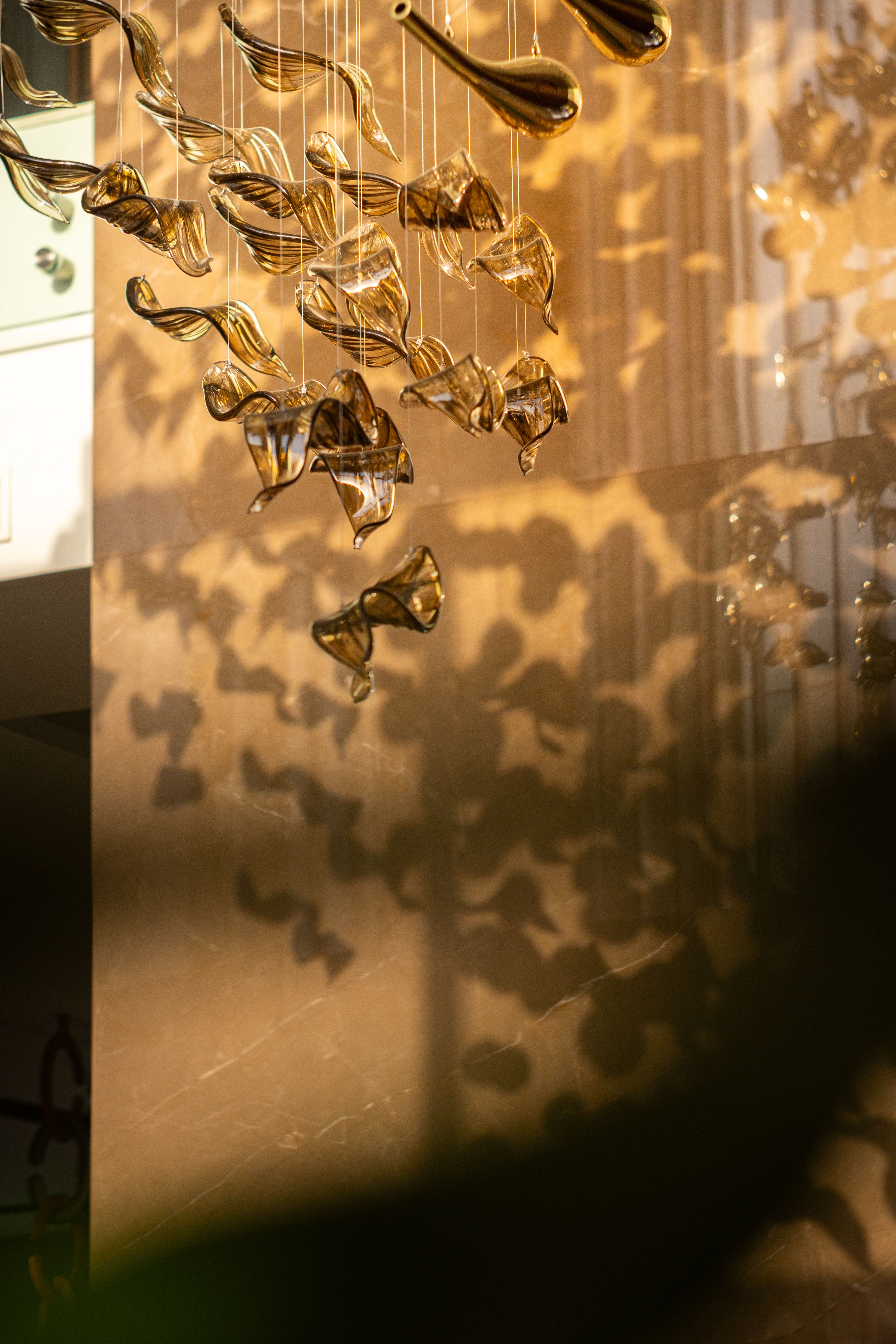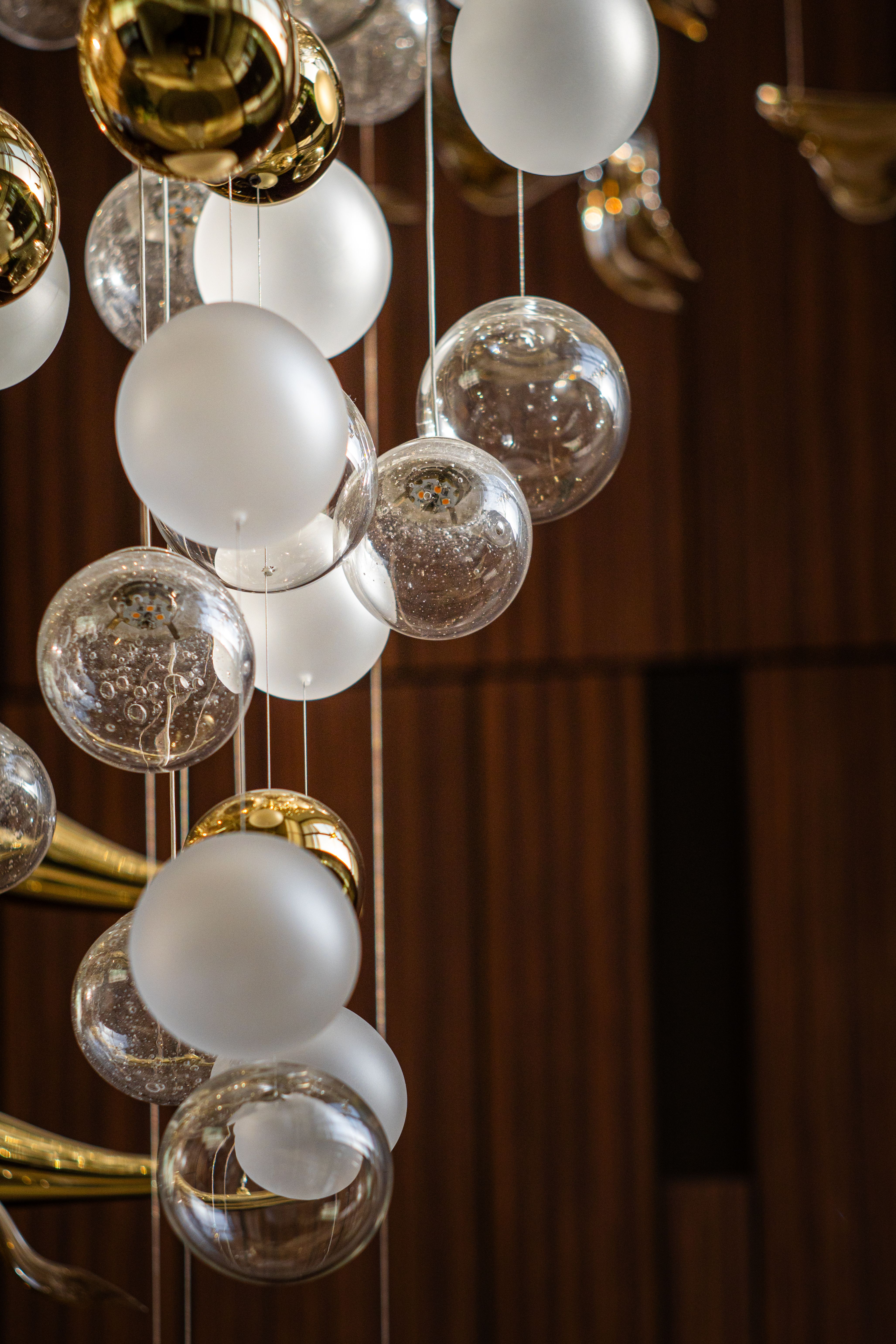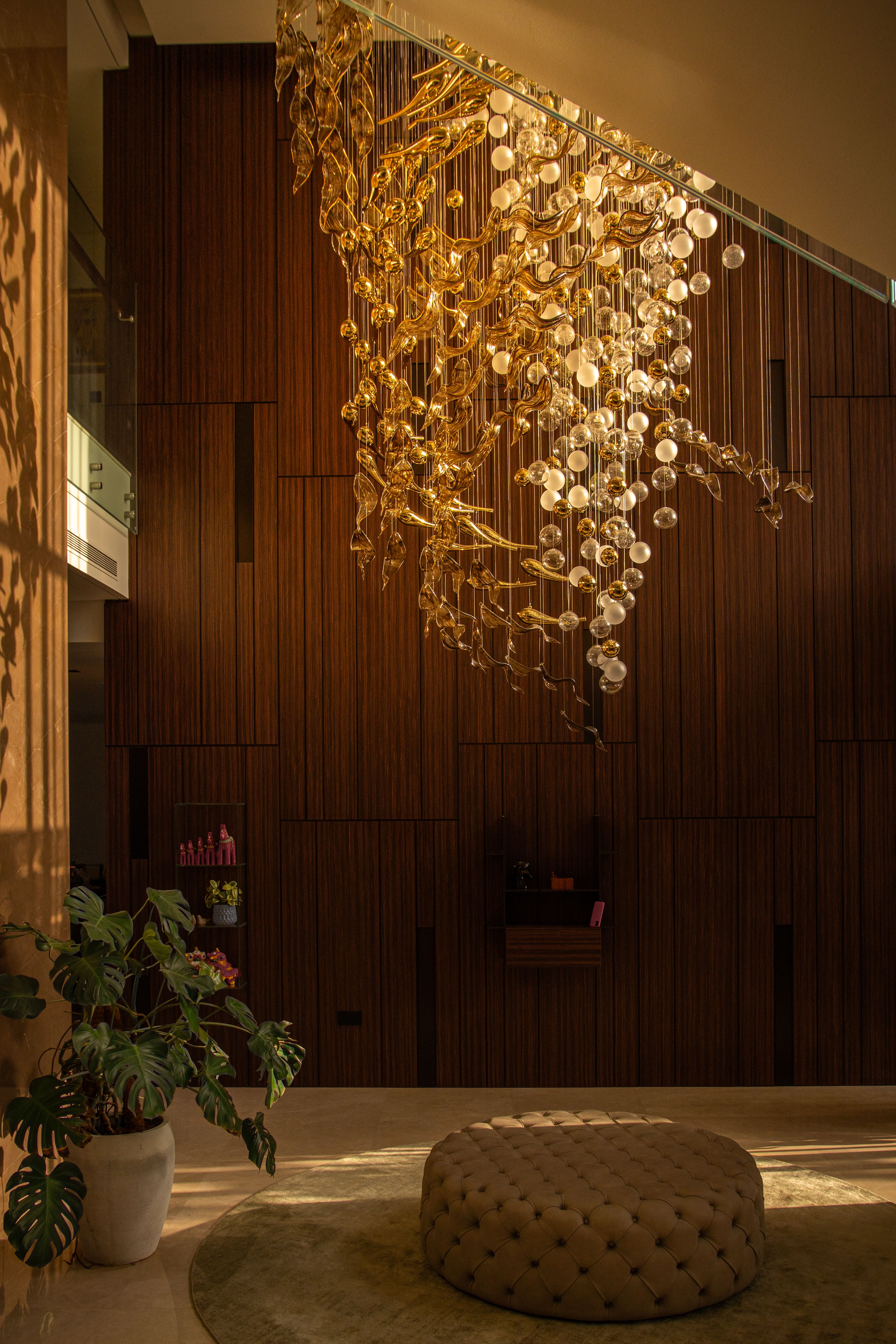 At the heart of the double-height entrance stands a bespoke five-metre Sans Souci installation. Composed of handblown glass in clear, opal, and tobacco-misted finishes, and complemented by components enhanced with golden nanocoating, it forms a dynamic centrepiece that transforms throughout the day. As natural and ambient light shift, the installation reveals subtle changes in tone, depth, and reflection – adding an unmistakable sense of movement and character to the interior.