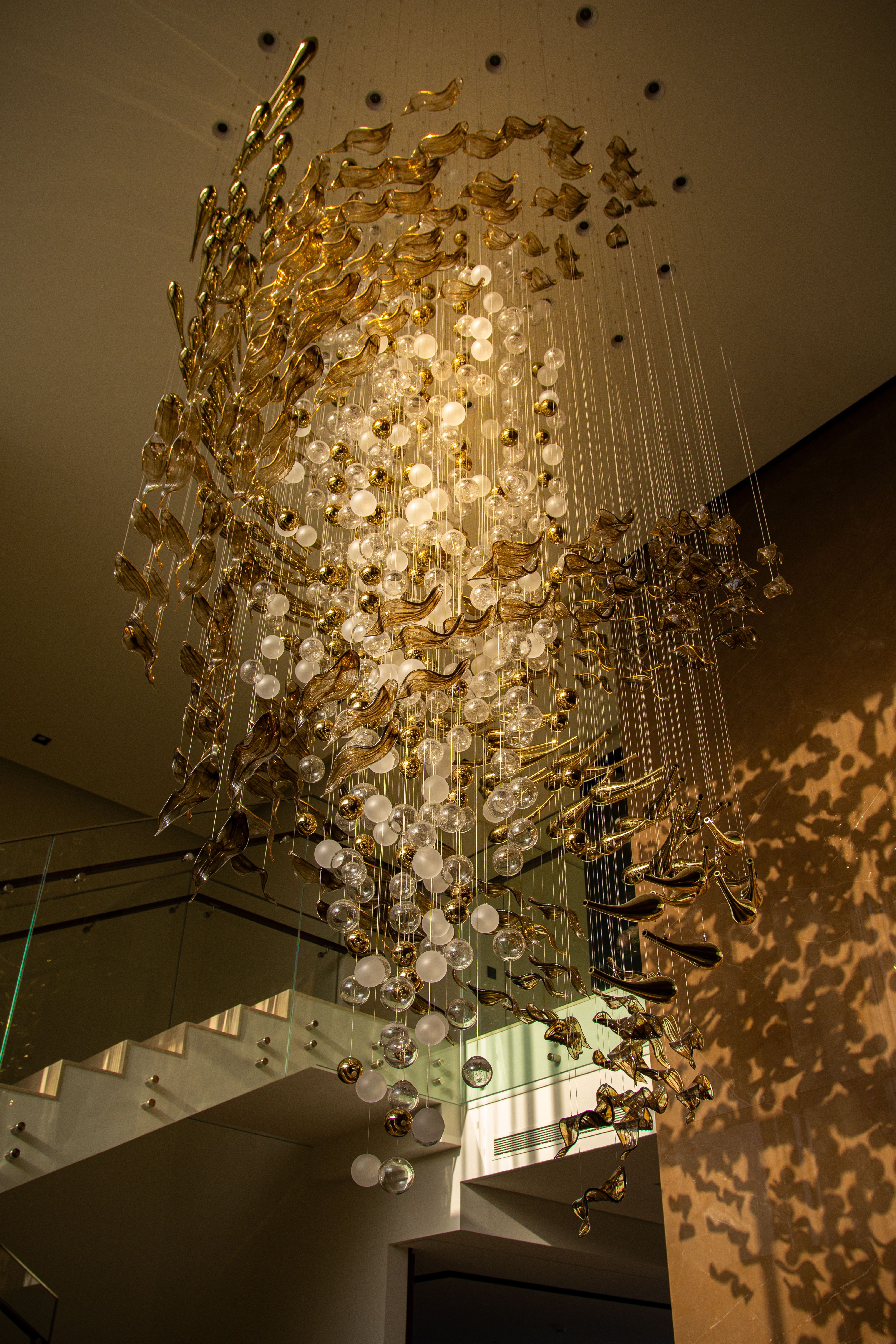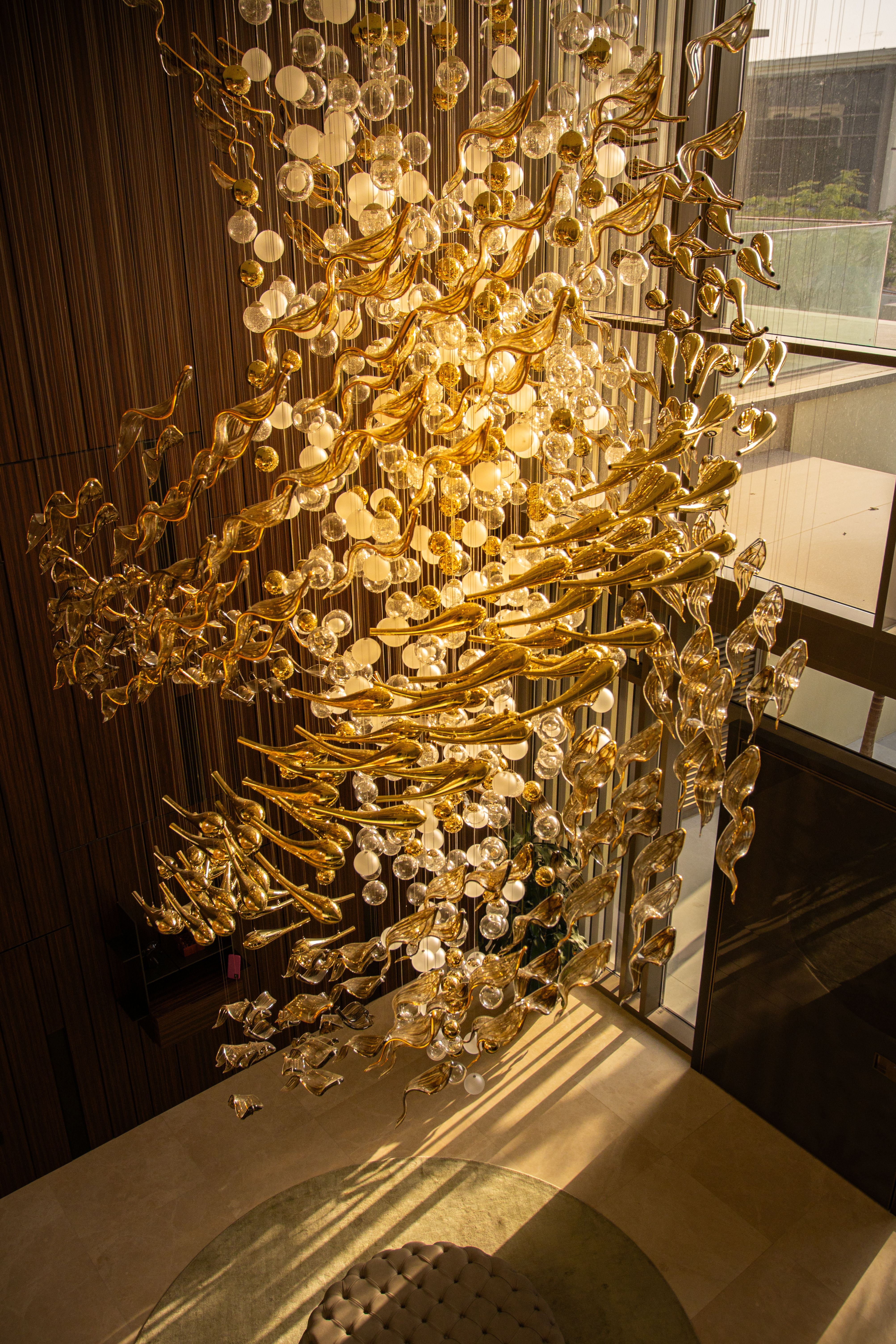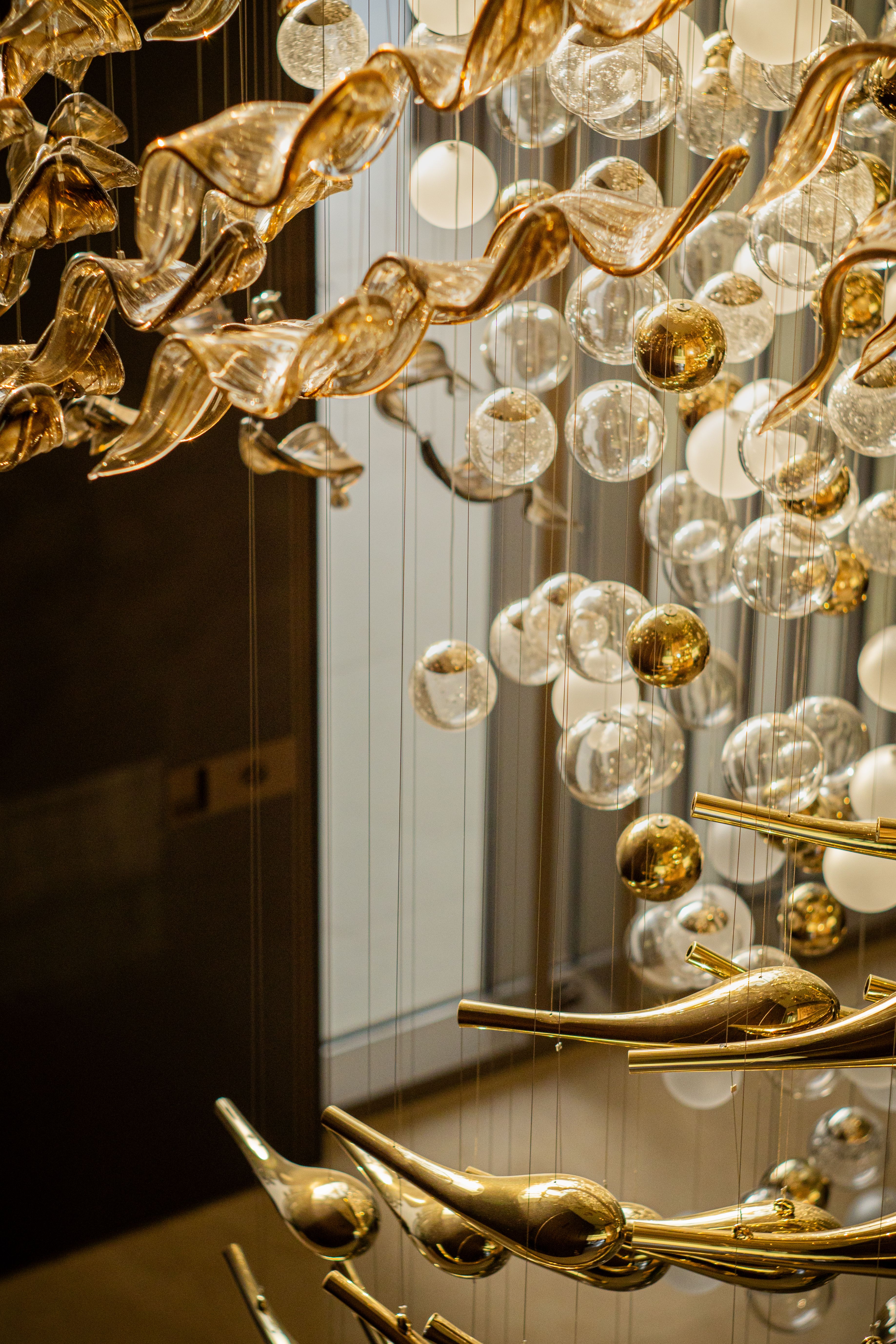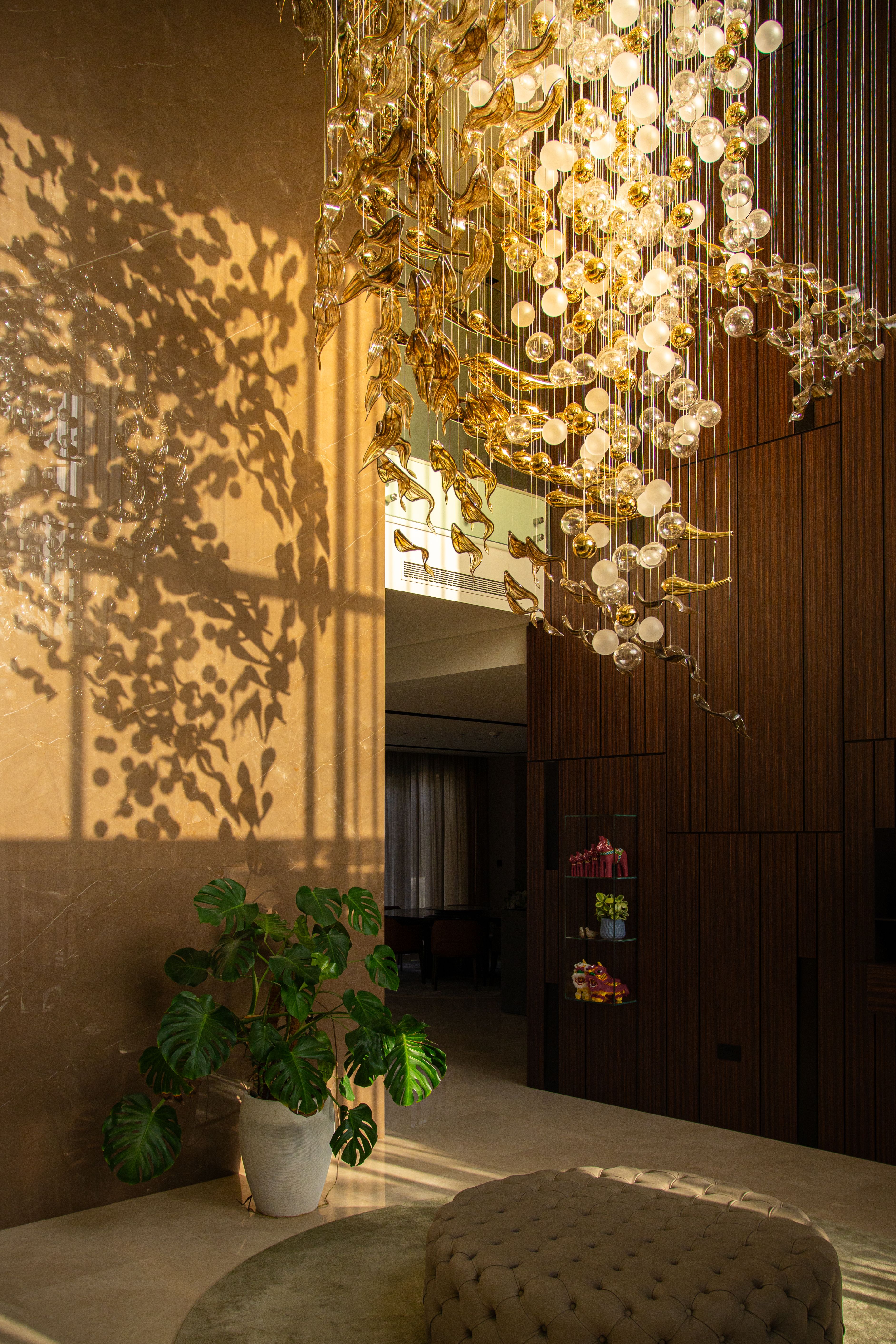 At the heart of the double-height entrance stands a bespoke five-metre Sans Souci installation. Composed of handblown glass in clear, opal, and tobacco-misted finishes, and complemented by components enhanced with golden nanocoating, it forms a dynamic centrepiece that transforms throughout the day. As natural and ambient light shift, the installation reveals subtle changes in tone, depth, and reflection – adding an unmistakable sense of movement and character to the interior.