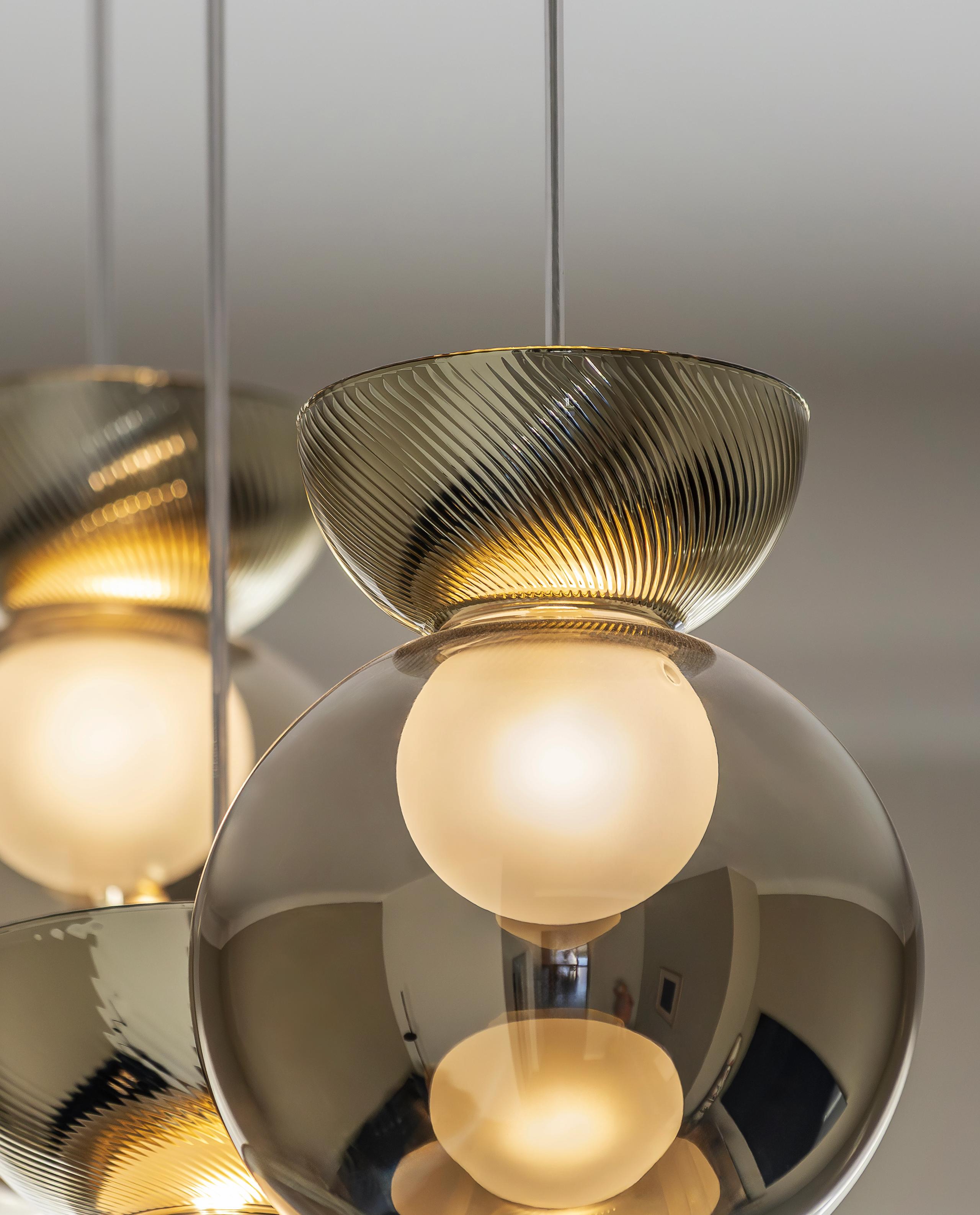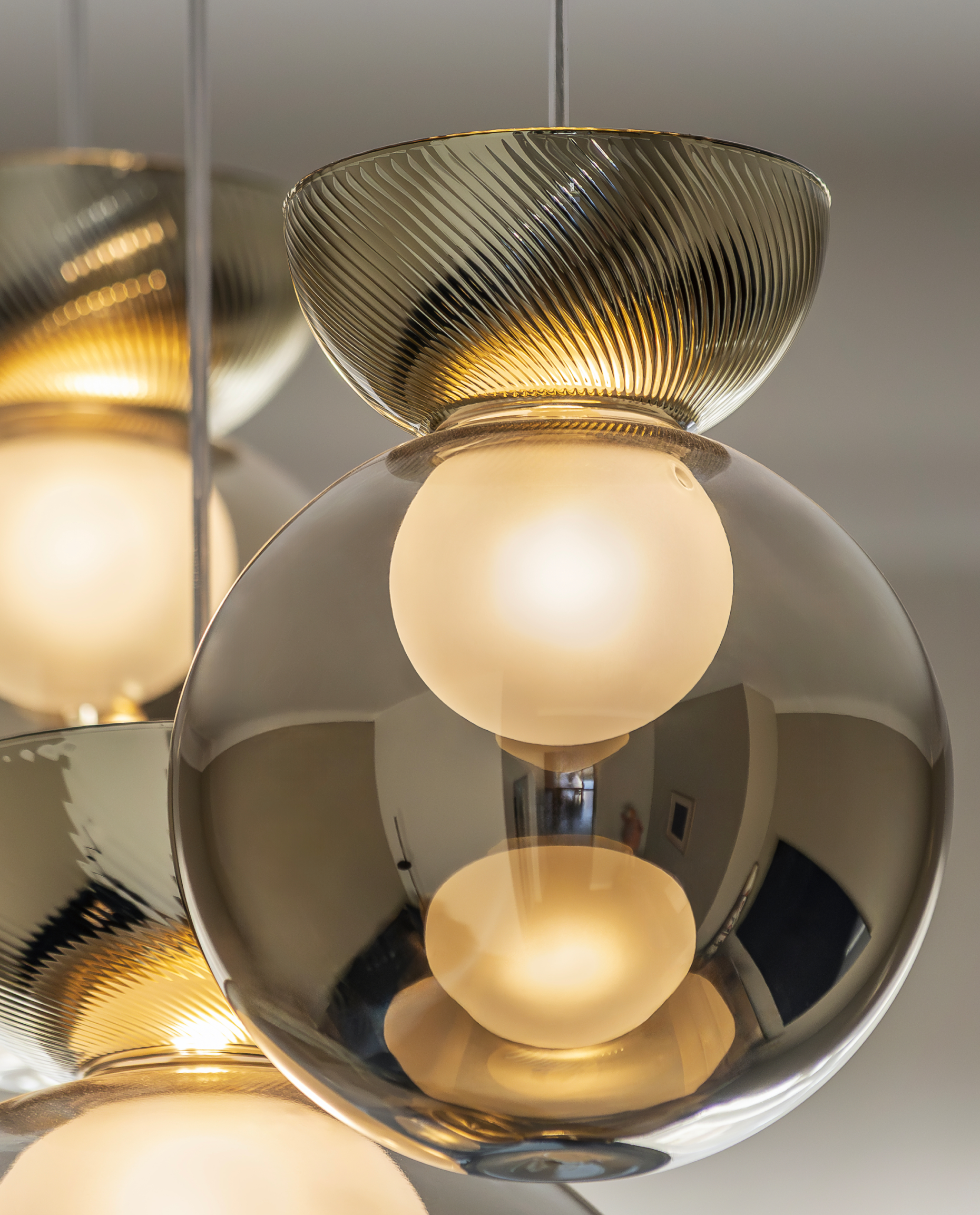 In the living and circulation areas, our Charm pendants form the heart of the interior. These exquisitely crafted glass orbs, with their reflective nanocoated elements, symbolise planets in space – mirroring the celestial interplay of sun and moon, light and shadow, in a design that subtly echoes the owner’s passion for the satellite industry.