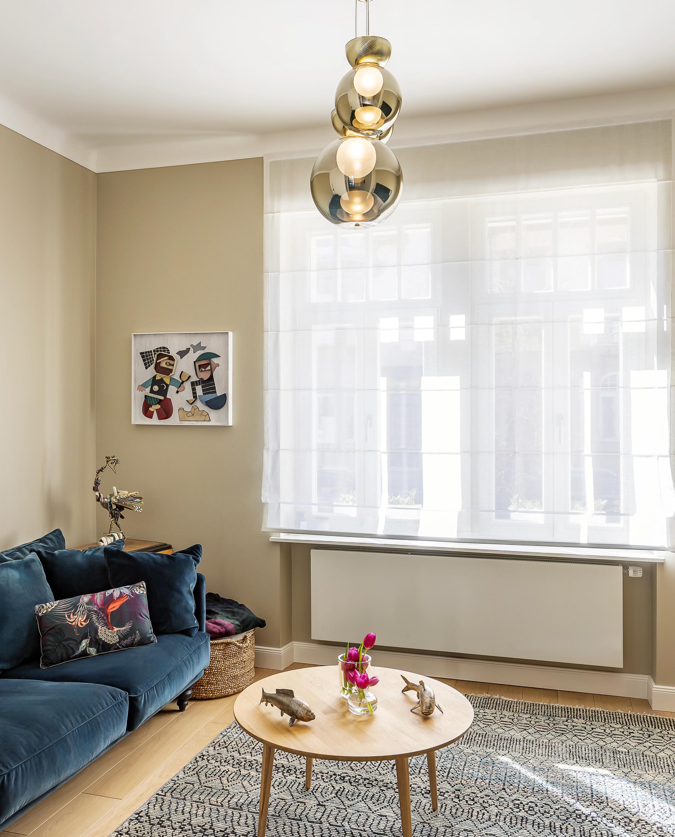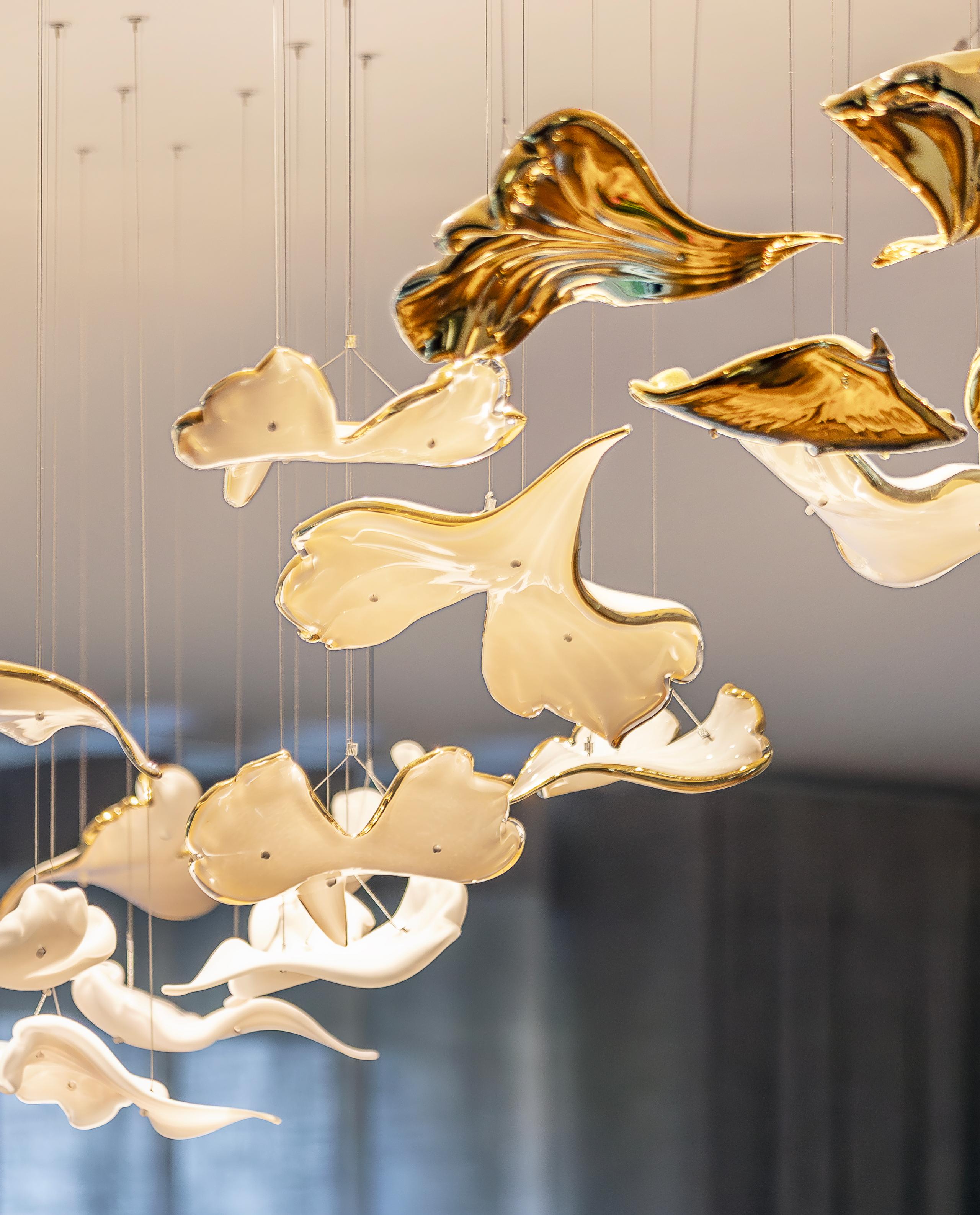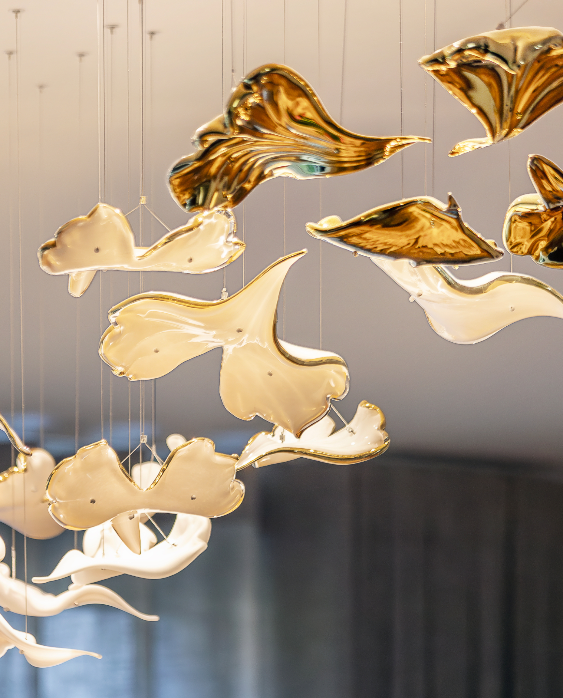 At the kitchen entrance, a bespoke composition designed by Eliška Luhanová unfurls like gilded leaves caught mid-air. Handblown glass components finished in opal and aurum nanocoating cast a warm shimmer and diffused glow. Inspired by the Ginkgo Biloba tree standing in front of the residence, the installation creates a dialogue between the indoor and outdoor spaces.