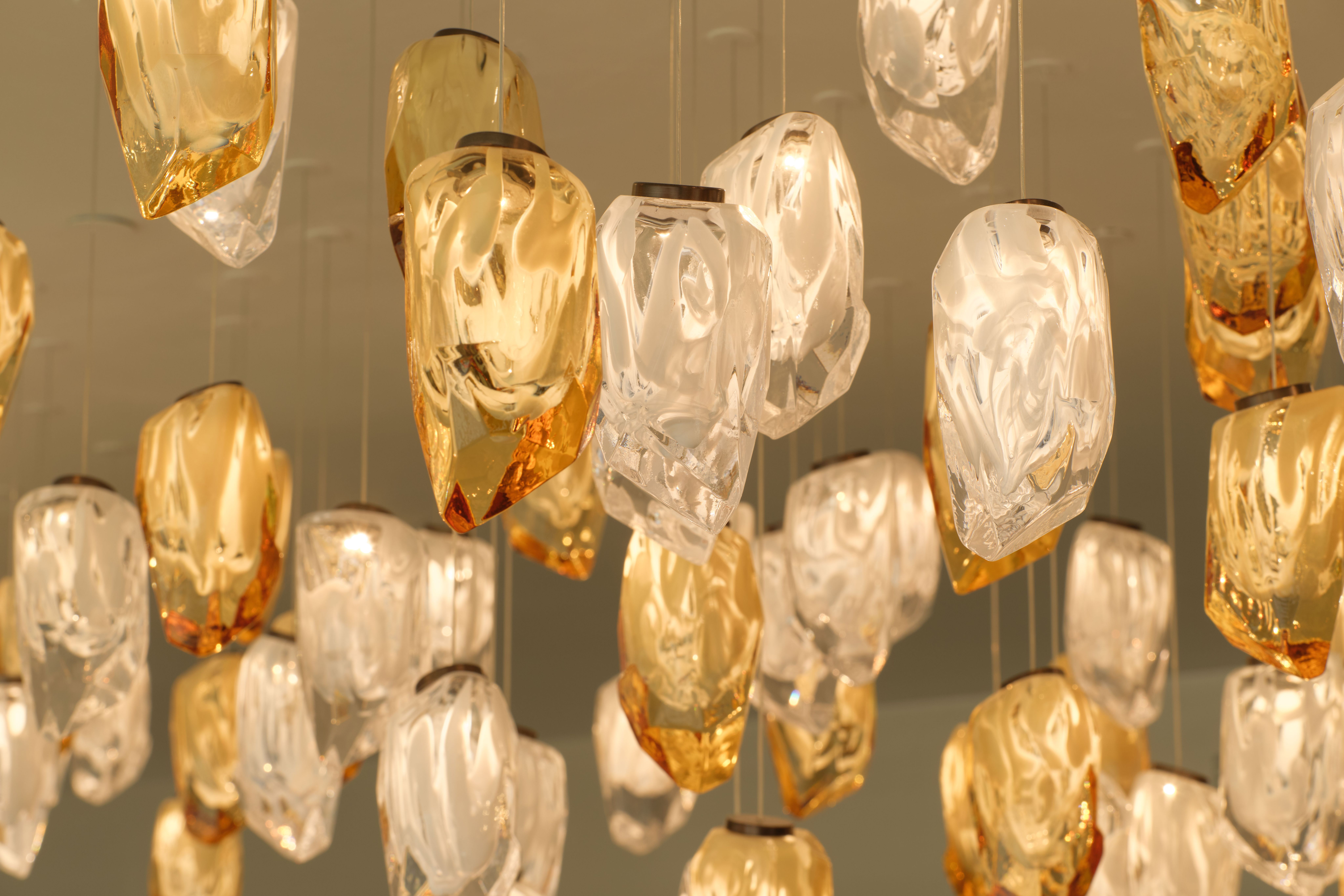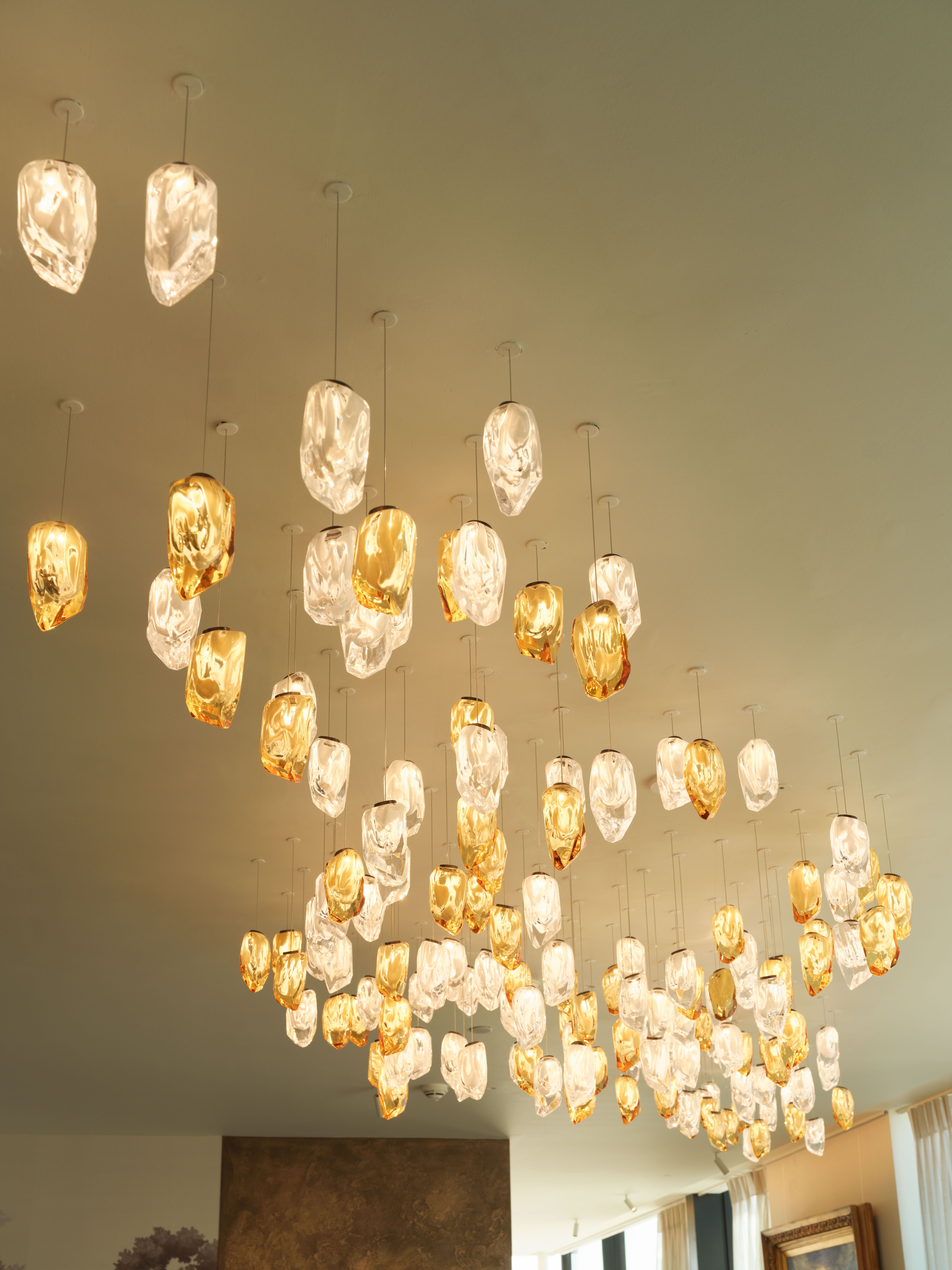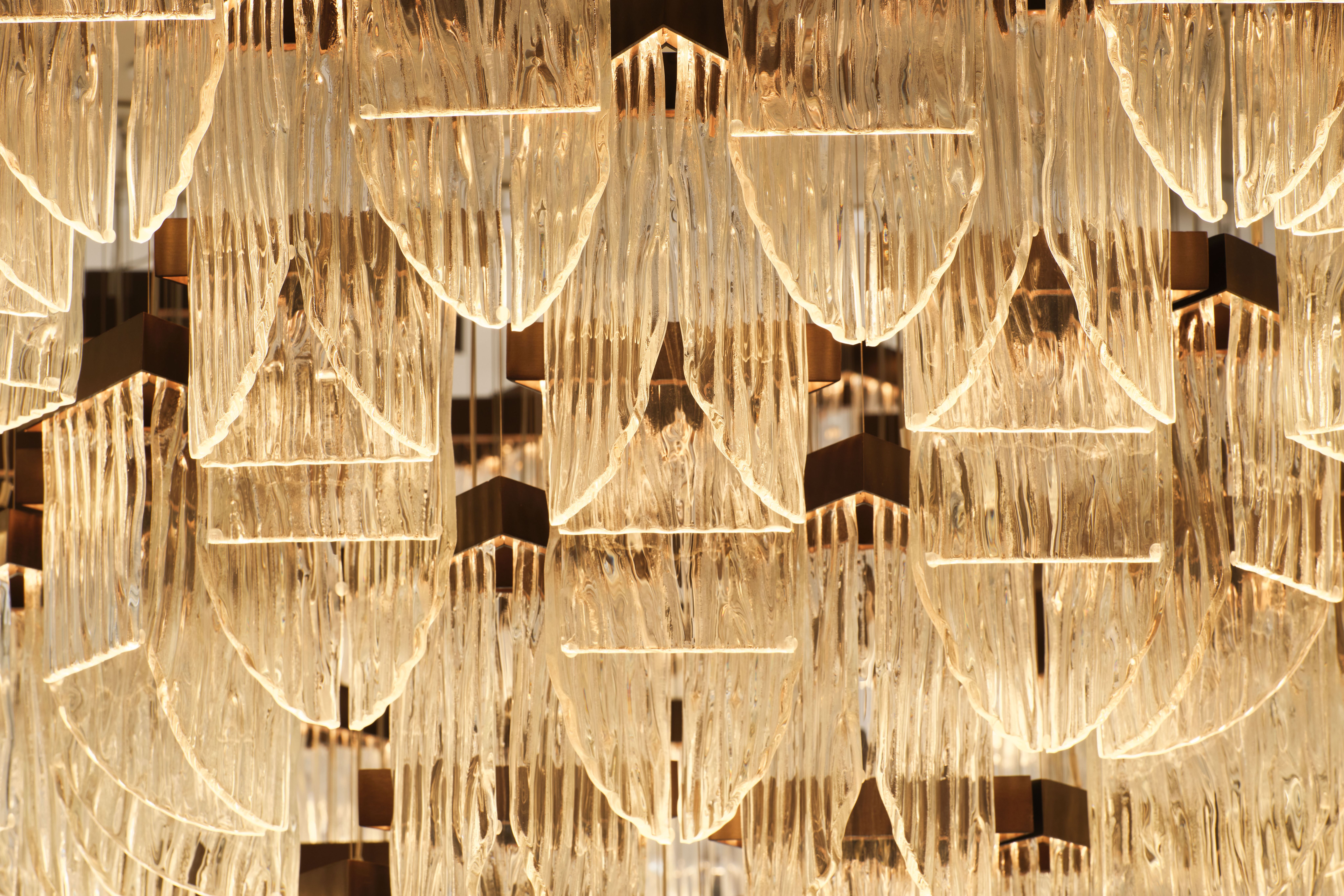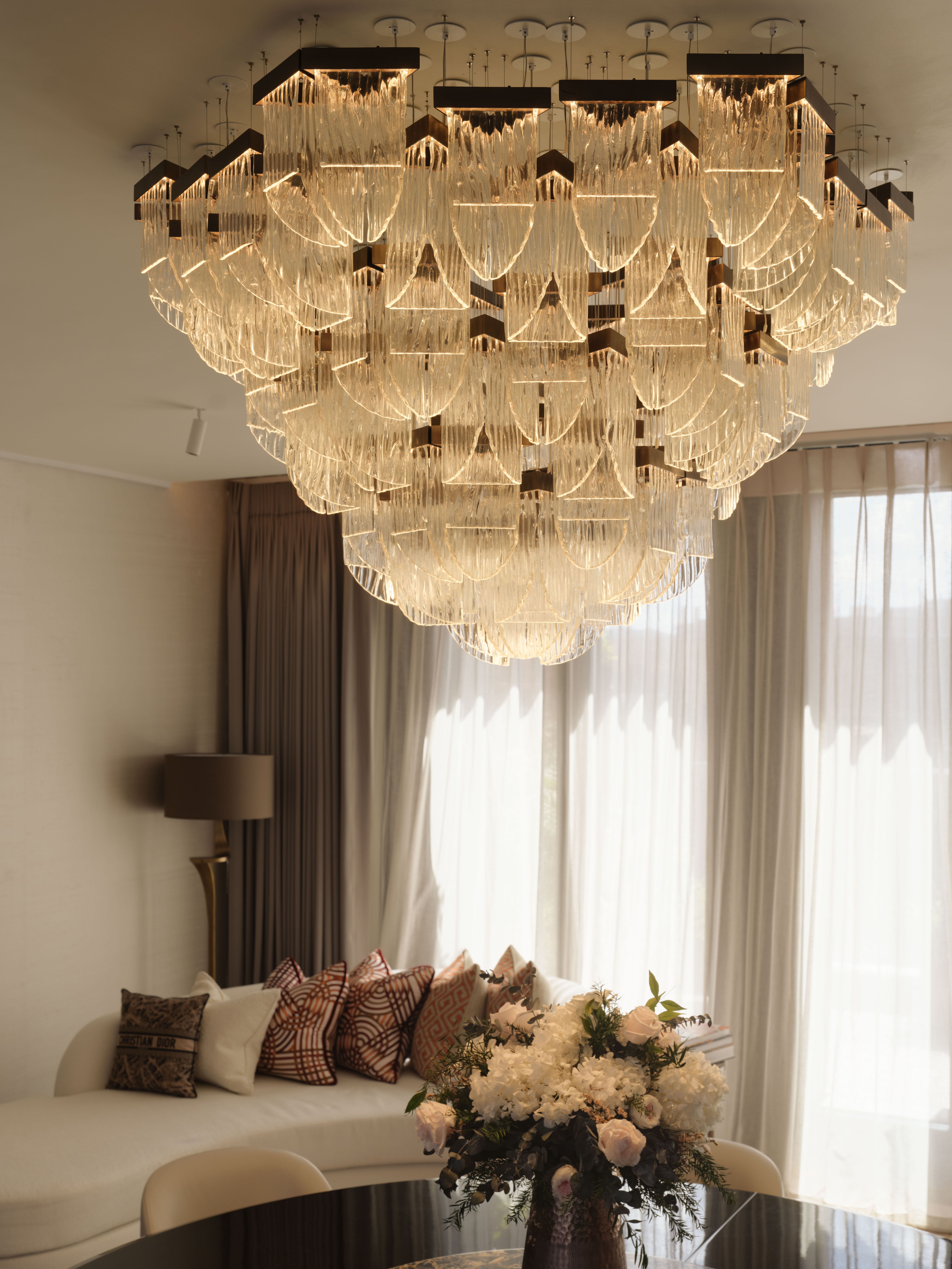 The brief called for contemporary lighting with a strong sense of texture – pieces that would complement the architectural clarity of the space while adding artistic depth. For this project, we developed two signature chandeliers, each tailored to its unique setting yet unified by a refined design language.