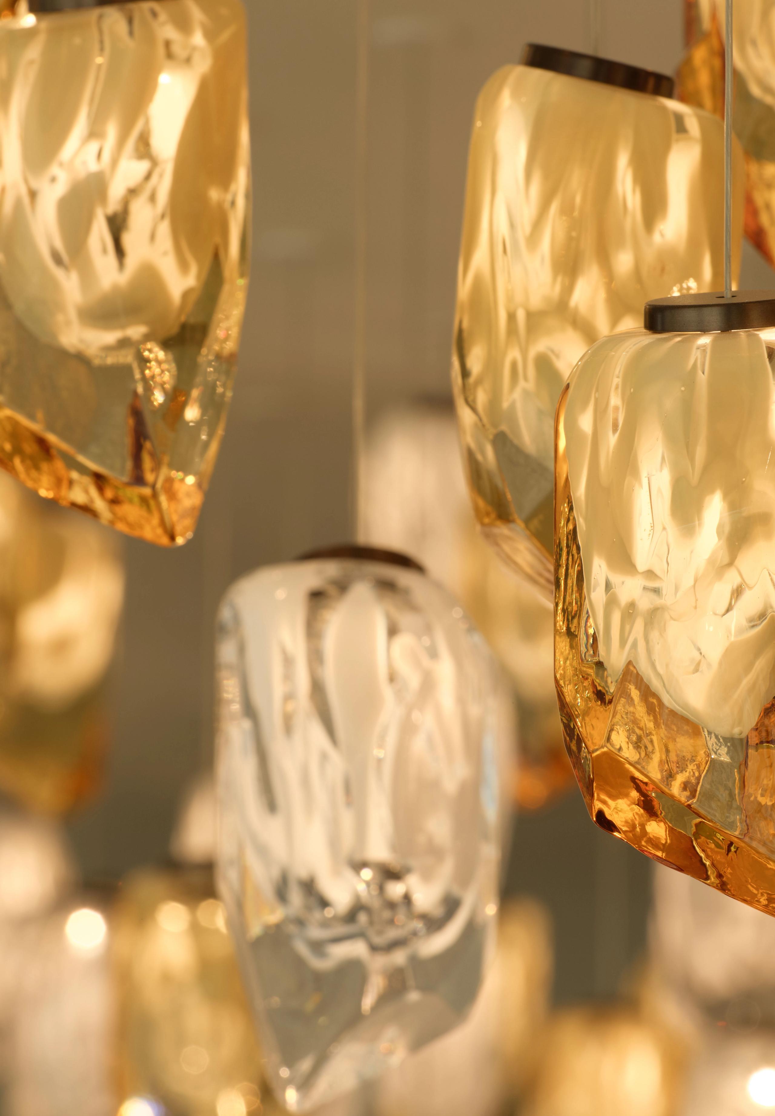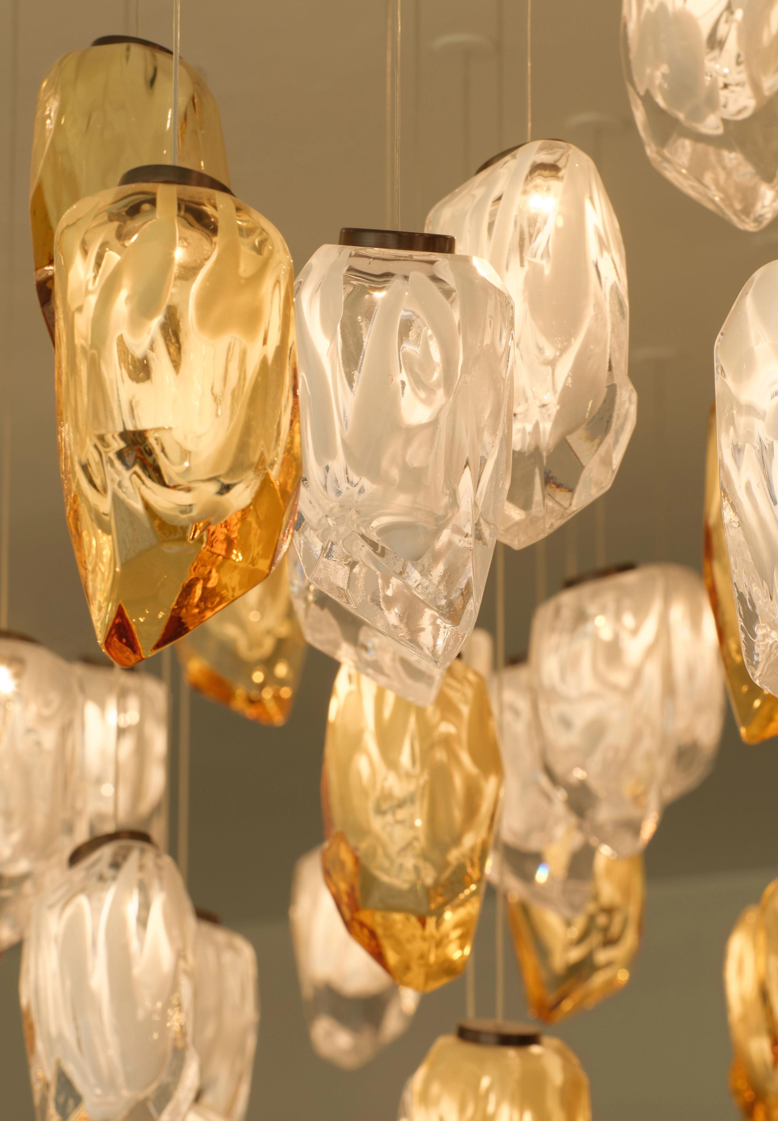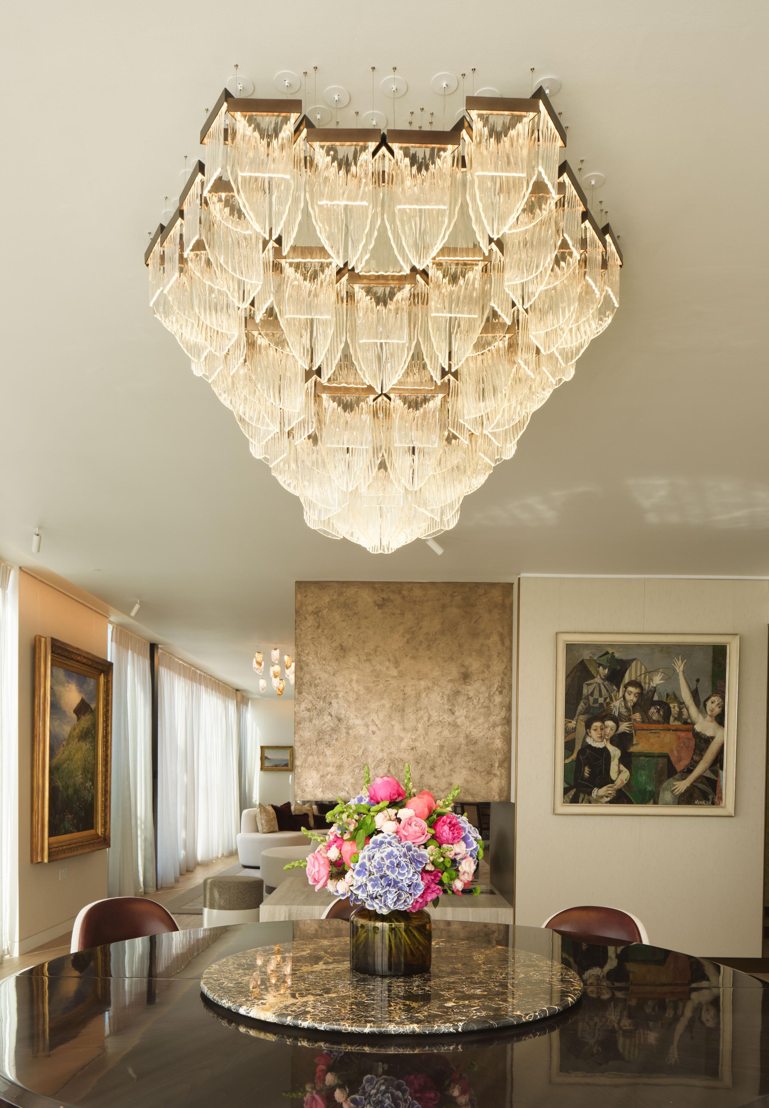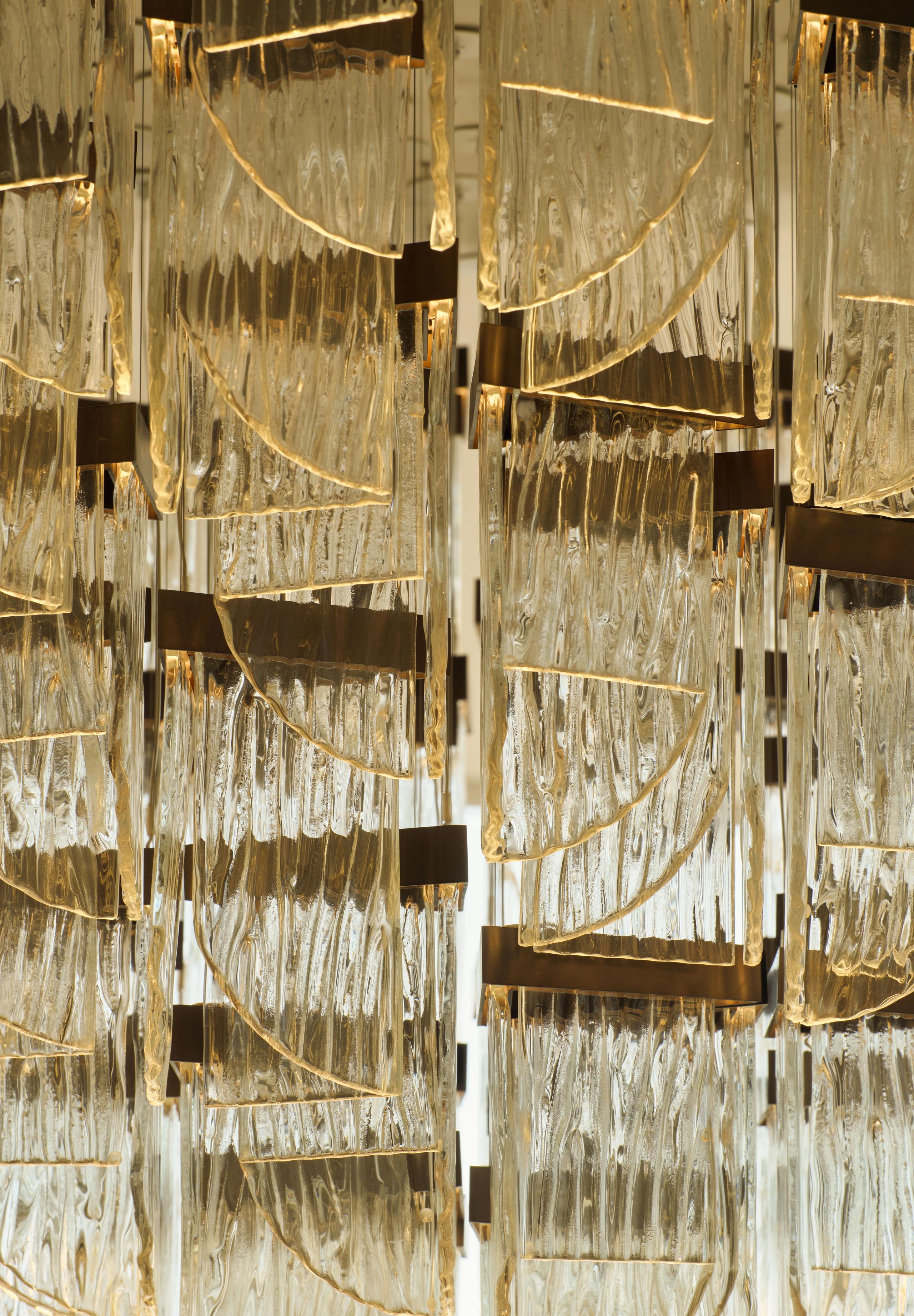 The brief called for contemporary lighting with a strong sense of texture – pieces that would complement the architectural clarity of the space while adding artistic depth. For this project, we developed two signature chandeliers, each tailored to its unique setting yet unified by a refined design language.