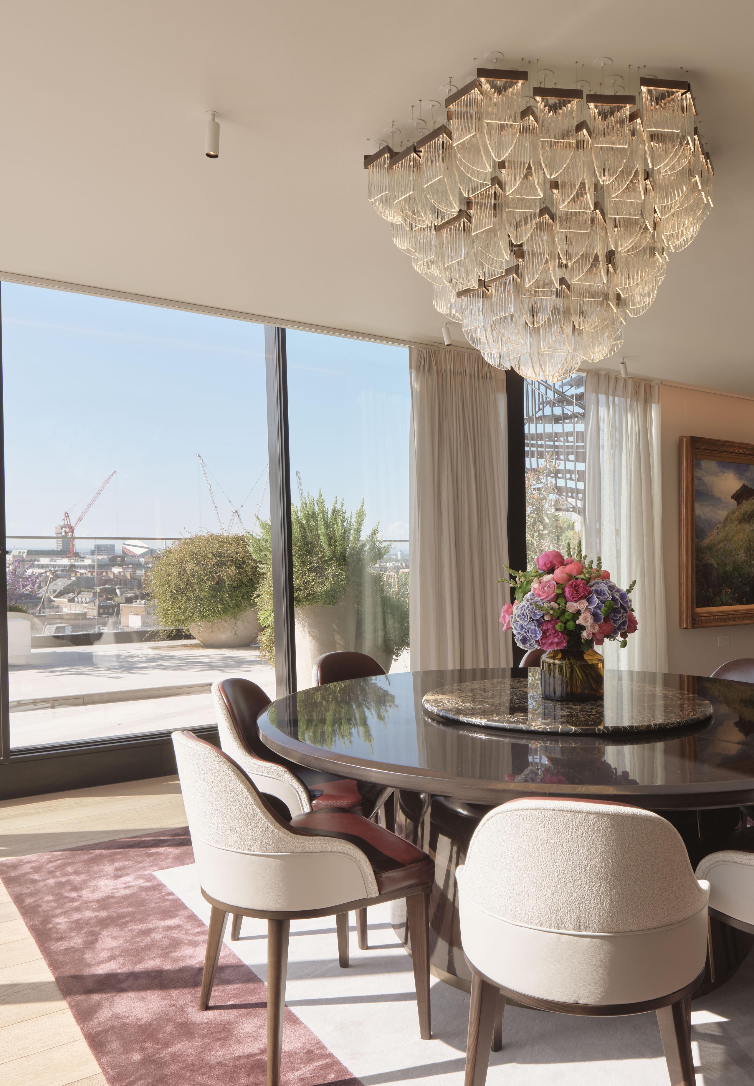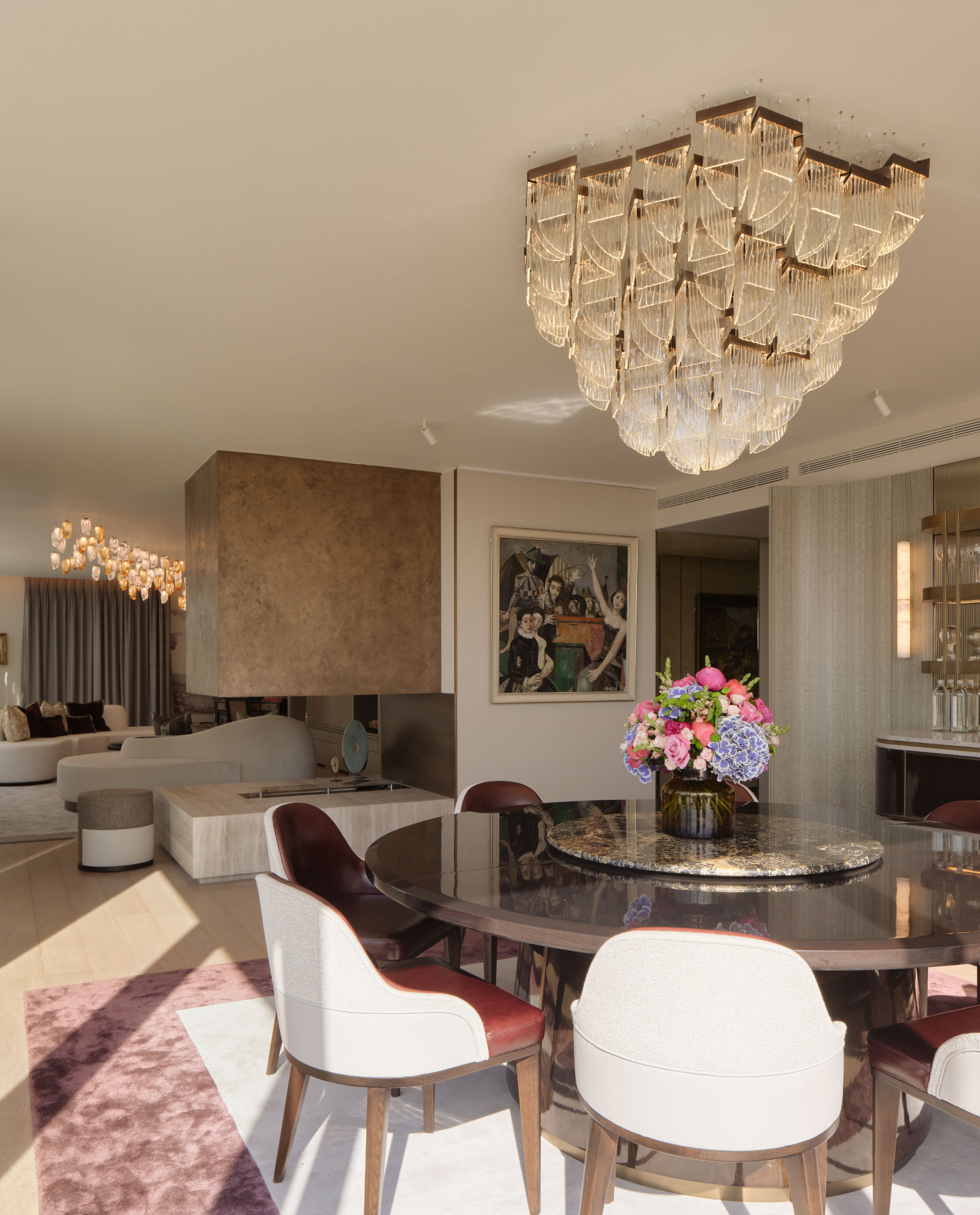 The interiors were brought to life by Studio Indigo, a London-based firm known for their sophisticated residential and yacht designs. Their vision introduced curvature and fluidity to balance the penthouse’s linear architecture – creating an immersive space where art, light, and material coexist in harmony.