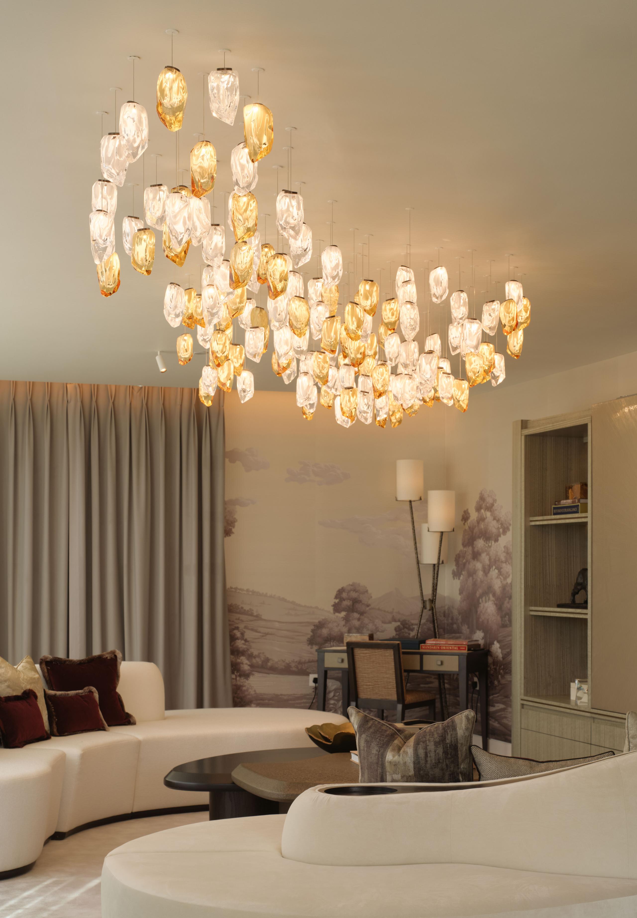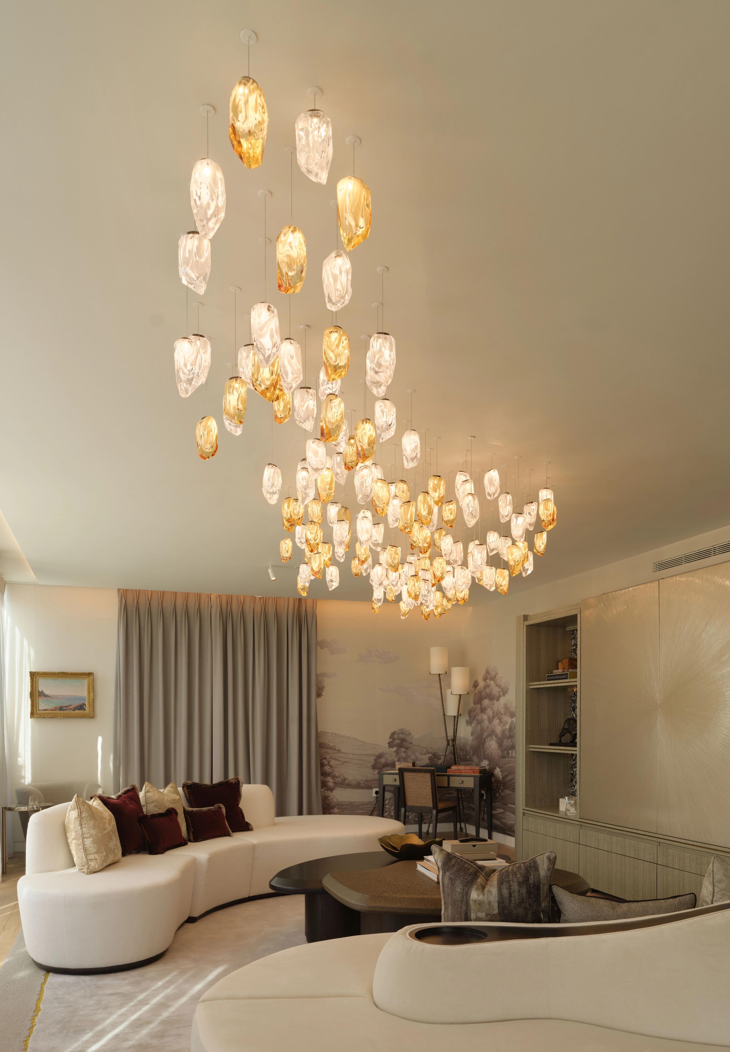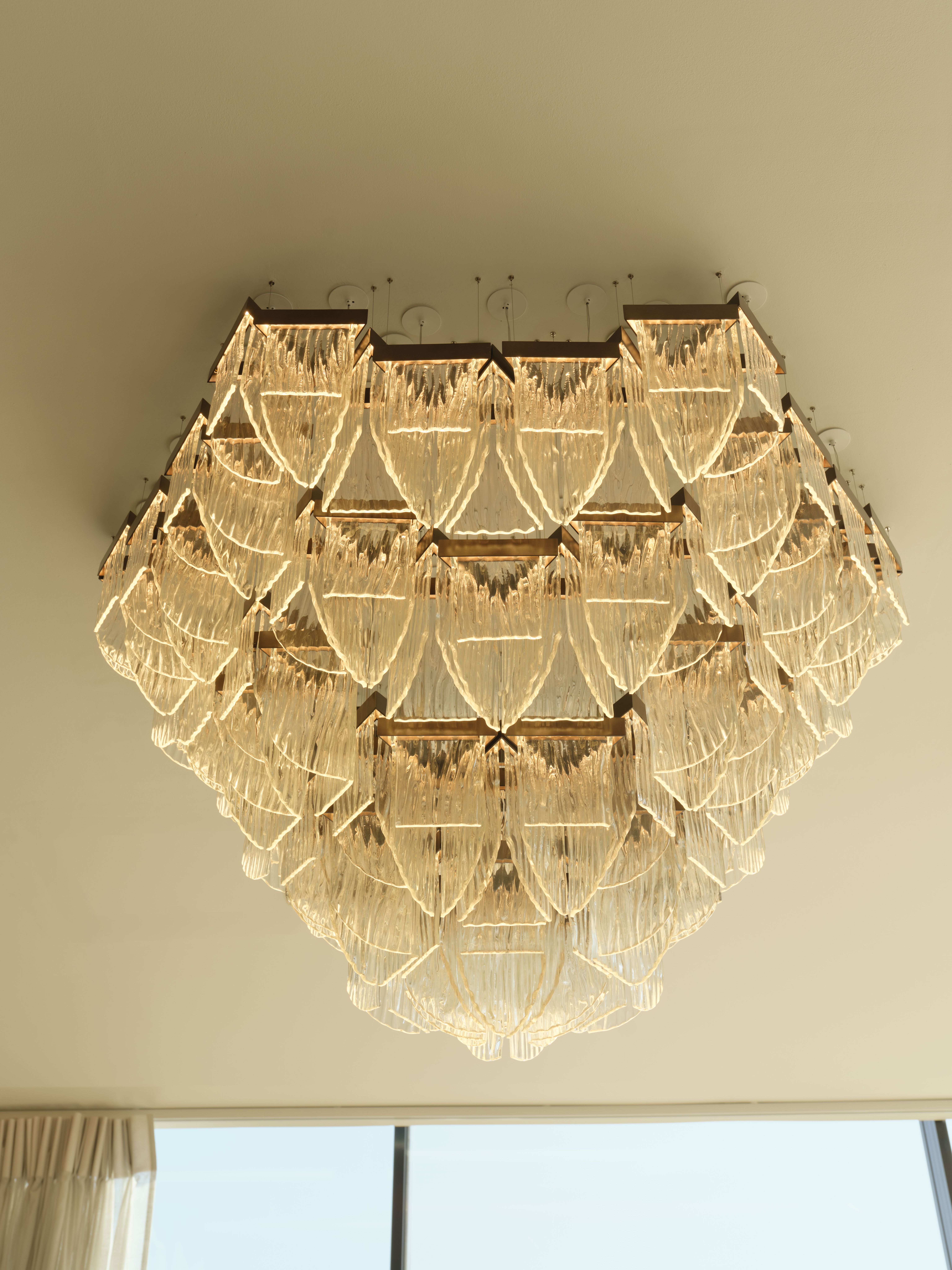 Together, these two installations speak to a shared vision: modern craftsmanship grounded in natural inspiration. While each chandelier holds its own character, both contribute to a cohesive aesthetic that honours texture, form, and the quiet elegance expected of a Mandarin Oriental interior.