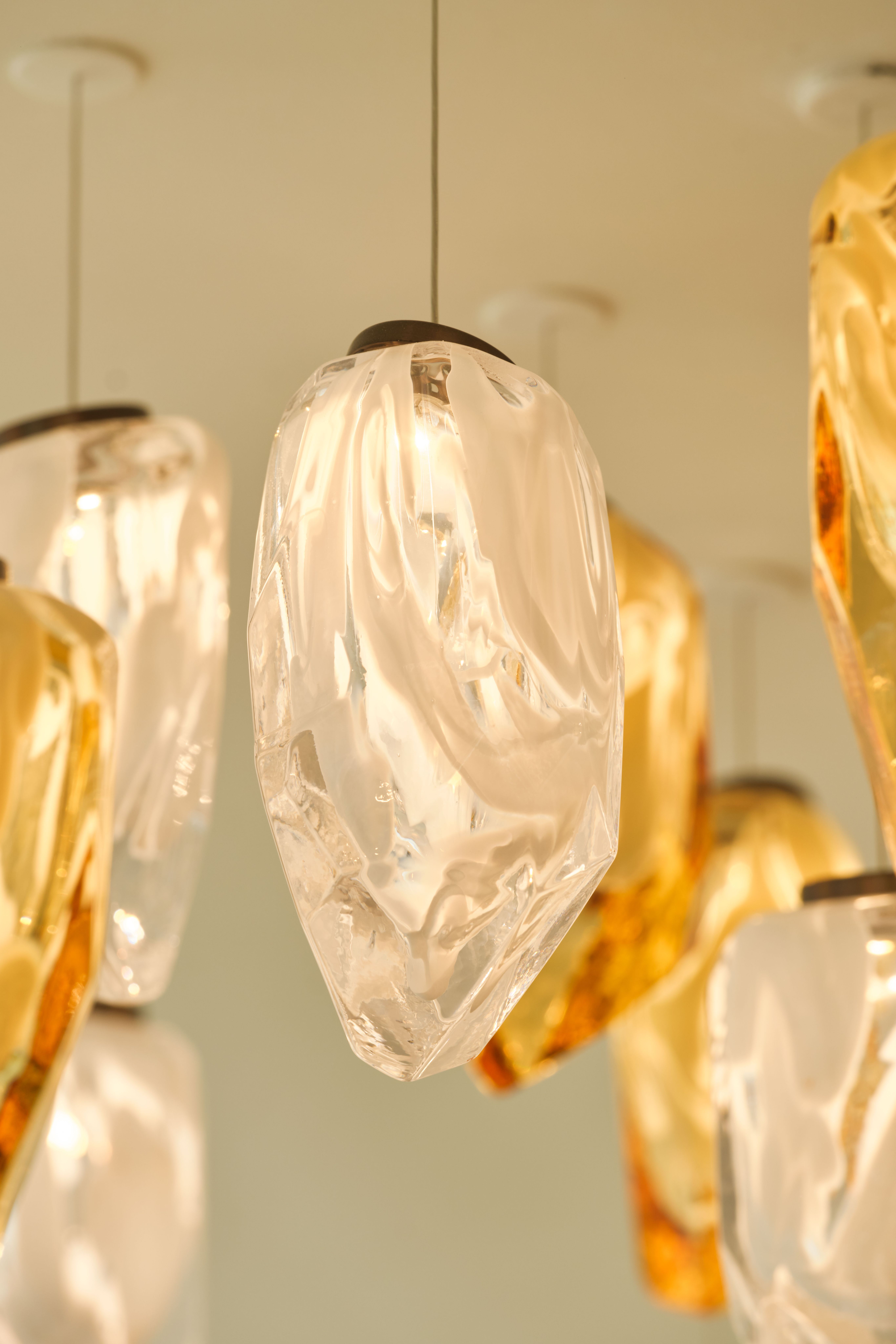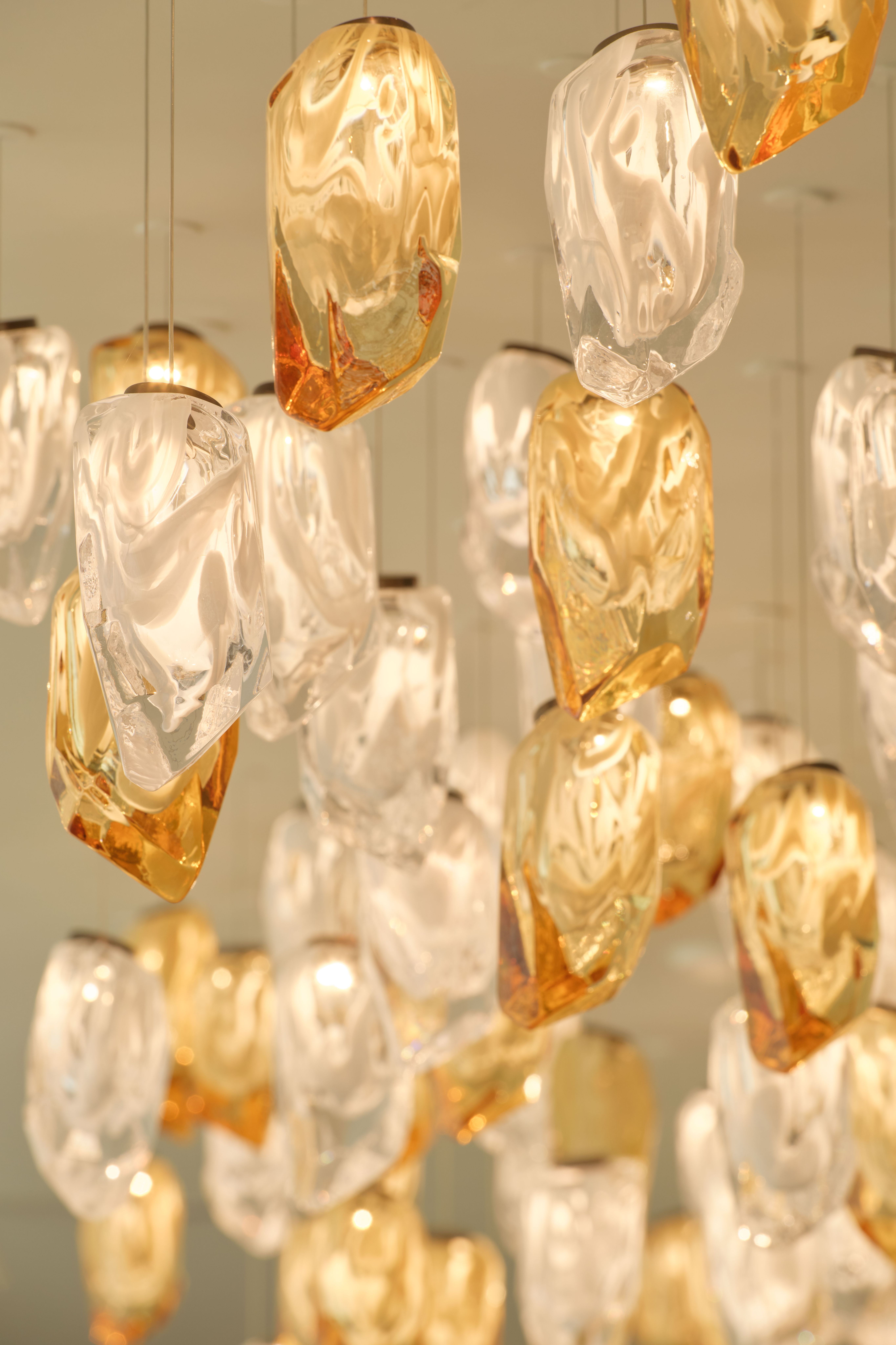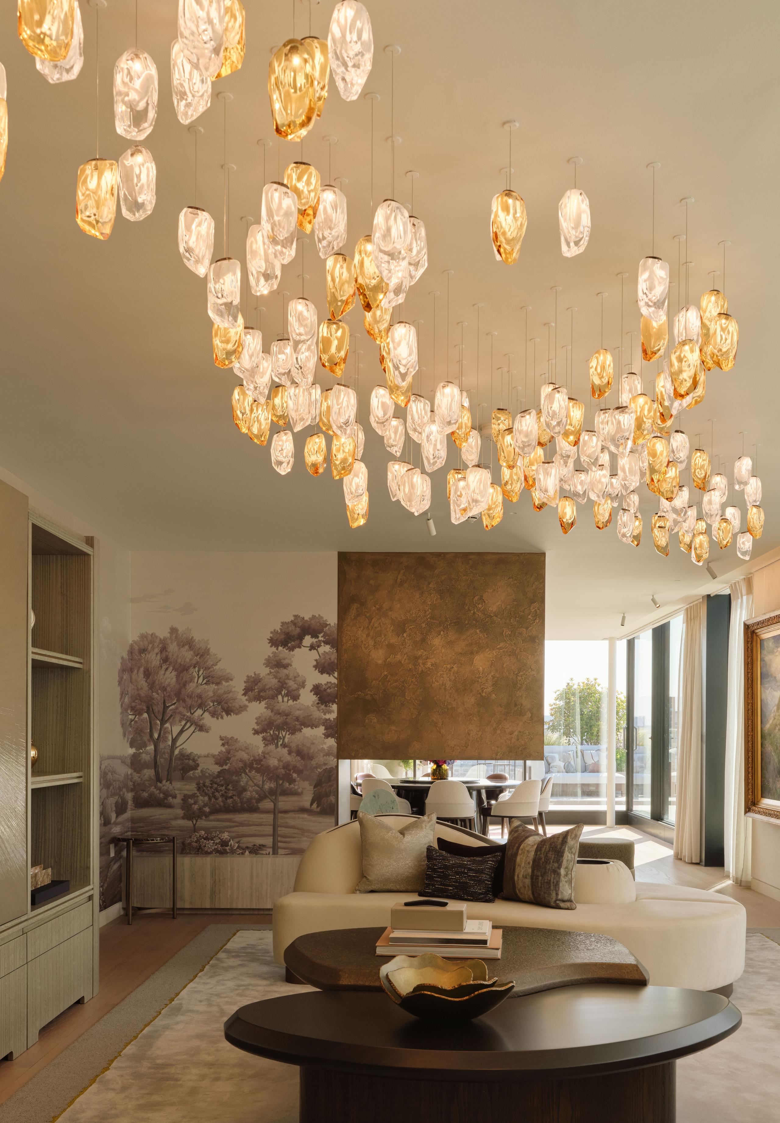 Together, these two installations speak to a shared vision: modern craftsmanship grounded in natural inspiration. While each chandelier holds its own character, both contribute to a cohesive aesthetic that honours texture, form, and the quiet elegance expected of a Mandarin Oriental interior.