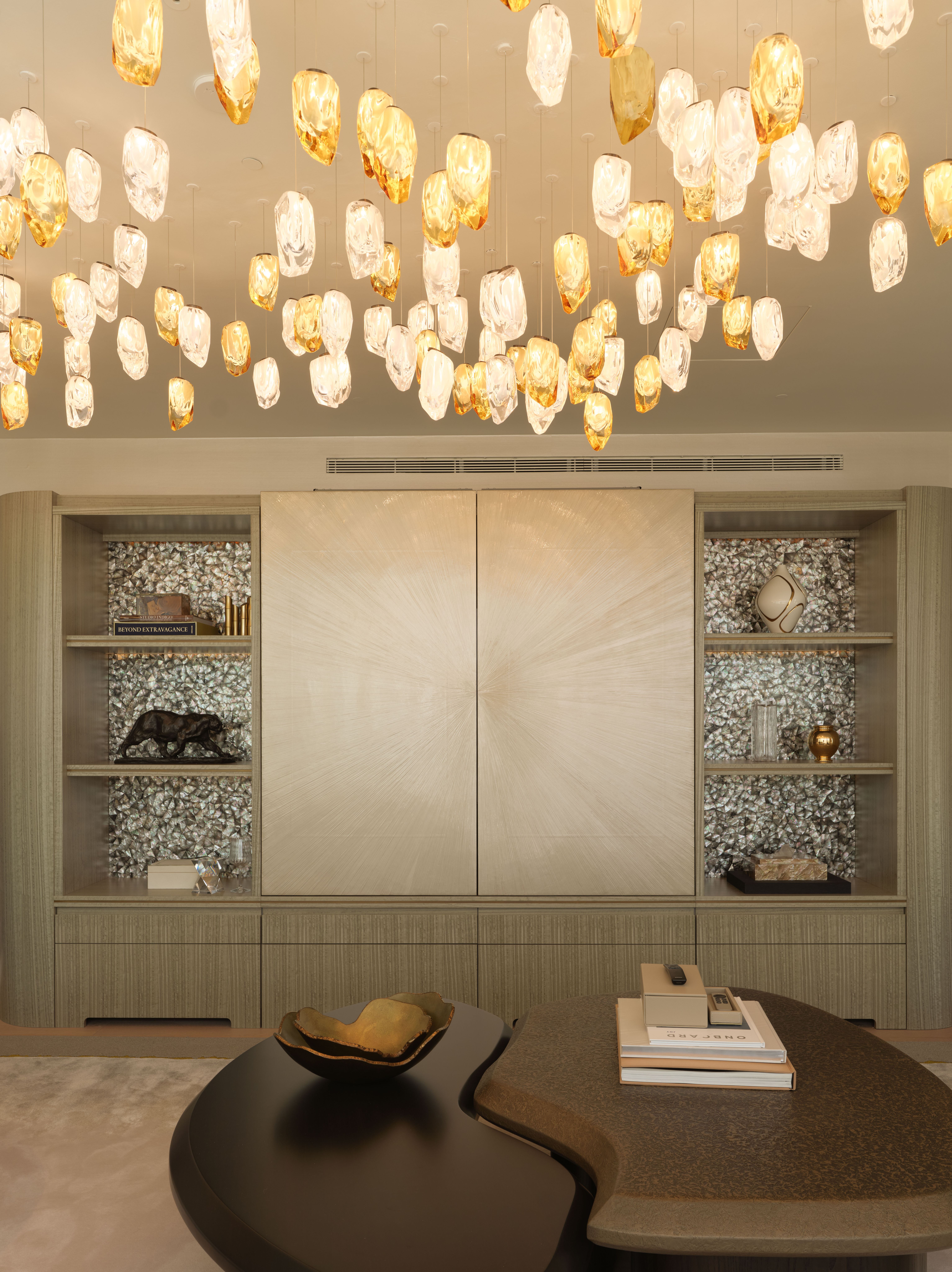 For the living room, we customised Glacier, our collection inspired by the quiet power of floating icebergs. The design captures the crystalline clarity and asymmetrical beauty of glacial formations, with geometric glass elements arranged in an organic flow. Clear and frosted finishes interact with the light to evoke a sense of stillness and purity, offering a refined contrast to the surrounding materials and colour palette.