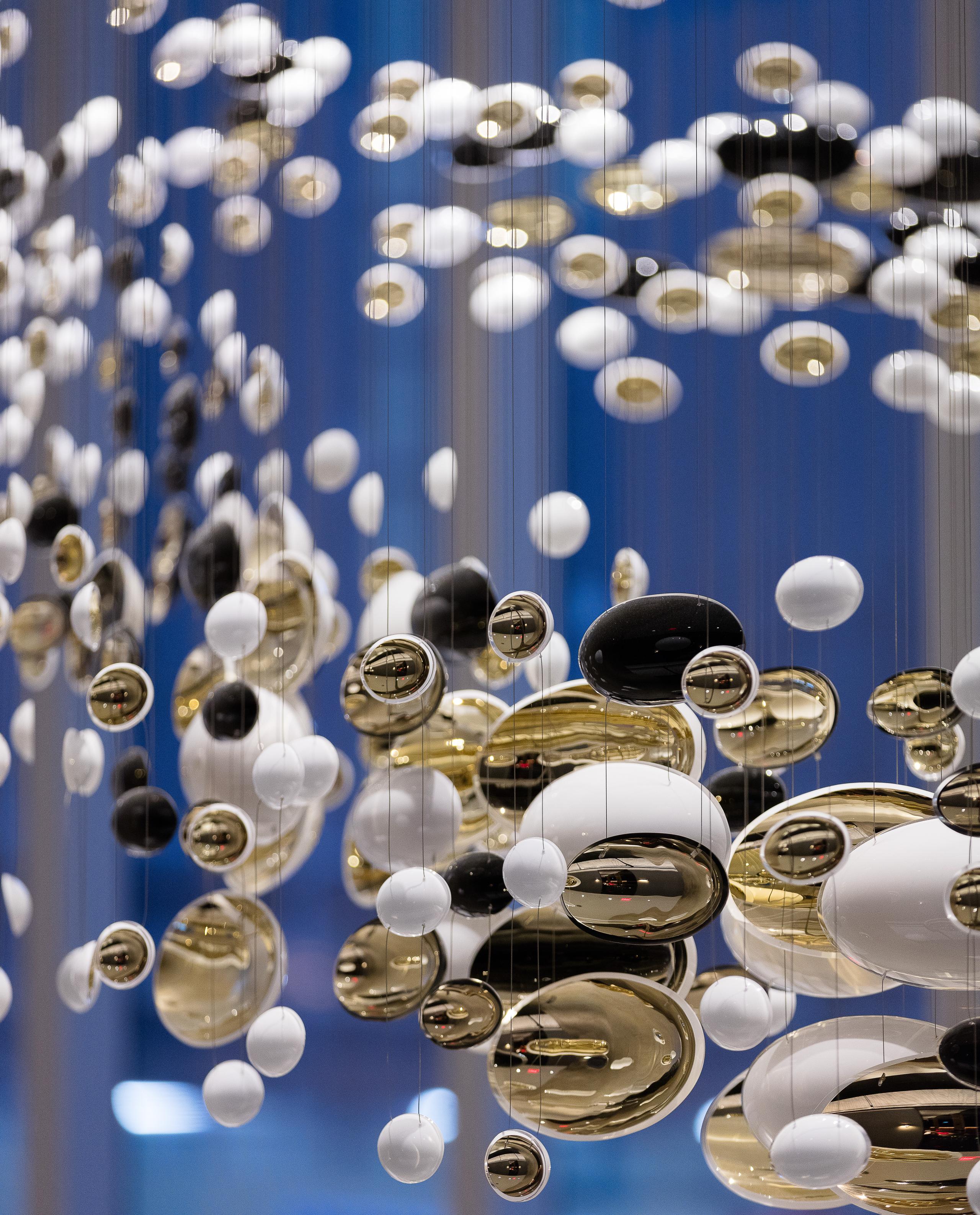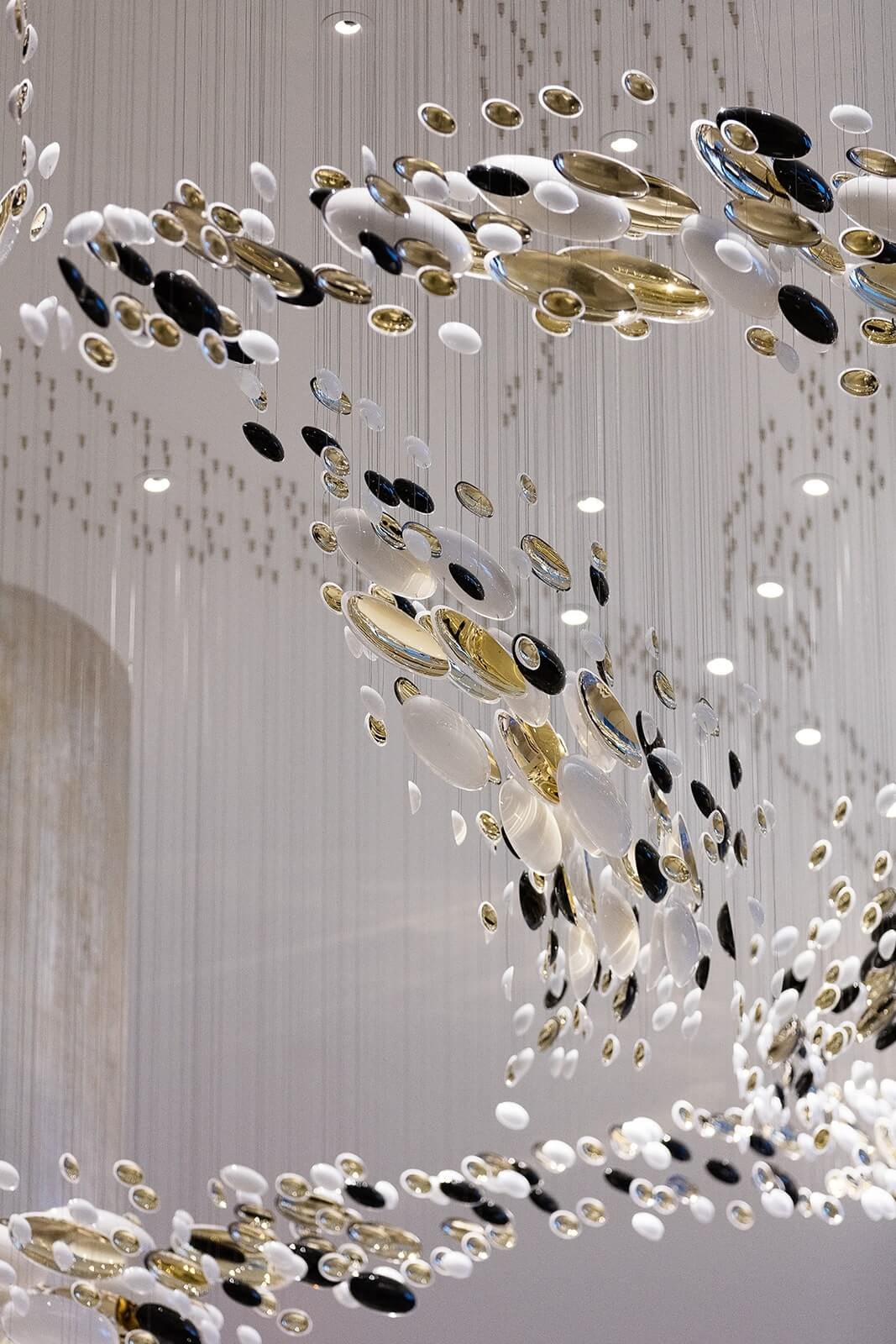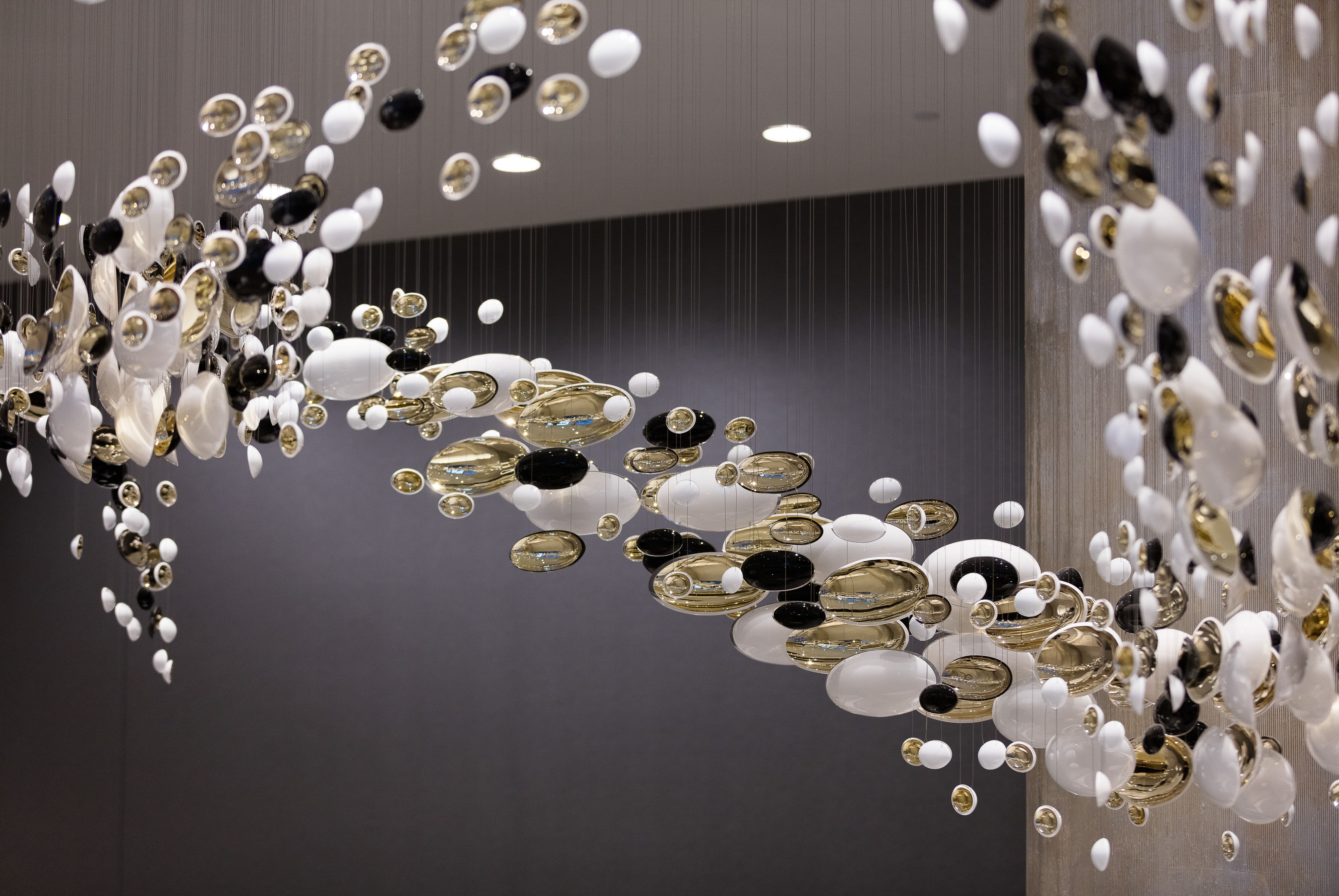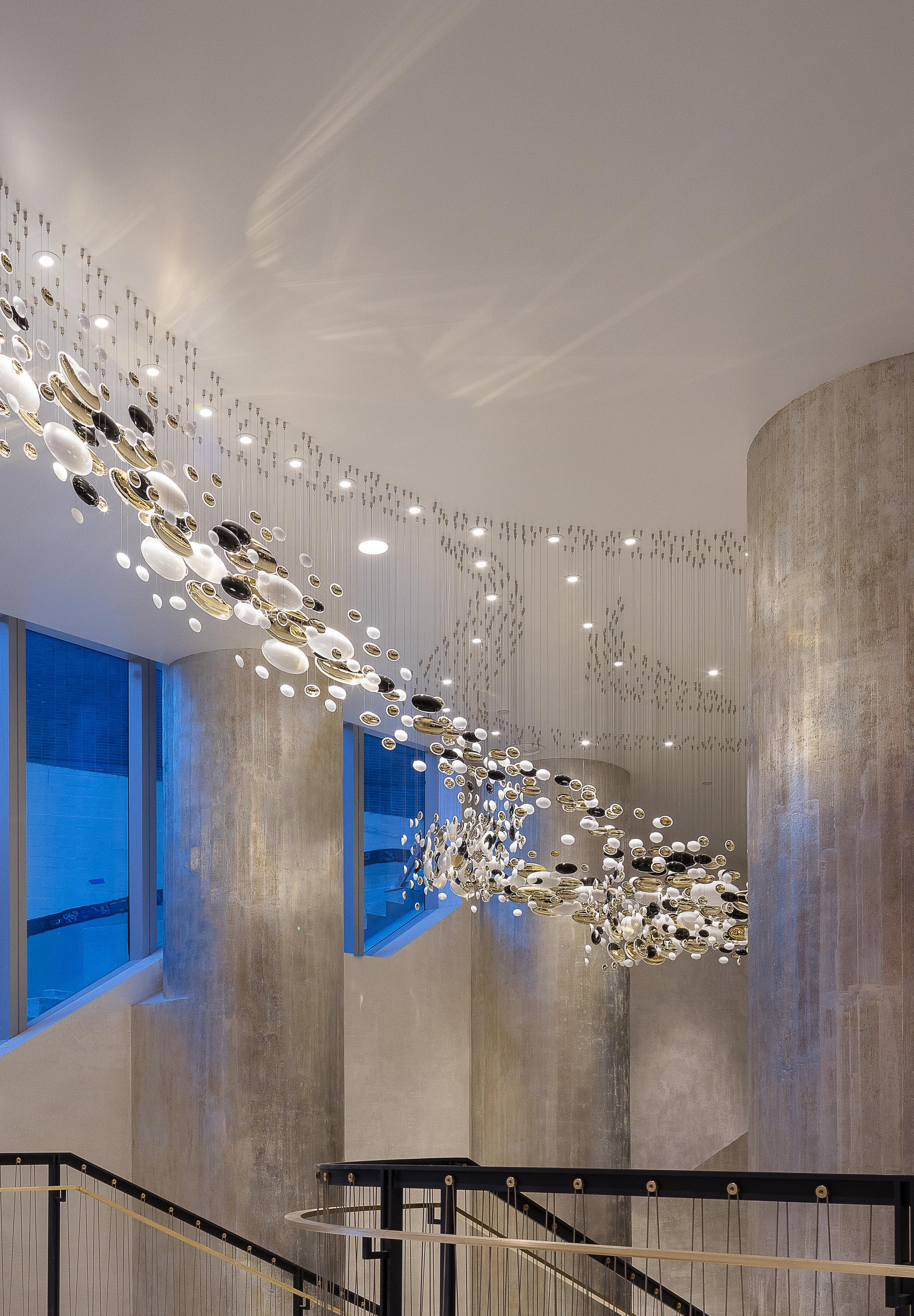 Smooth, hand-blown bowls are rotated ninety degrees and suspended to create a polished wave that runs through the space. Finished with white and gold nanocoating and a touch of black, this installation is a piece of art to draw you into the space, as well as a piece of lighting.