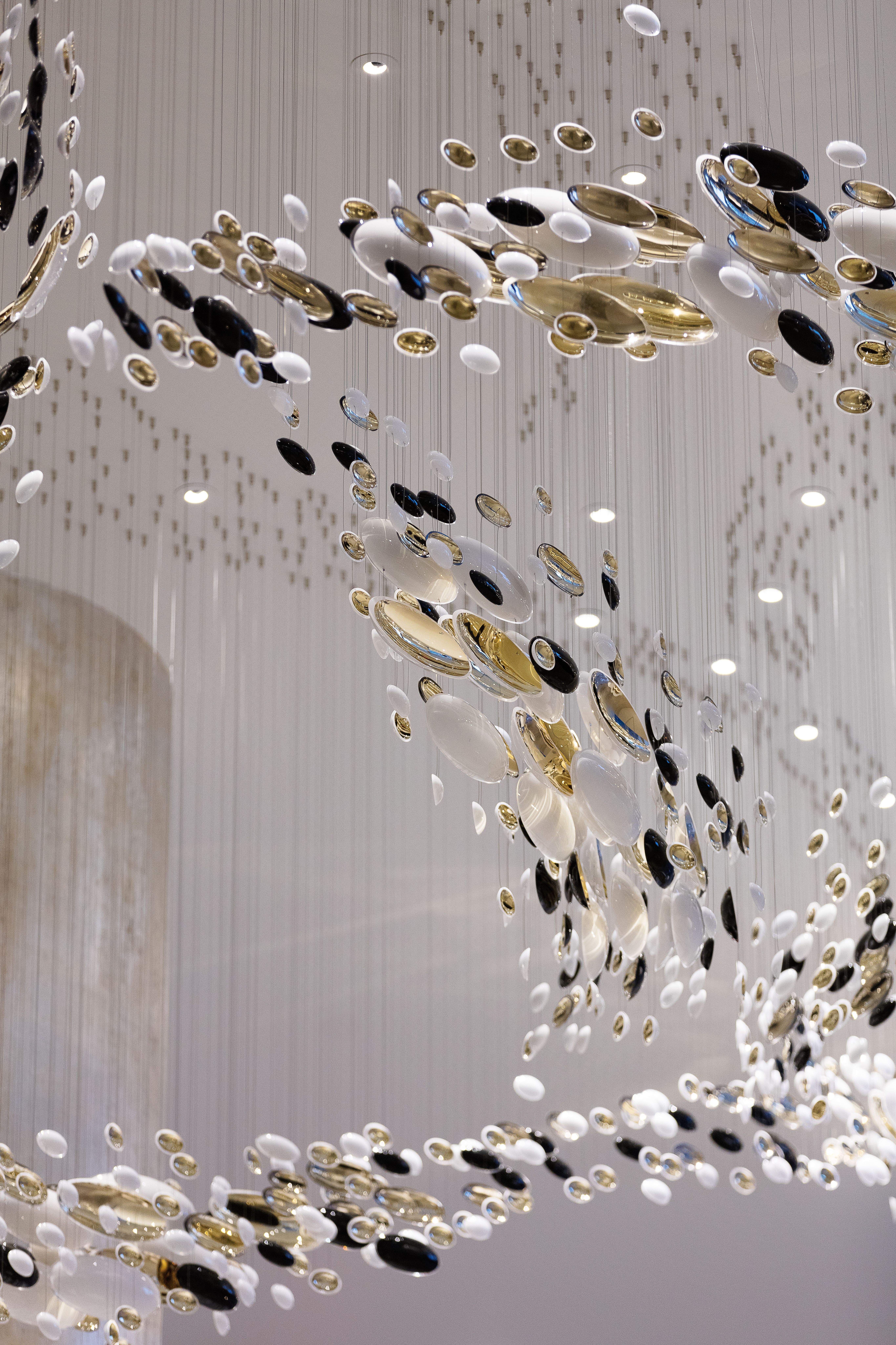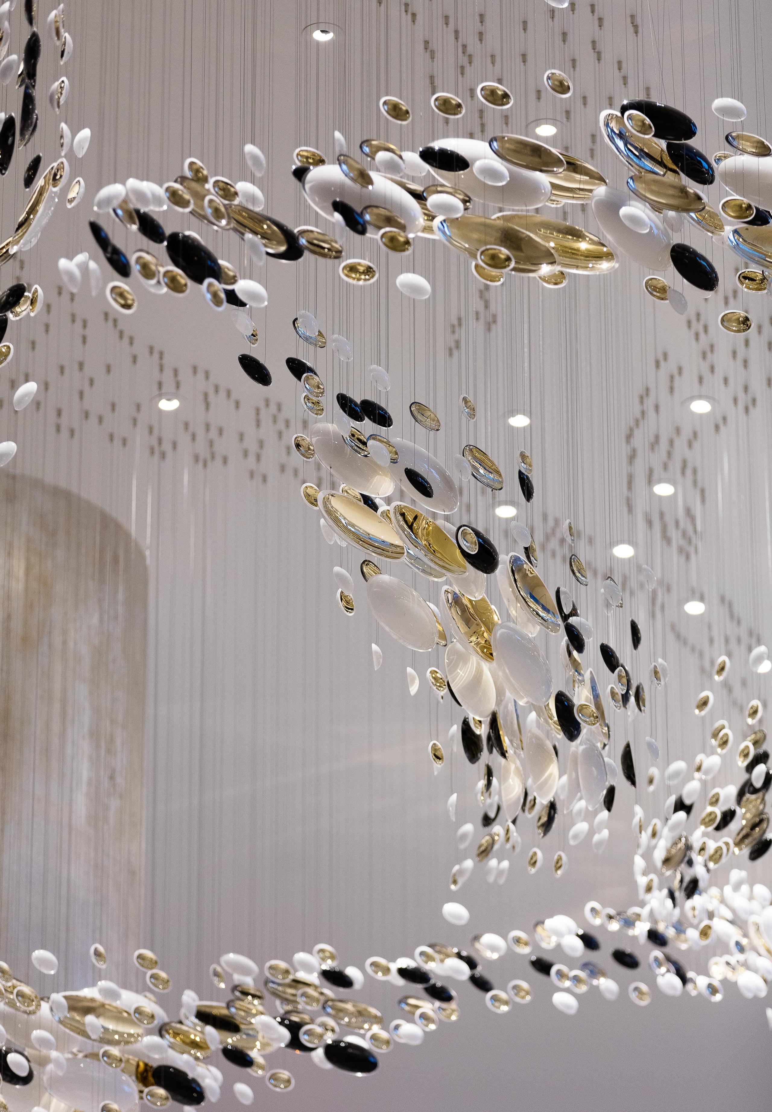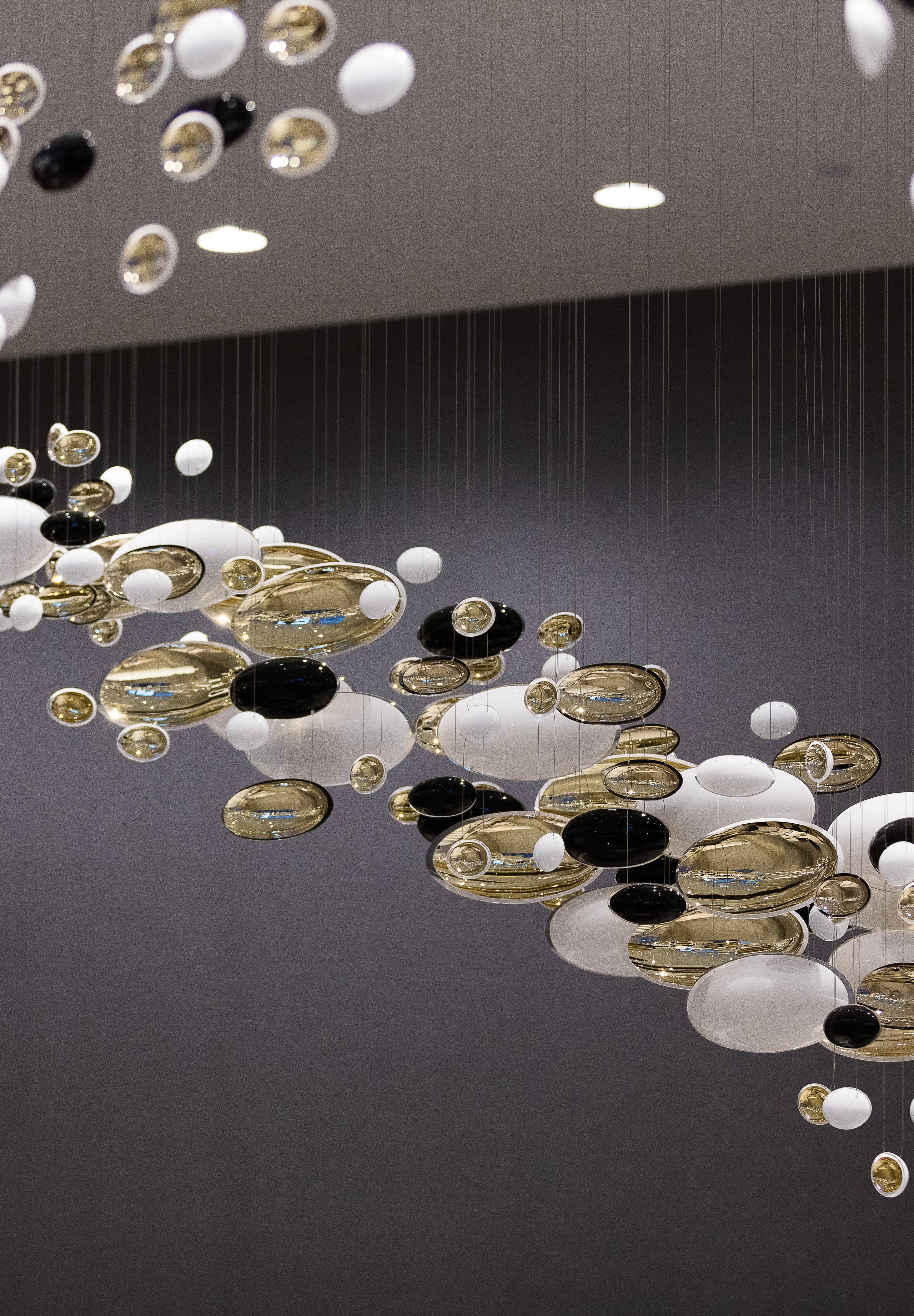 Smooth, hand-blown bowls are rotated ninety degrees and suspended to create a polished wave that runs through the space. Finished with white and gold nanocoating and a touch of black, this installation is a piece of art to draw you into the space, as well as a piece of lighting.