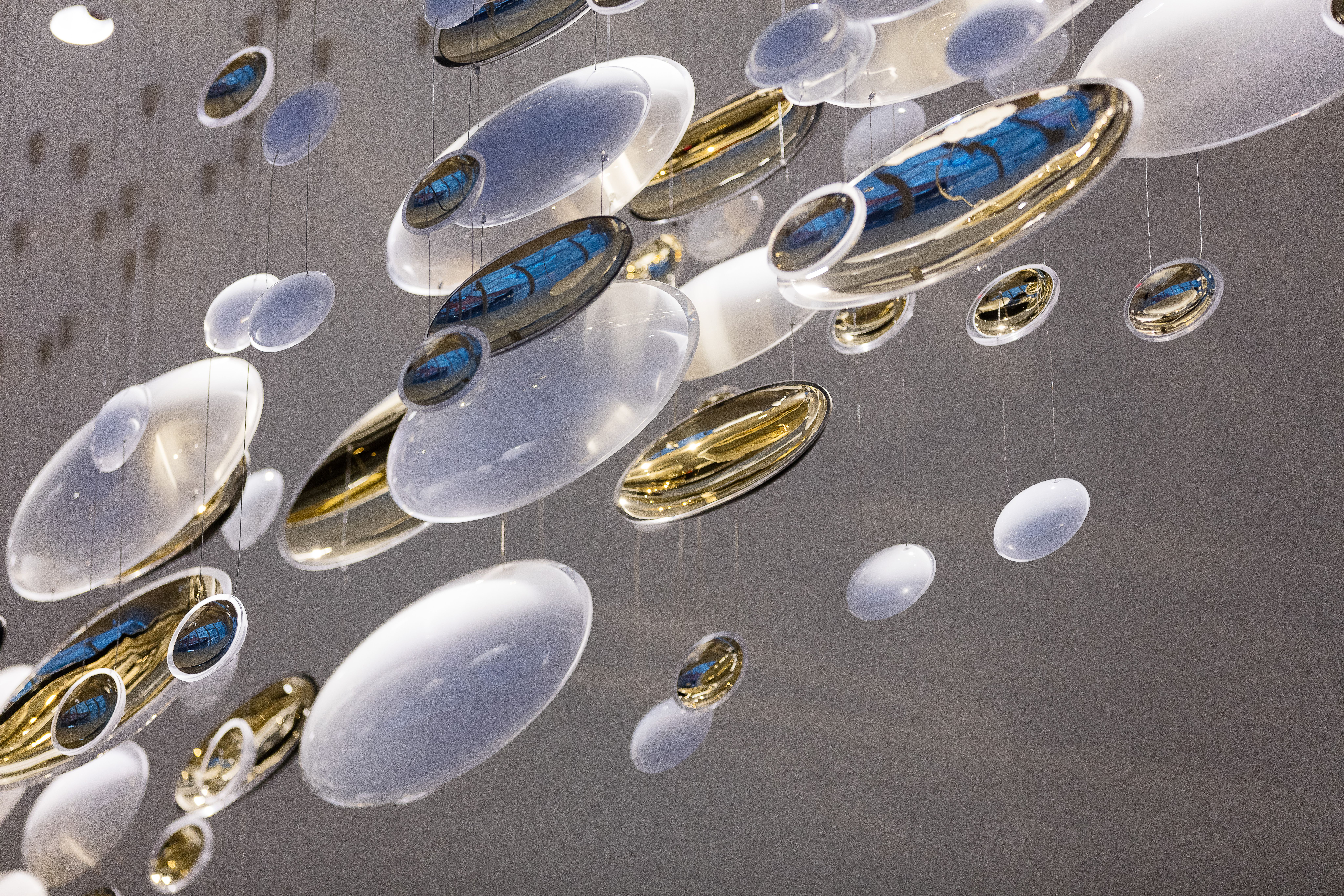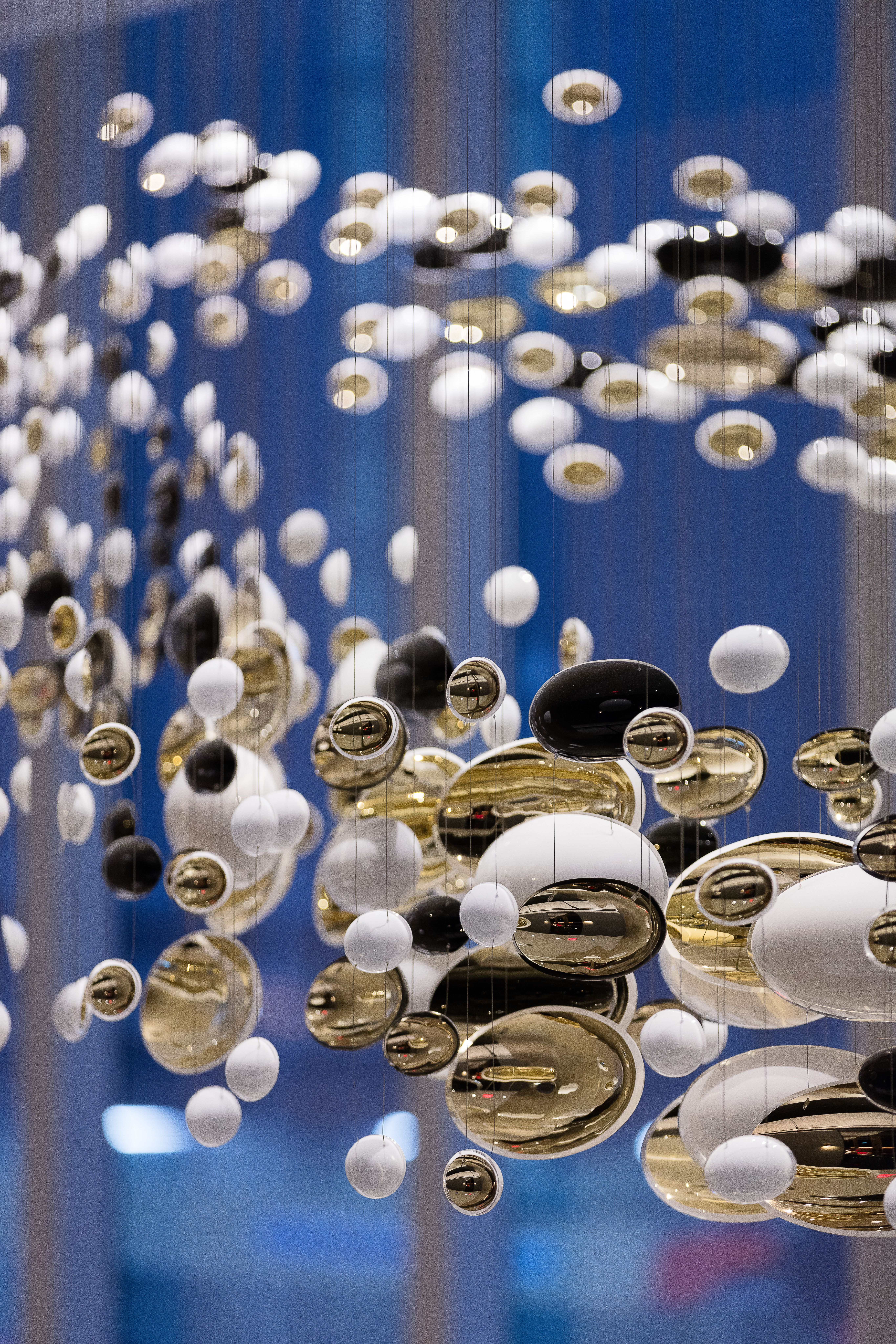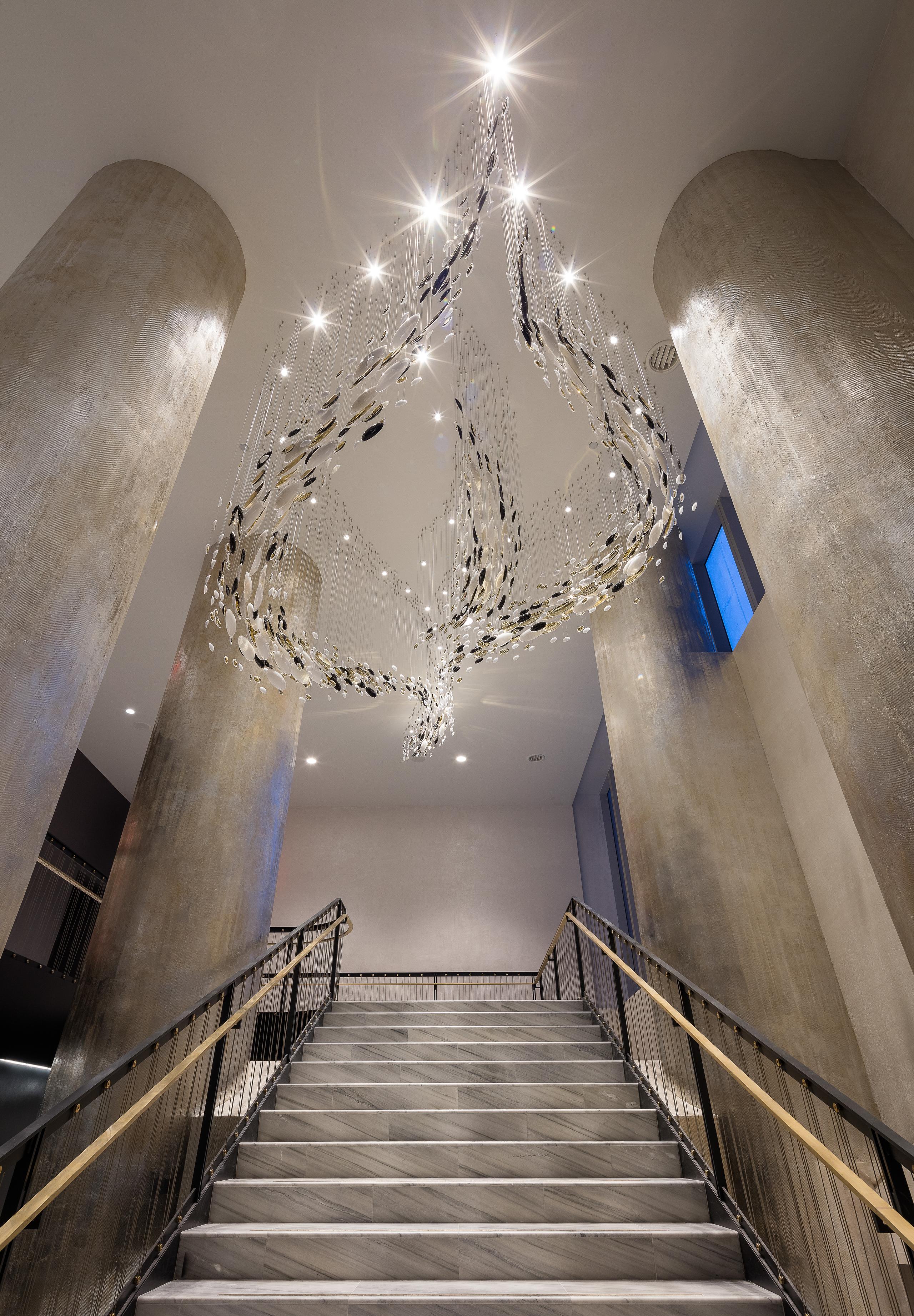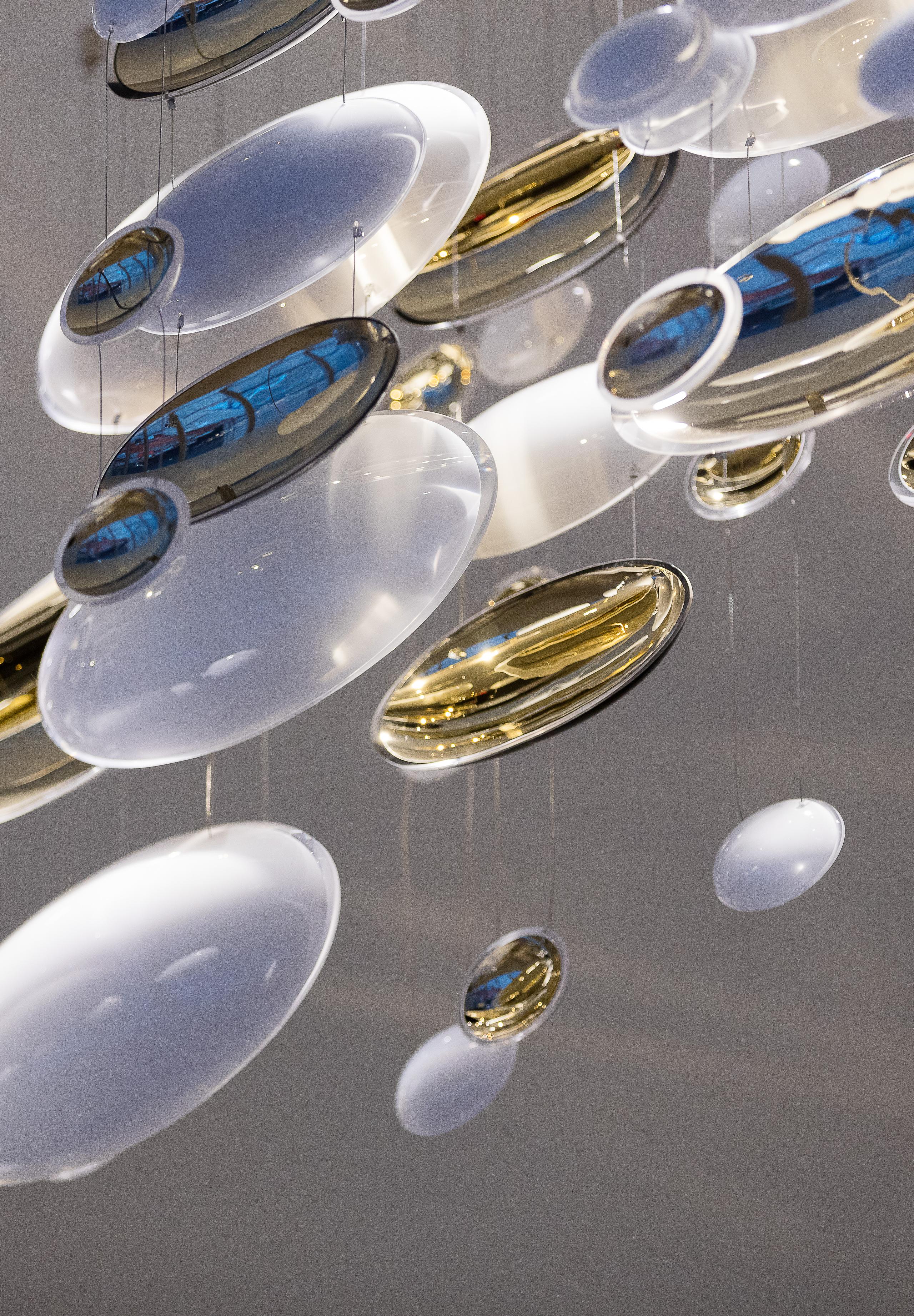 Smooth, hand-blown bowls are rotated ninety degrees and suspended to create a polished wave that runs through the space. Finished with white and gold nanocoating and a touch of black, this installation is a piece of art to draw you into the space, as well as a piece of lighting.
