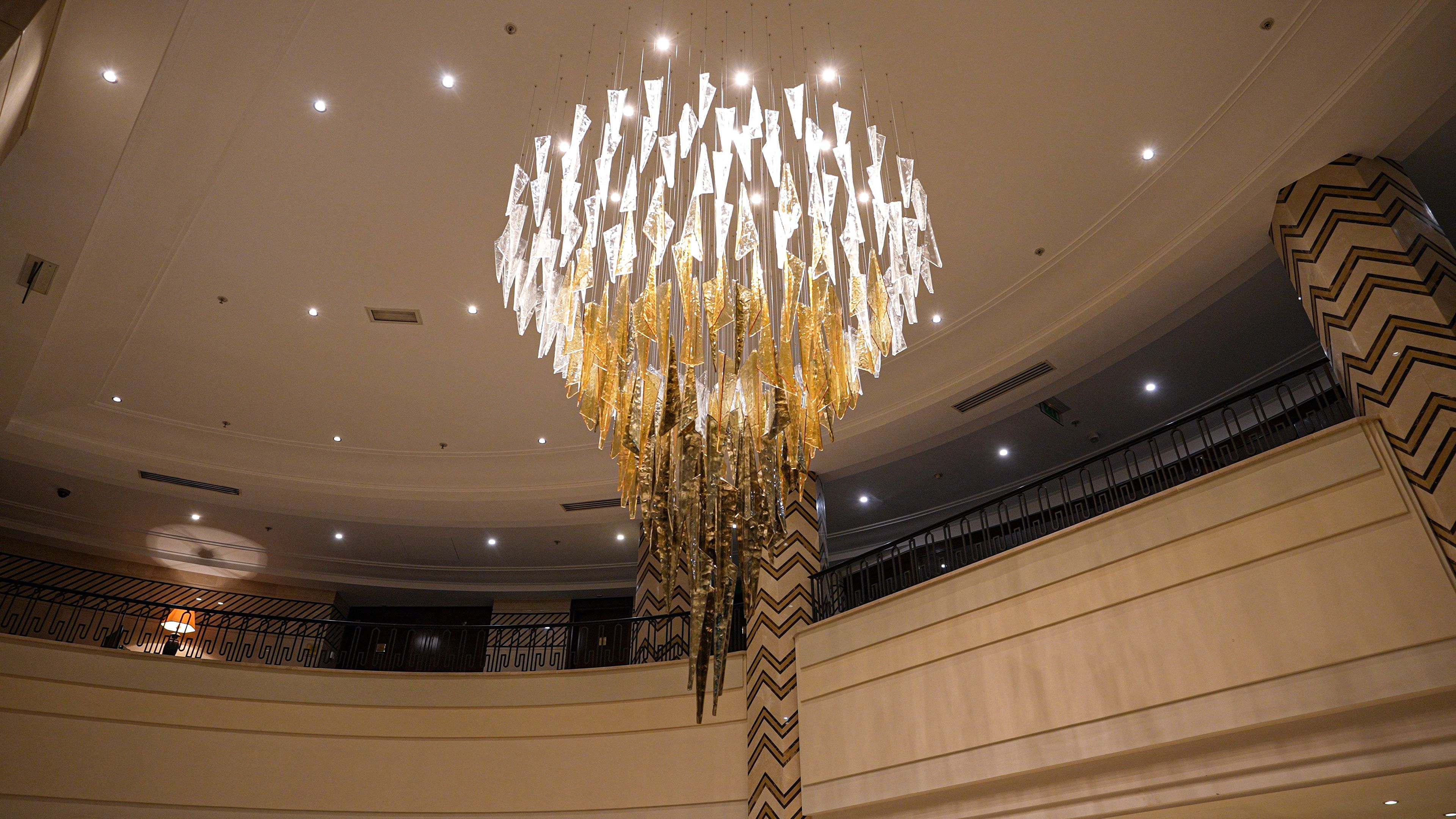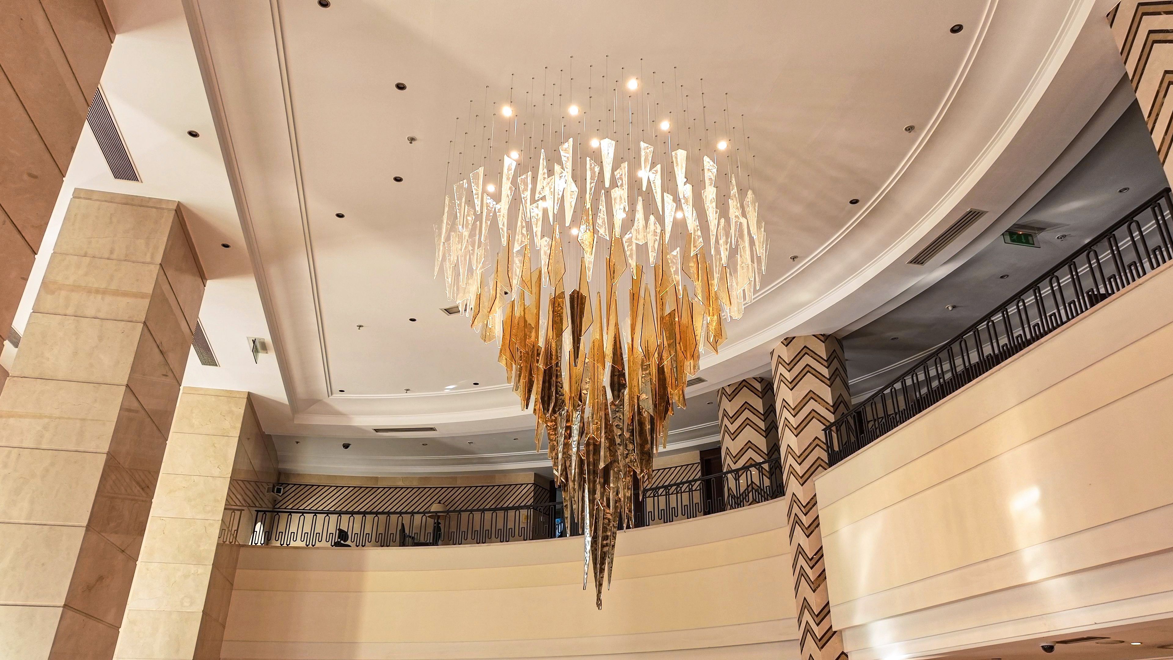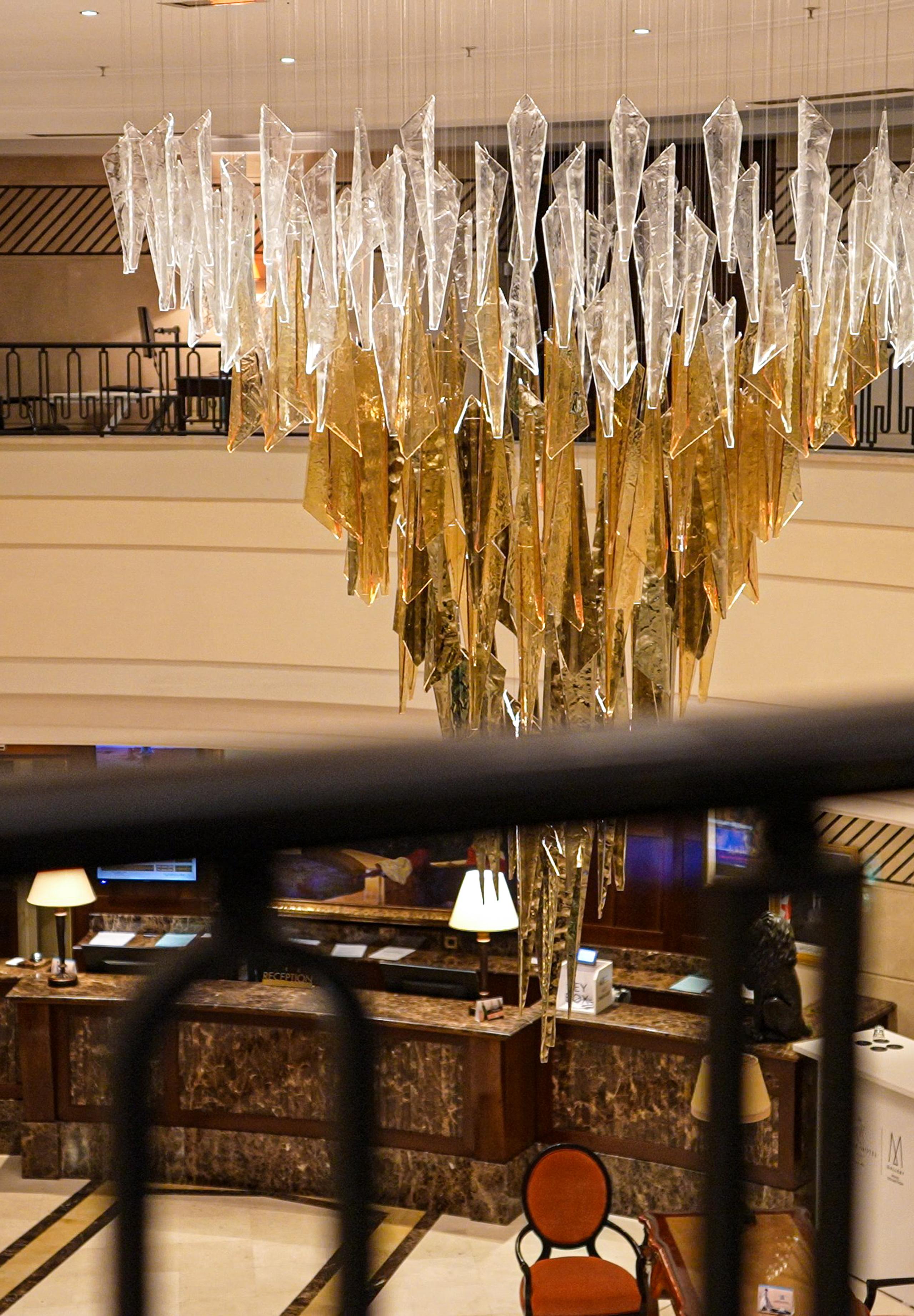 When tasked with transforming the hotel’s reception area, the goal was clear: to replace the existing lighting with a statement piece that would enhance the grandeur of the space. Our bespoke solution seamlessly balances opulence, elevating the reception’s ambiance with a captivating centrepiece that welcomes guests with an unforgettable first impression.