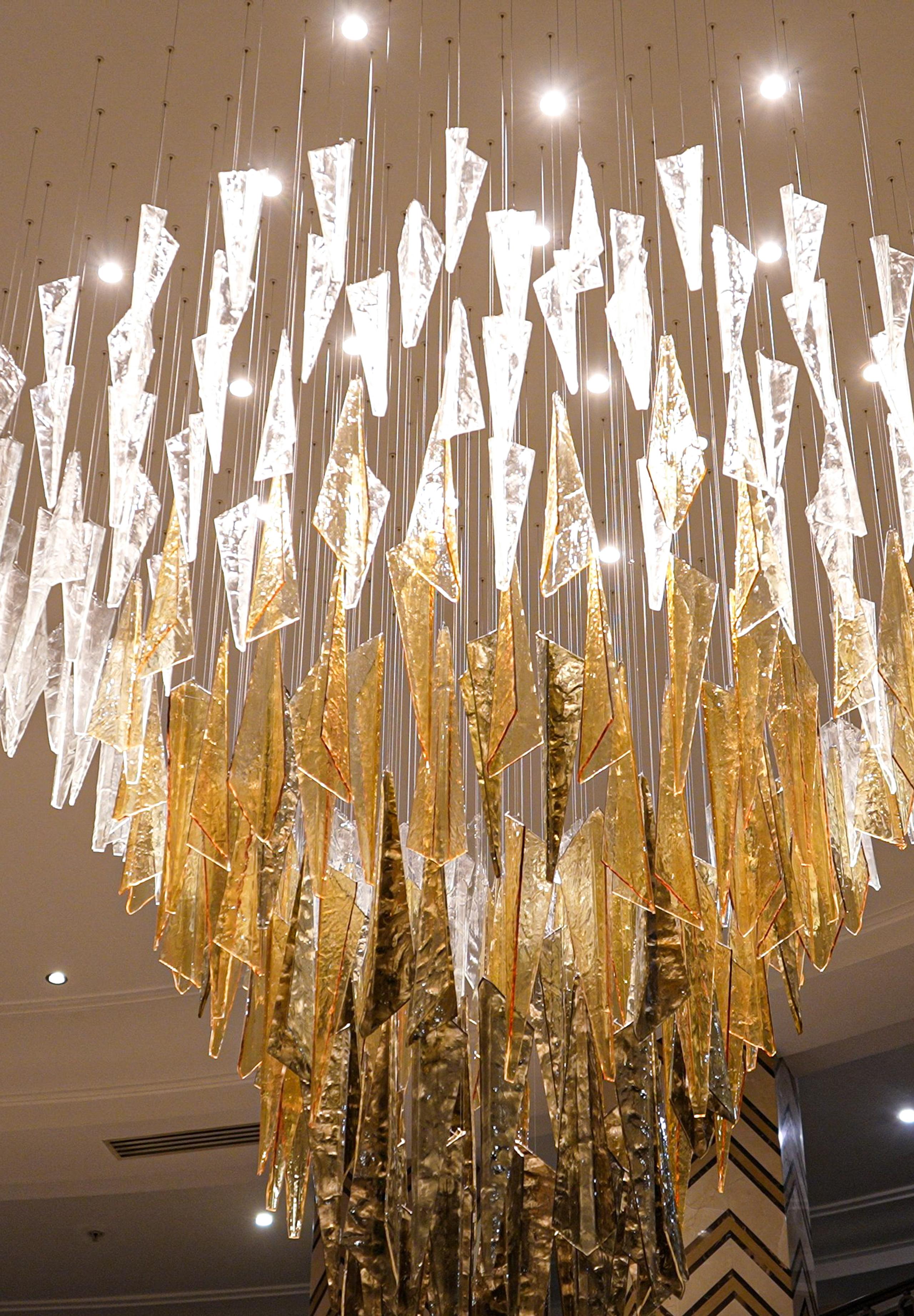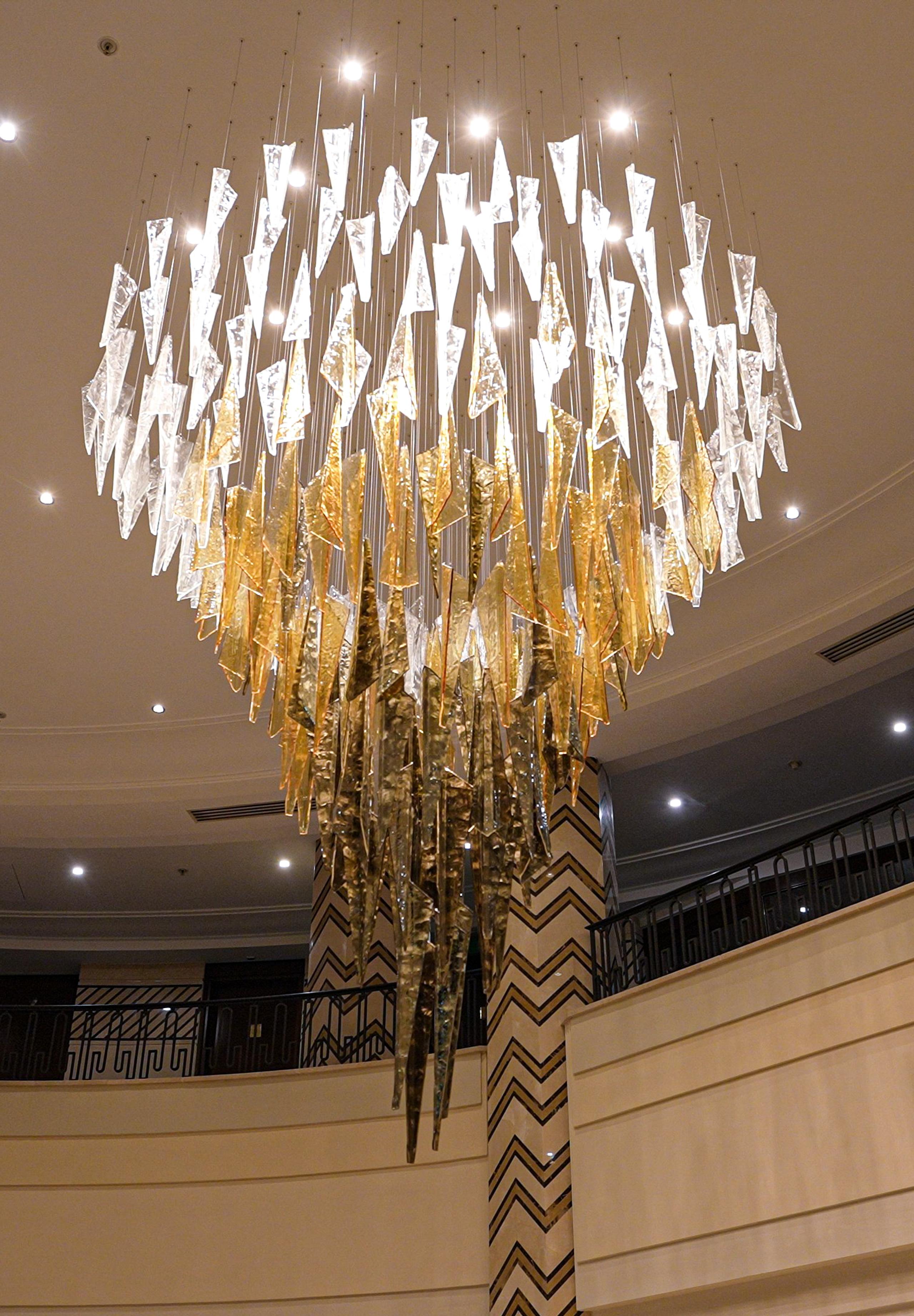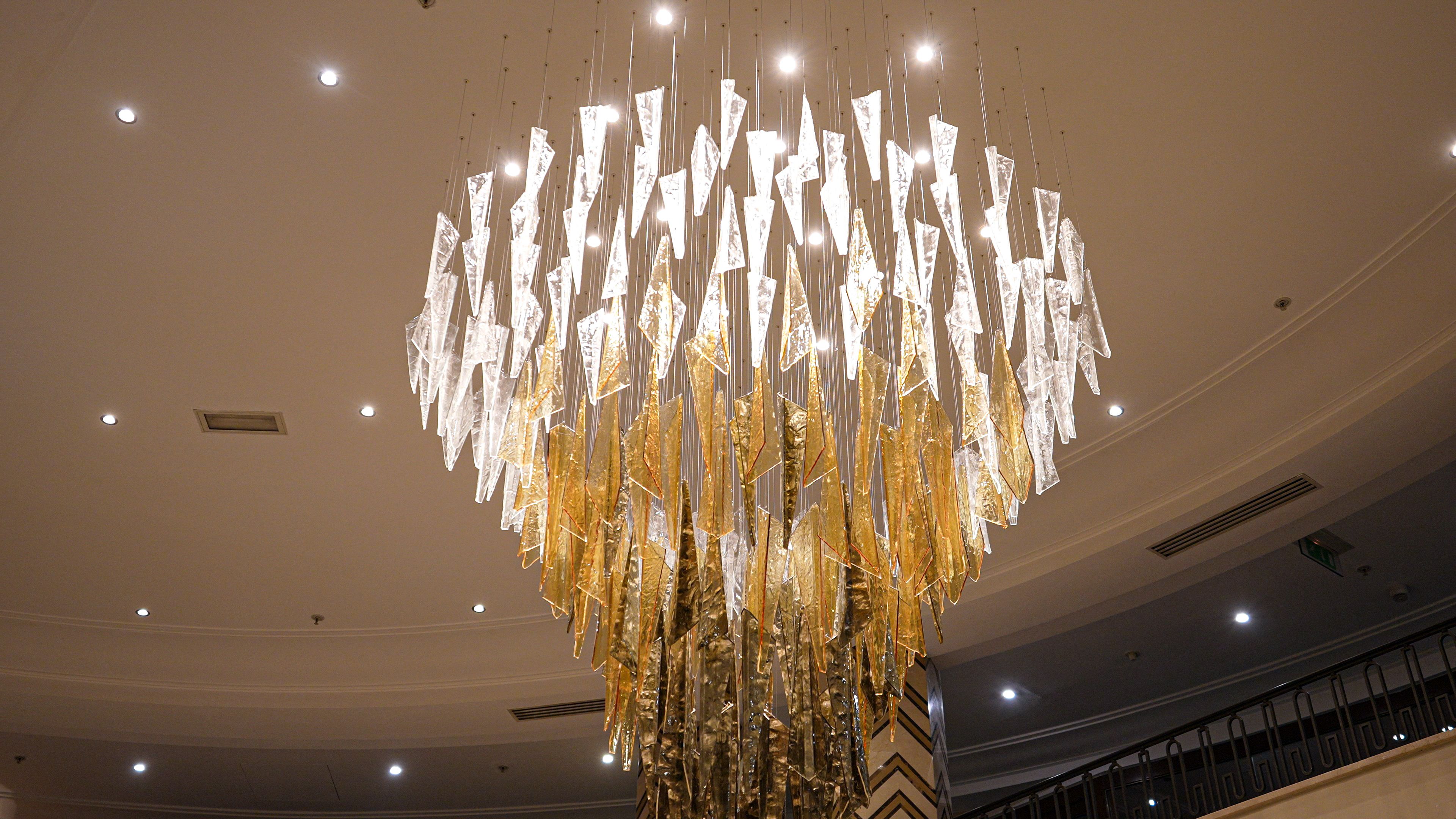 When tasked with transforming the hotel’s reception area, the goal was clear: to replace the existing lighting with a statement piece that would enhance the grandeur of the space. Our bespoke solution seamlessly balances opulence, elevating the reception’s ambiance with a captivating centrepiece that welcomes guests with an unforgettable first impression.
