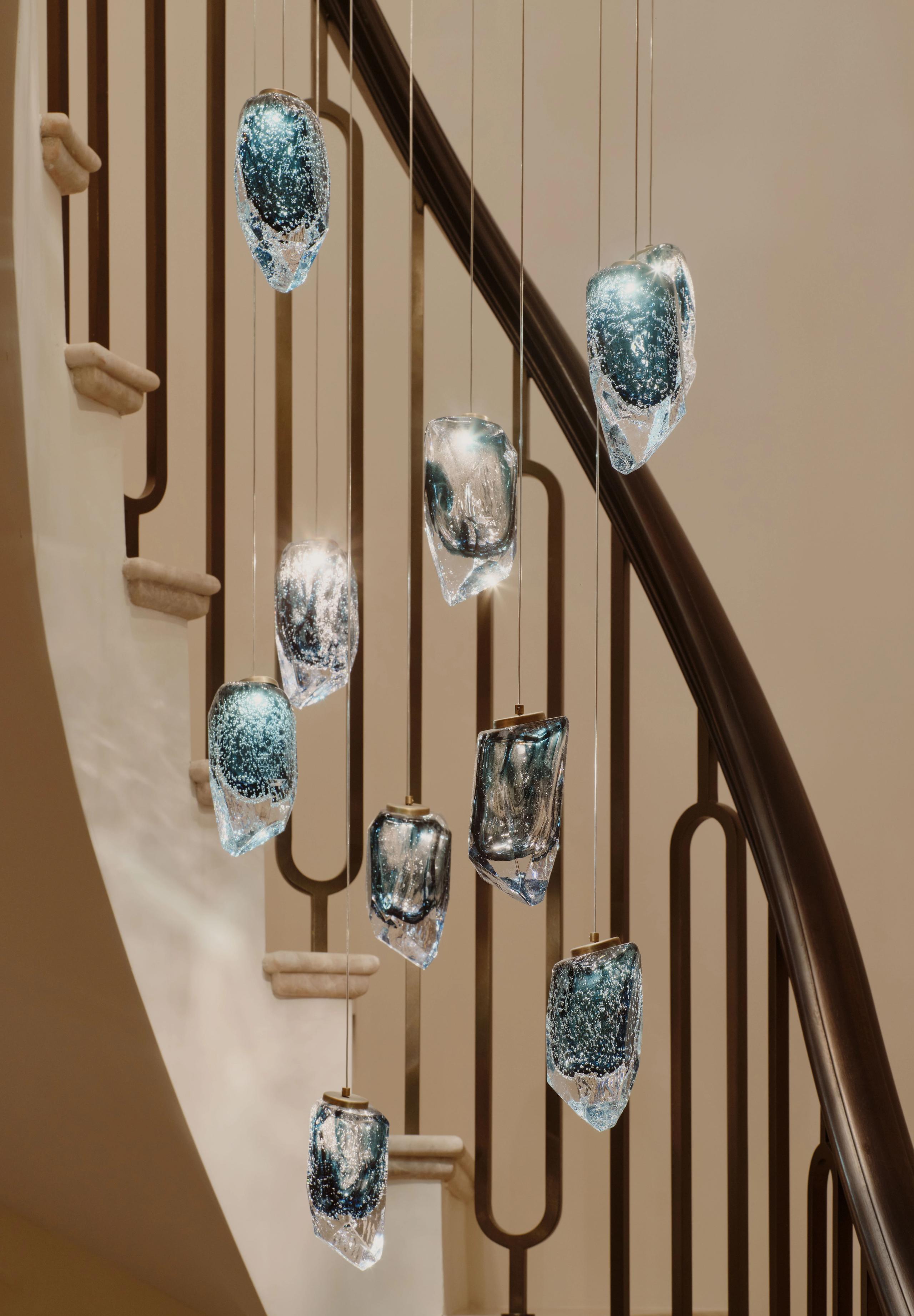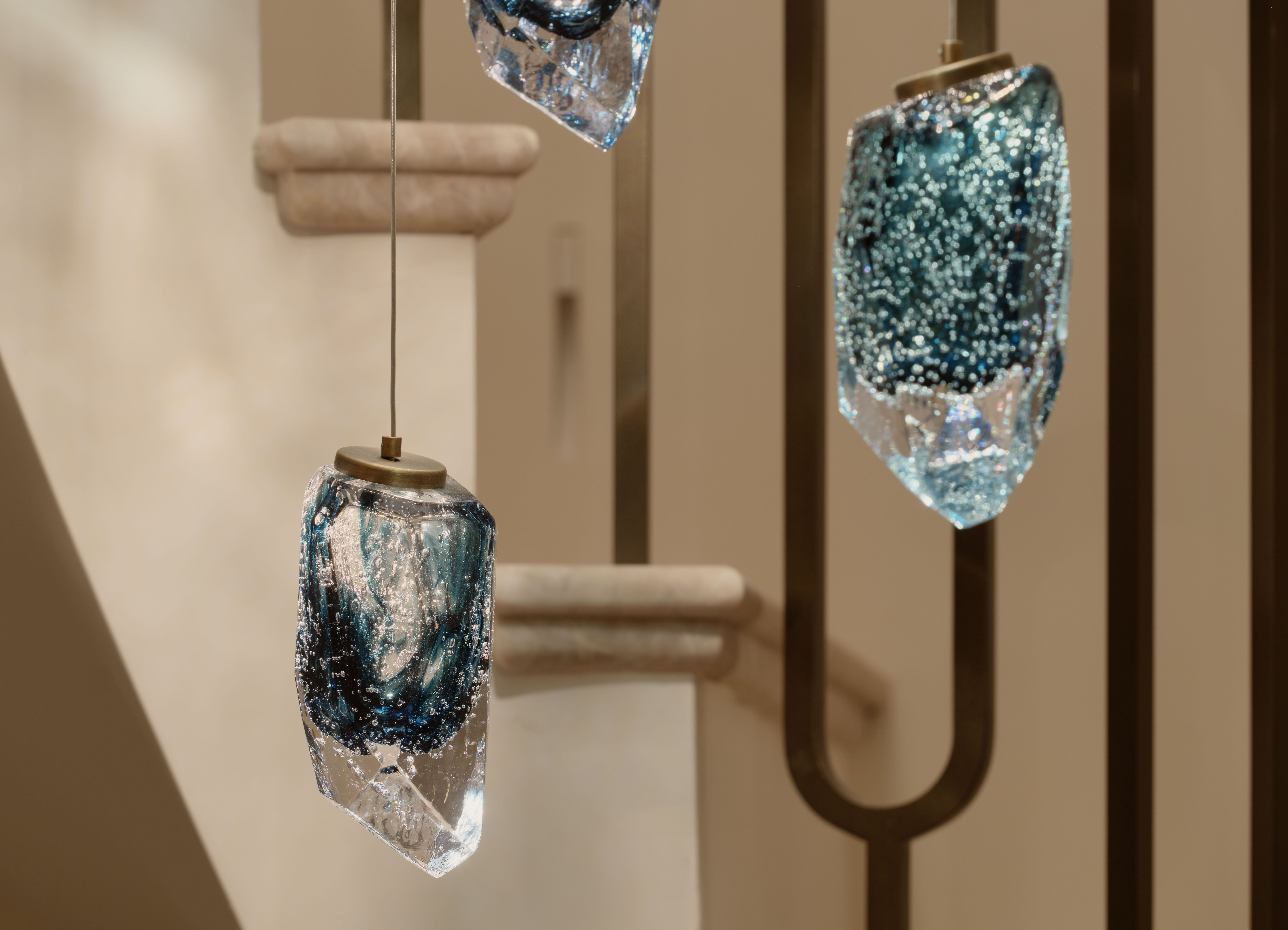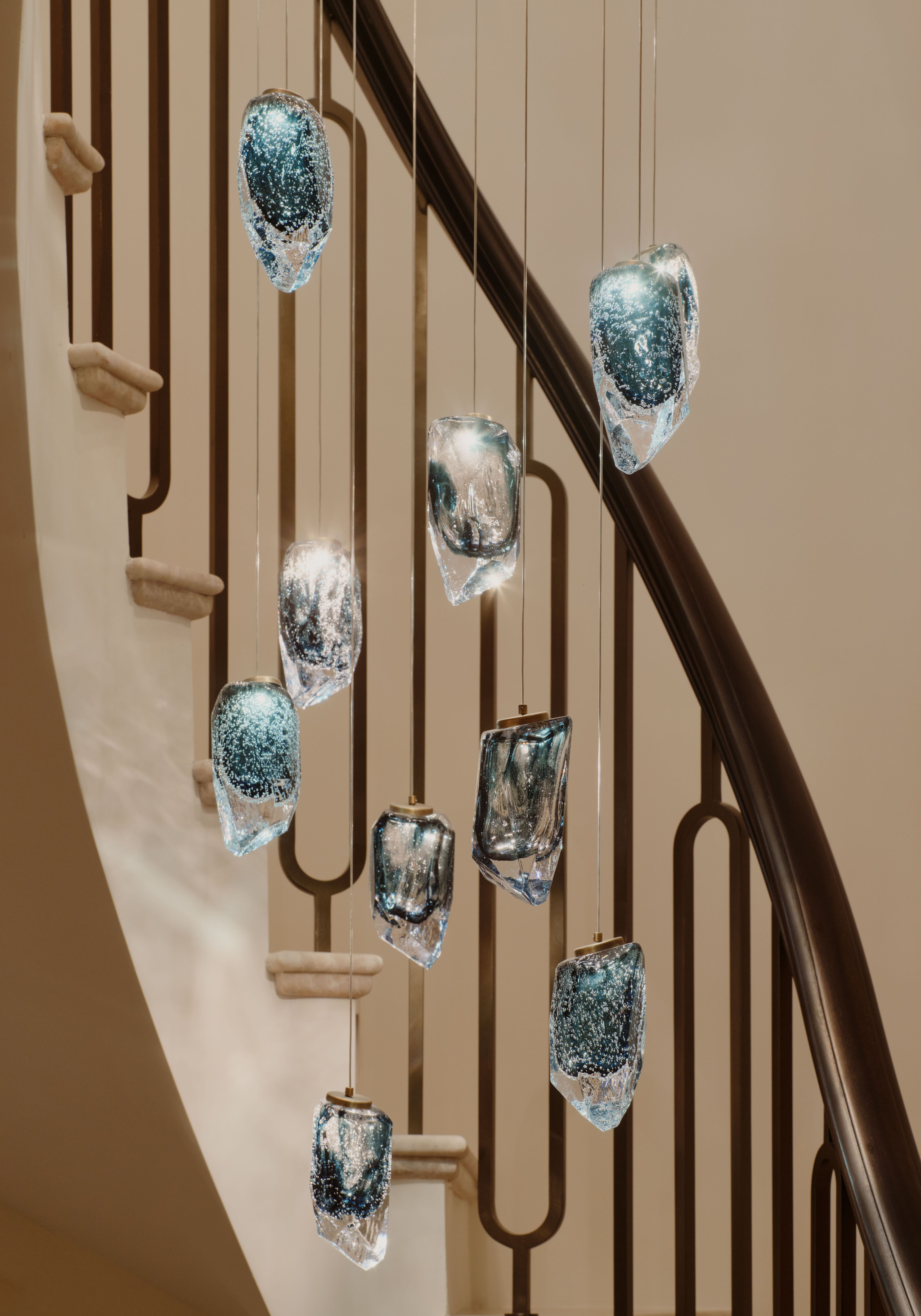 Crafted from our Glacier collection, this bespoke lighting installation showcases a unique combination of finishes and techniques developed for the project. Each hand-blown glass element was carefully customised by blending lagoon mist with a delicate soda finish.