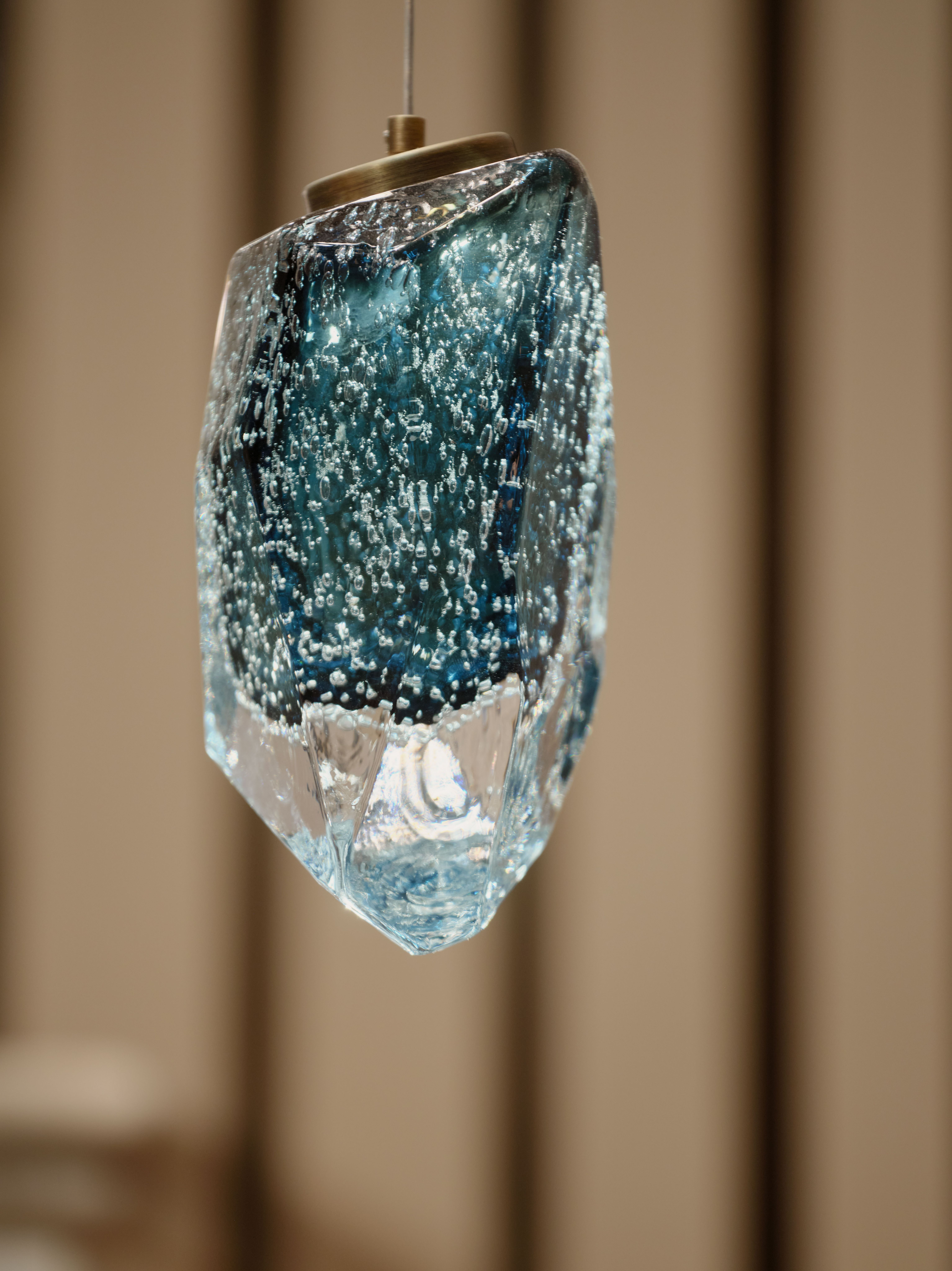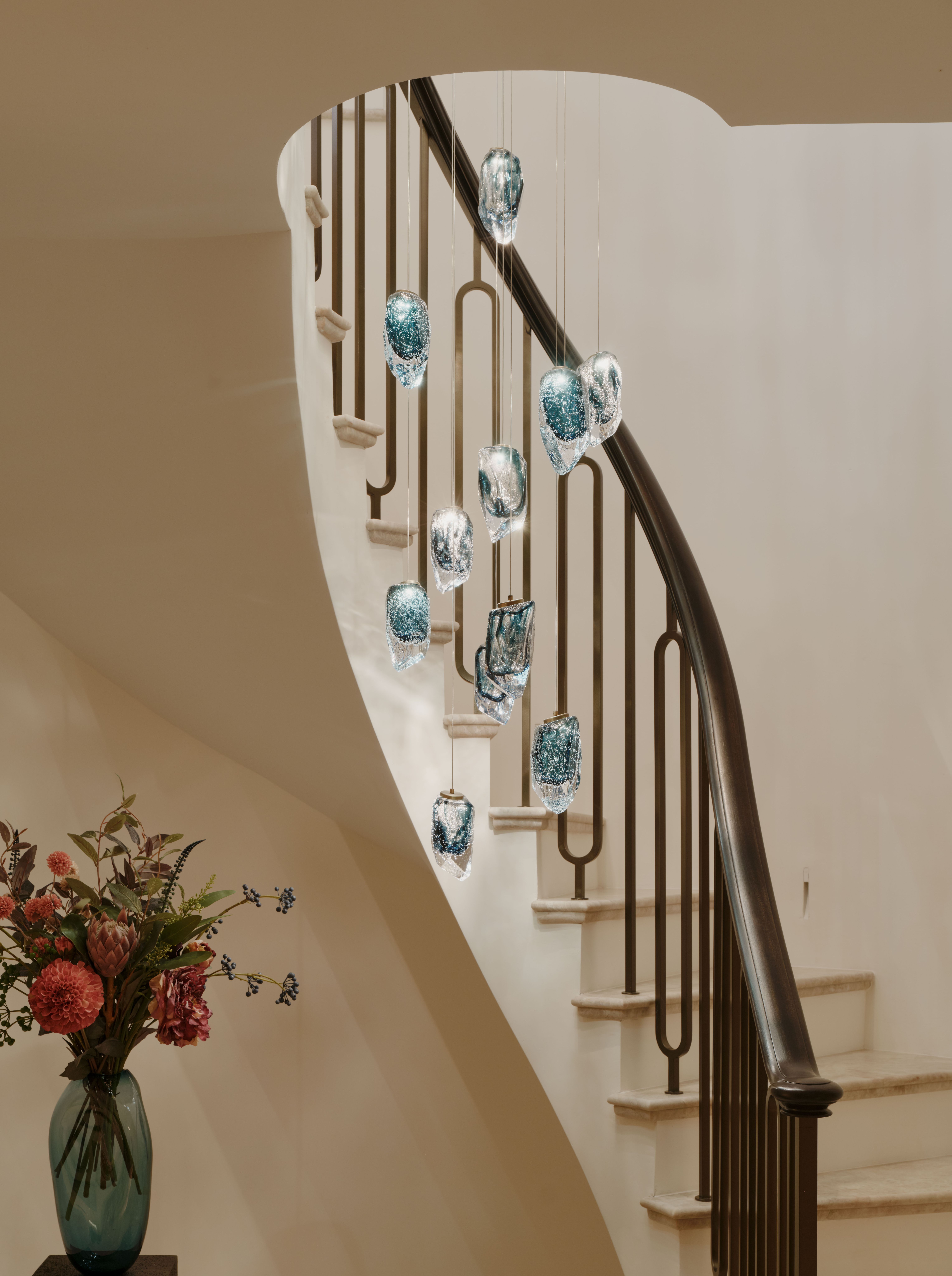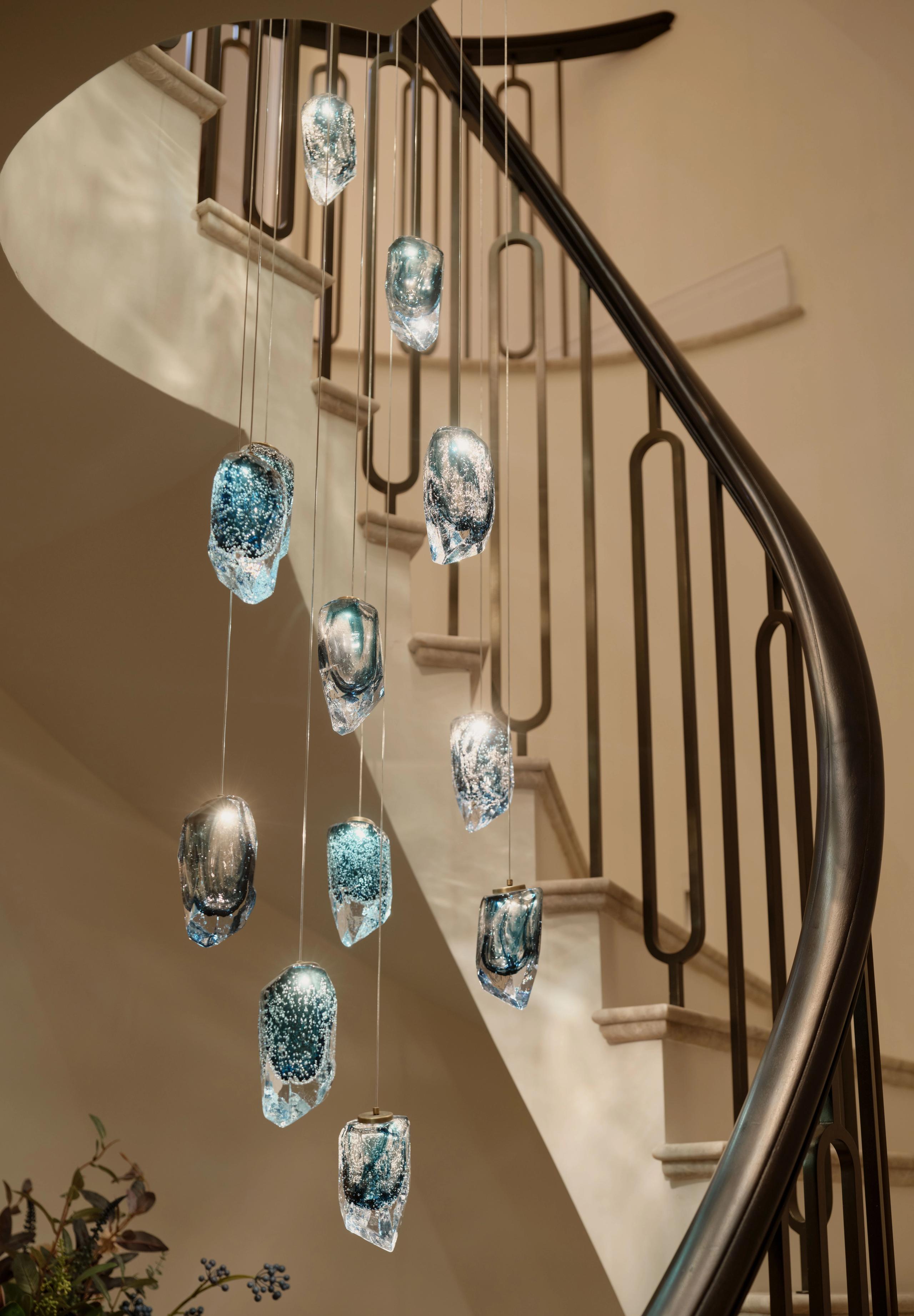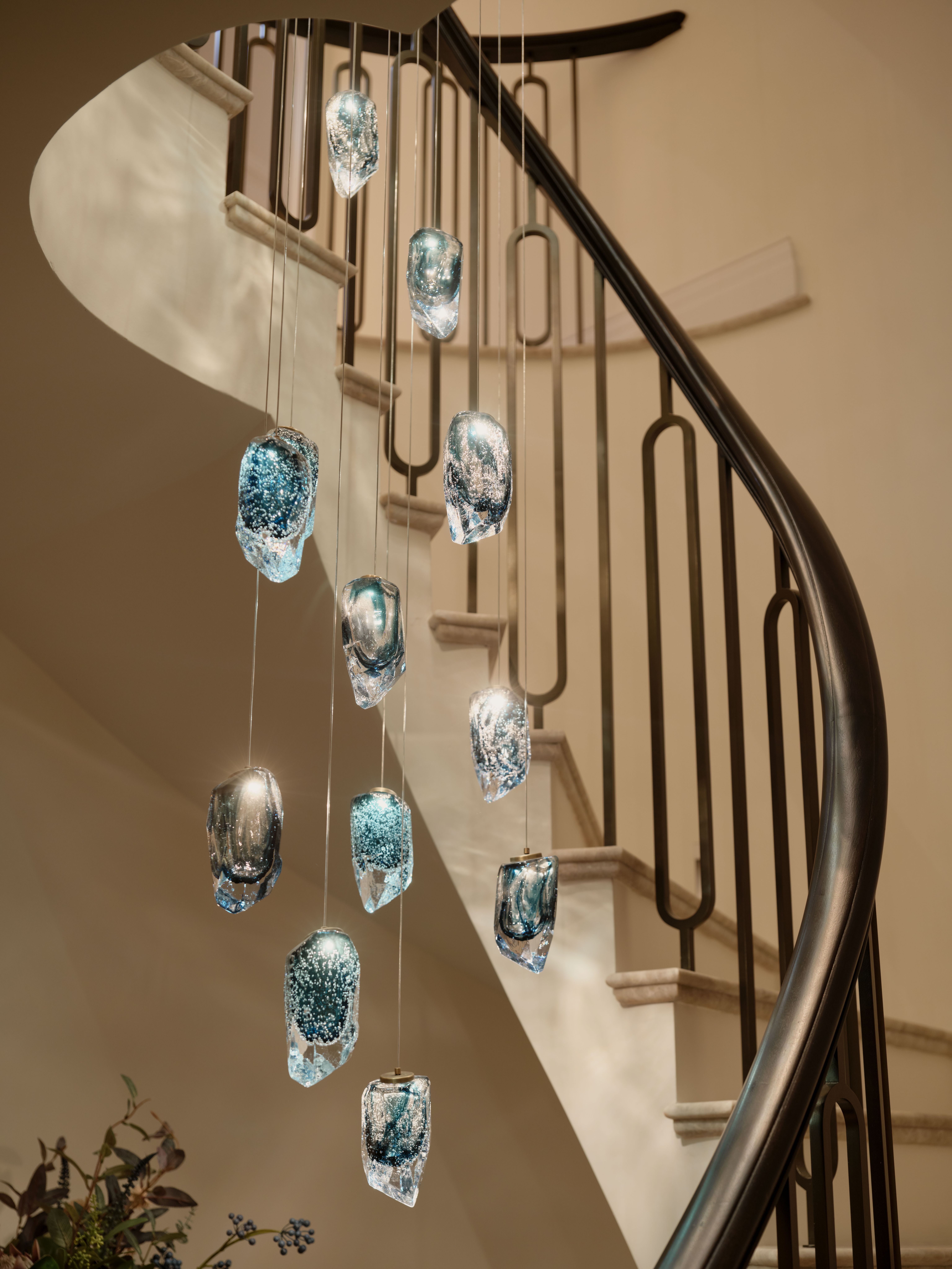 Crafted from our Glacier collection, this bespoke lighting installation showcases a unique combination of finishes and techniques developed for the project. Each hand-blown glass element was carefully customised by blending lagoon mist with a delicate soda finish.