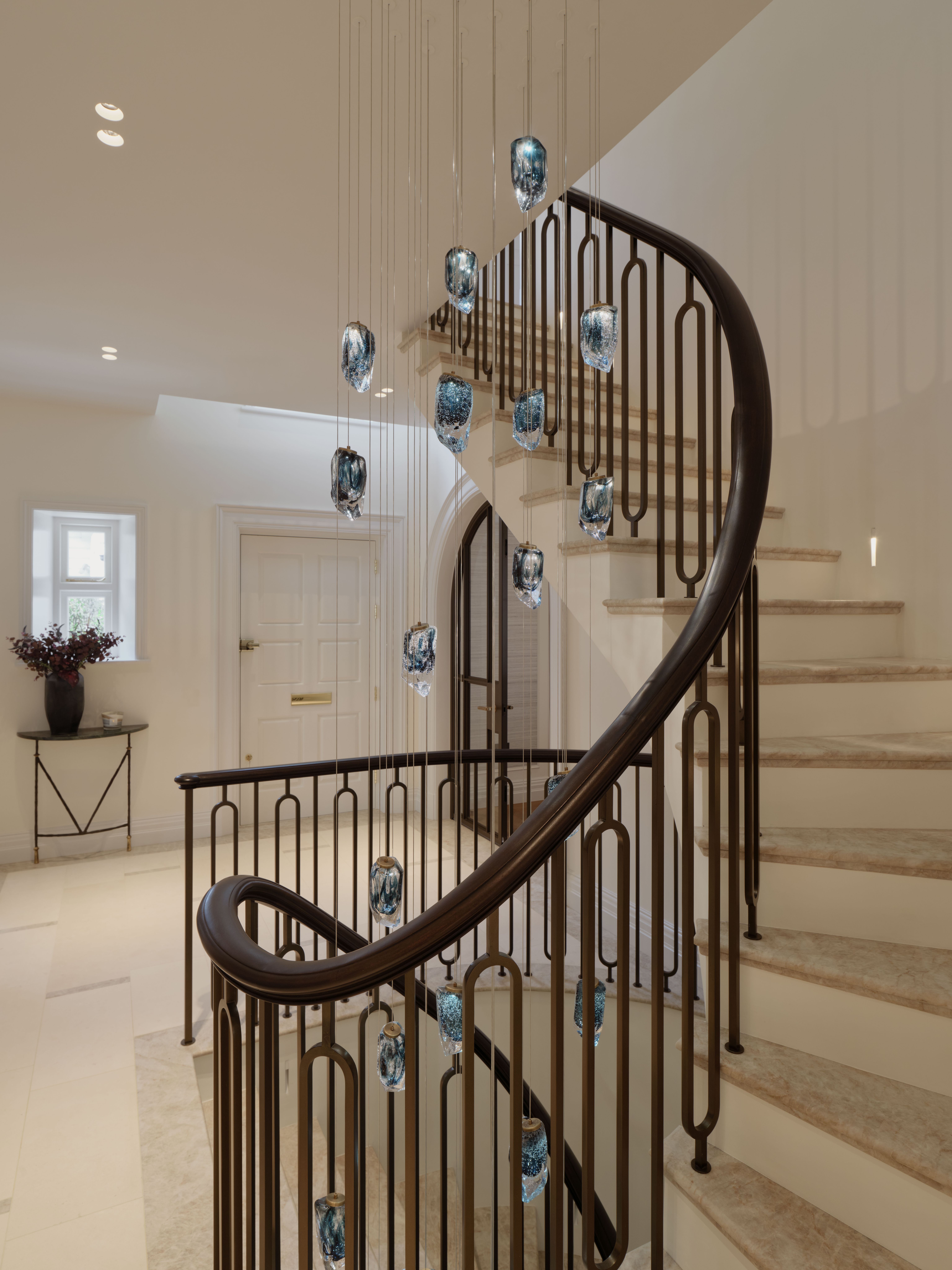 Located in the prestigious district of Knightsbridge, this luxury private residence reflects the refined character of one of London’s most exclusive neighbourhoods. Designed by Taylor Howes Design Studio as a home rooted in heritage yet tailored for contemporary living, the brief called for a bespoke staircase chandelier to elevate the architectural heart of the property.