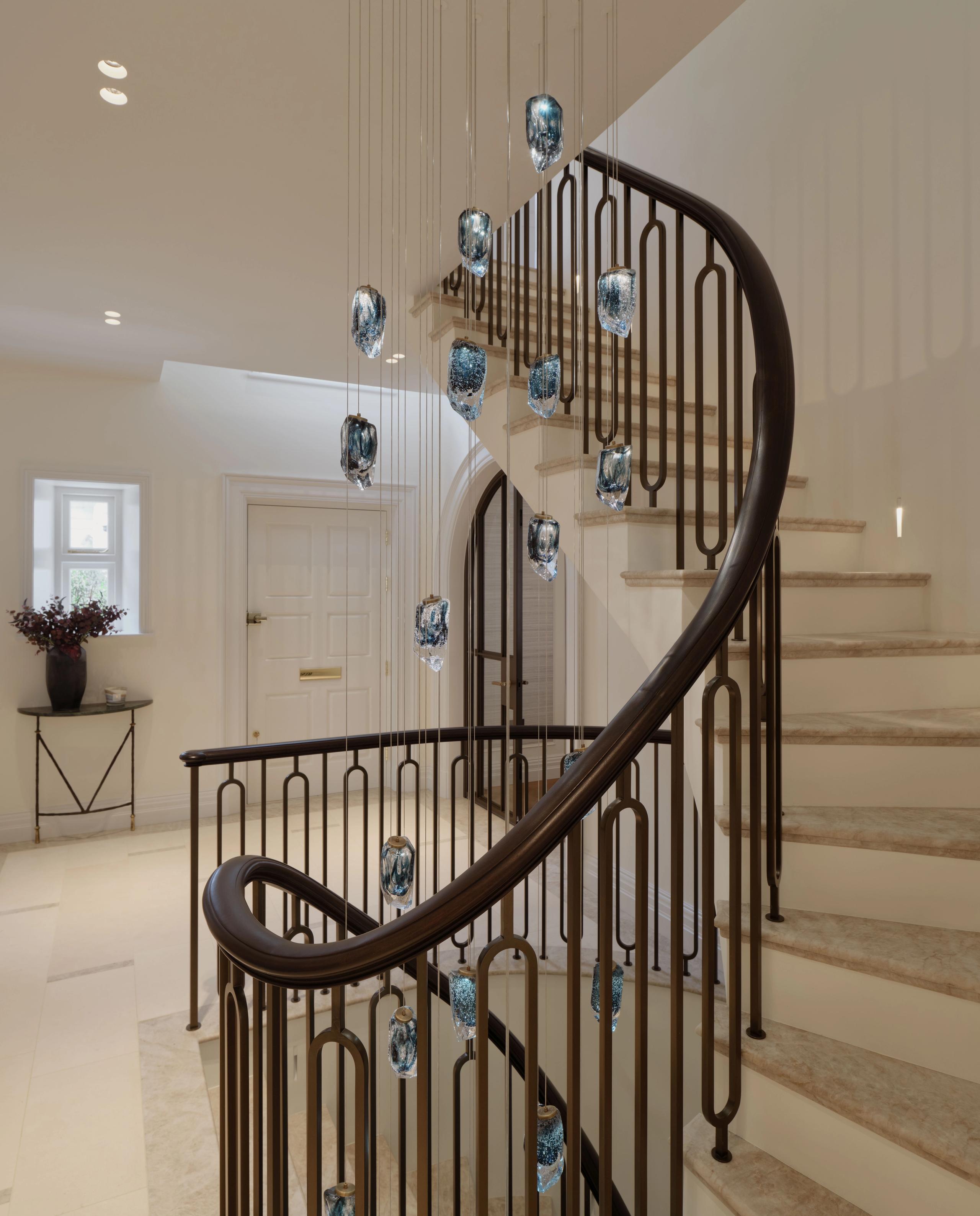 Designer Radek Brezar created the installation not as a decorative addition, but as an integral architectural element. The lighting interacts seamlessly with the bespoke curved staircase, Taj Mahal marble steps, and contemporary bronze balustrade.