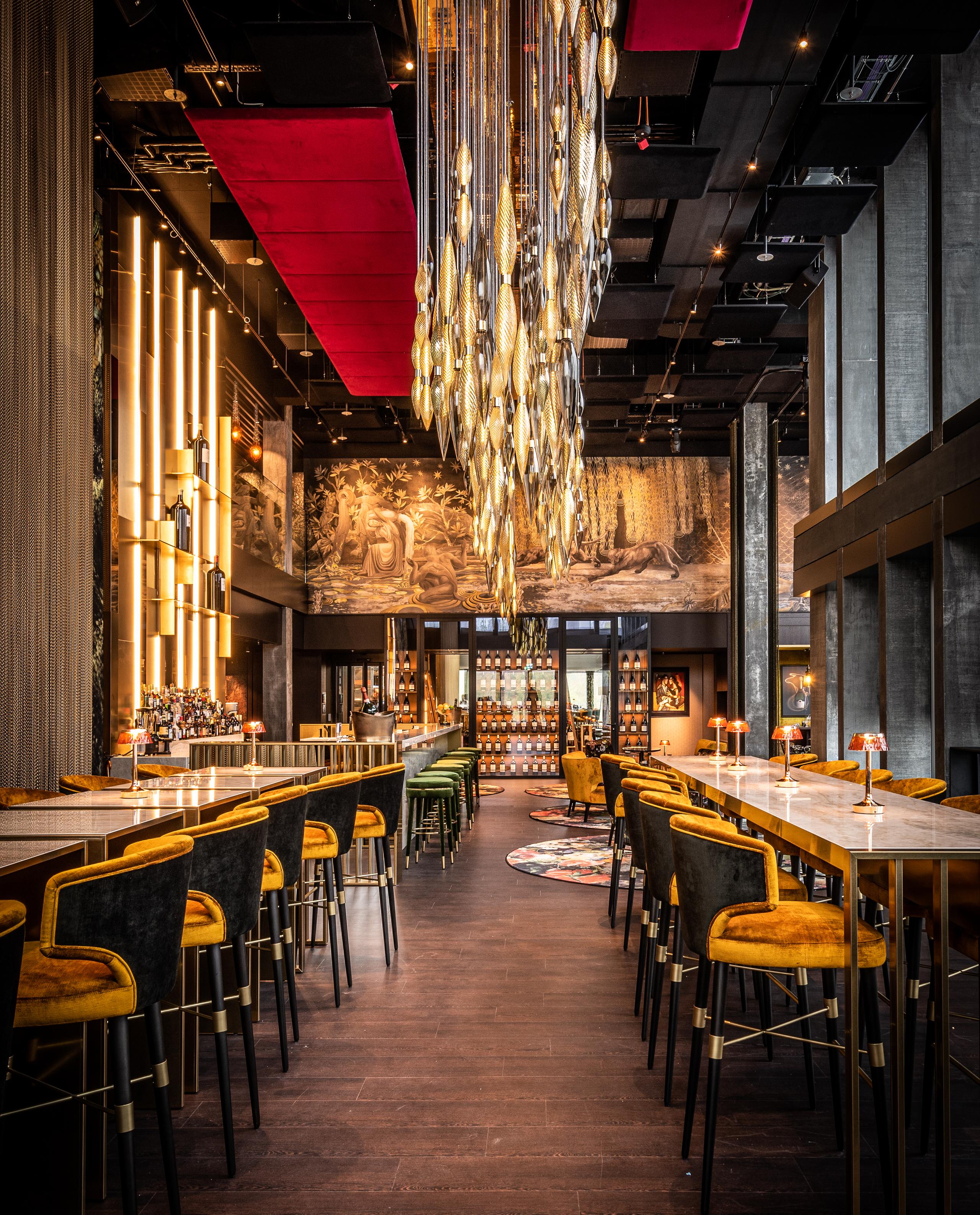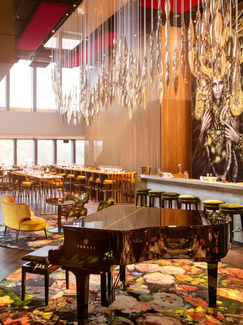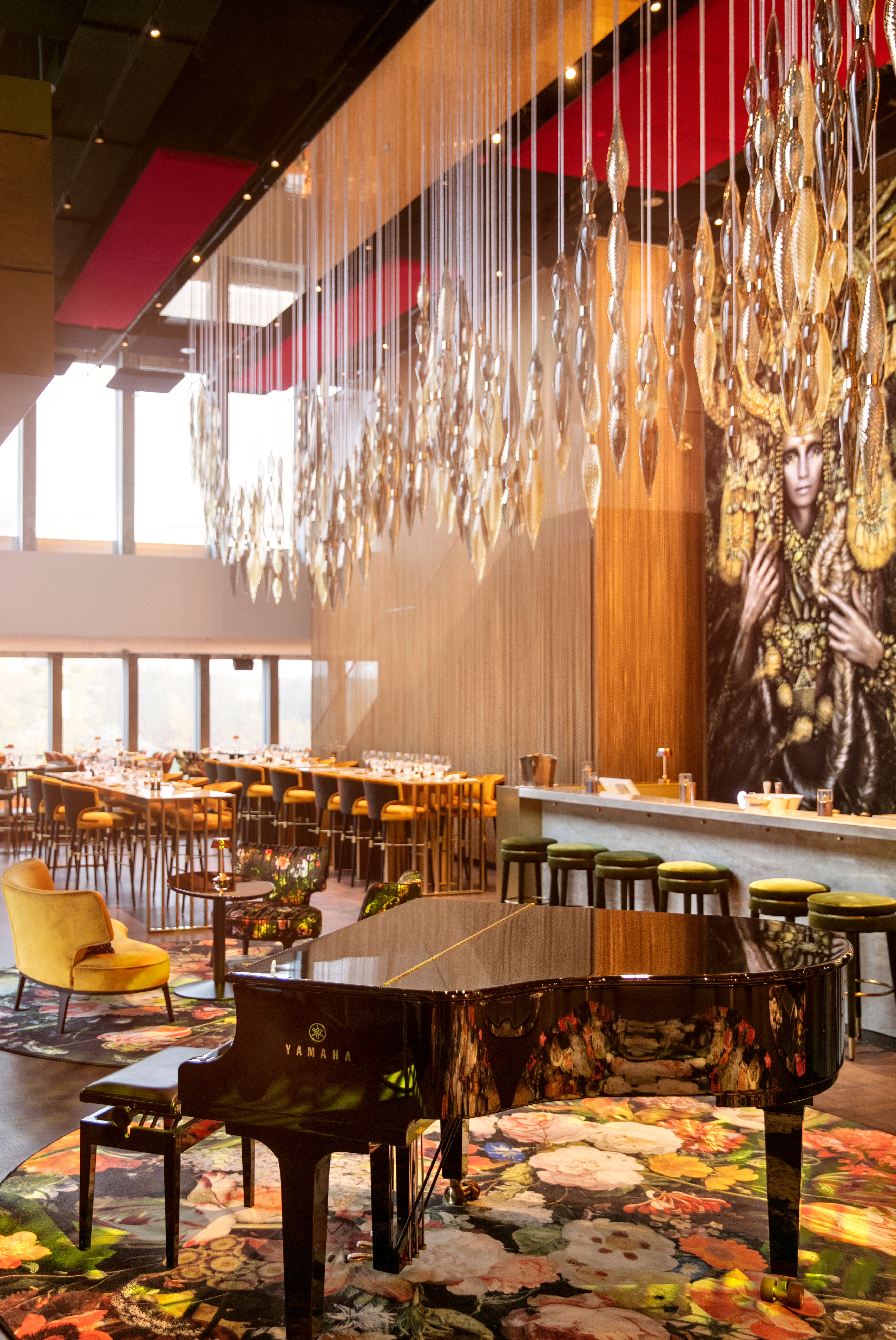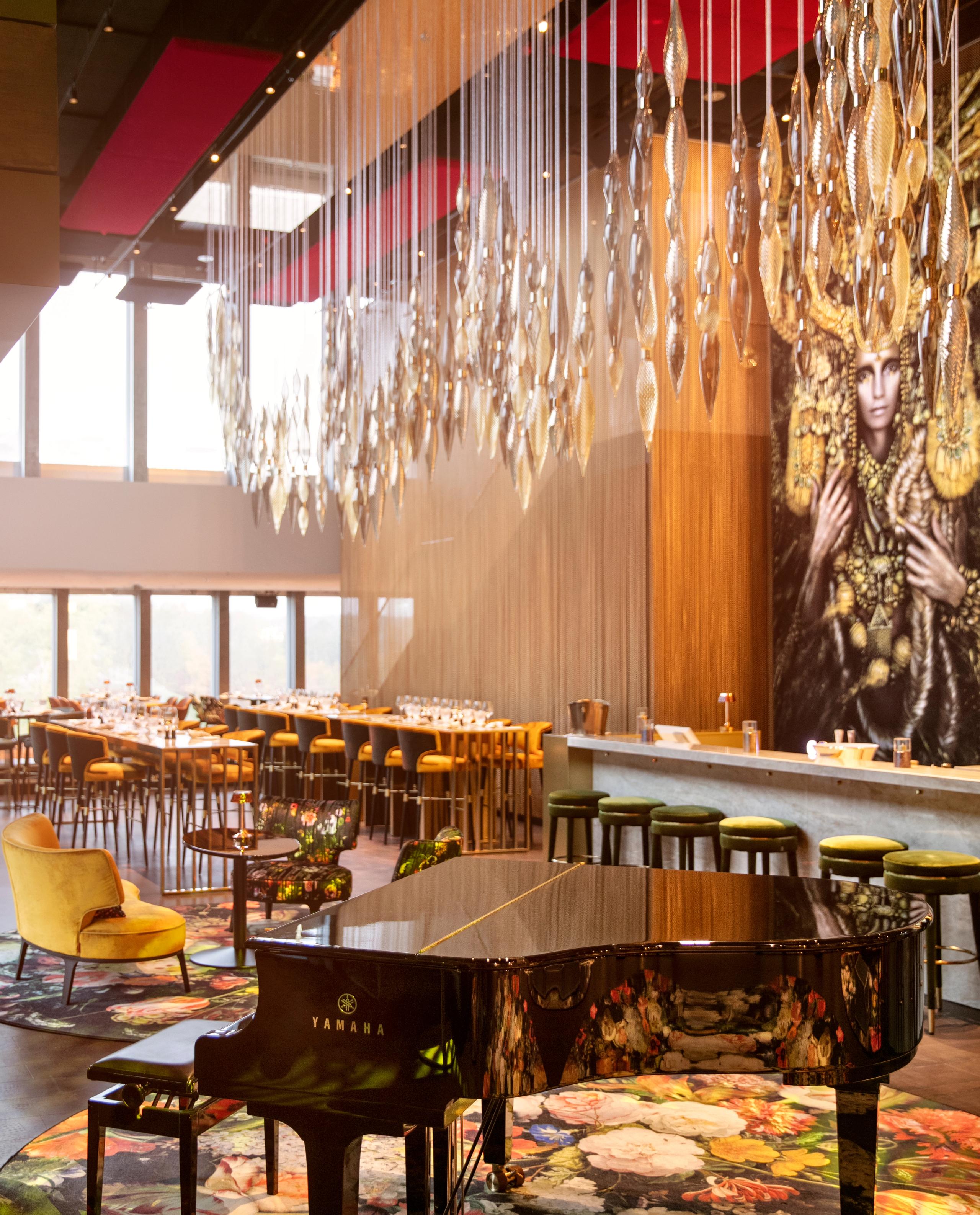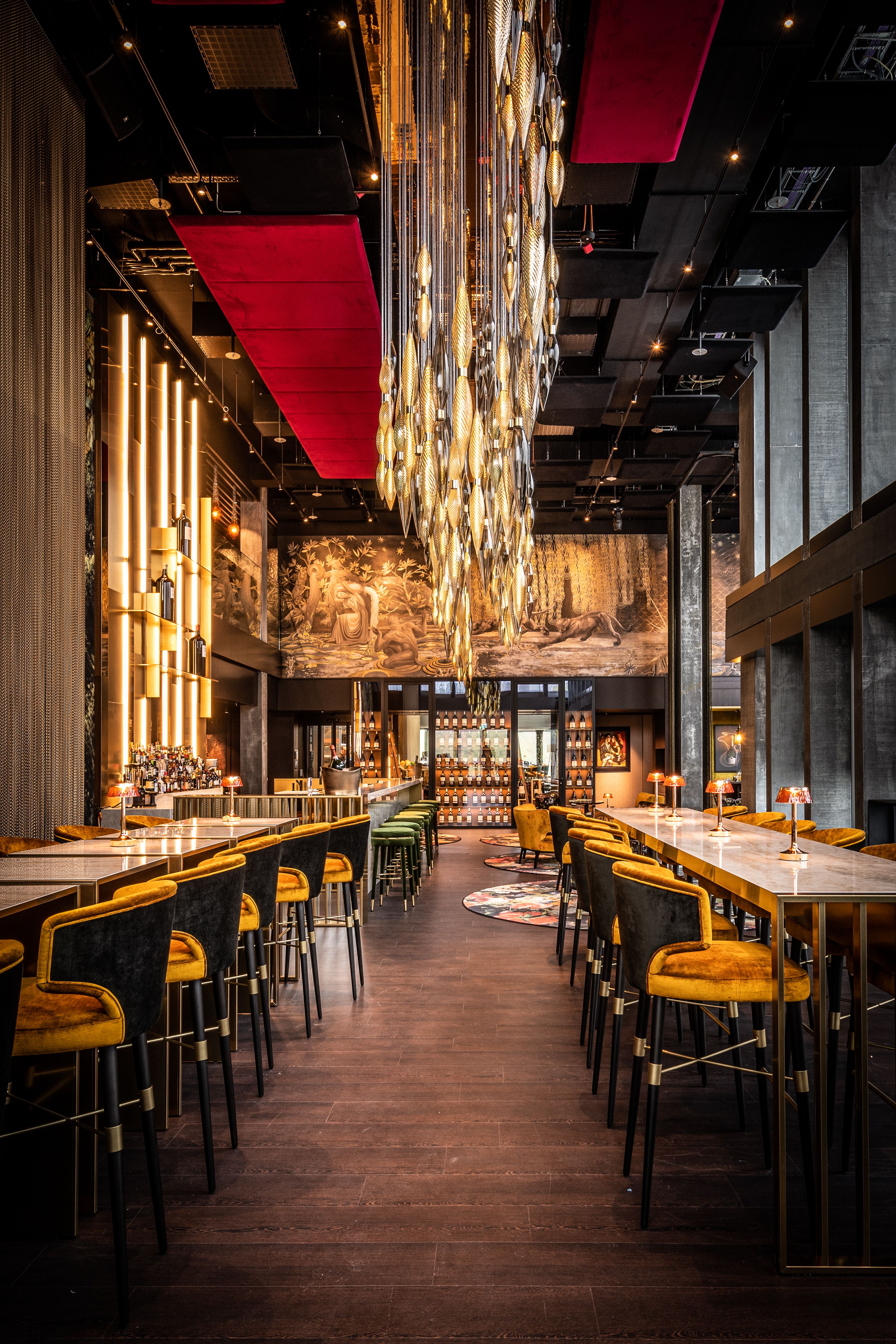 The OPERA installation runs 12 metres through the bar and restaurant. It is made from hand-blown glass components, suspended from the ceiling, in decadent golden hues.