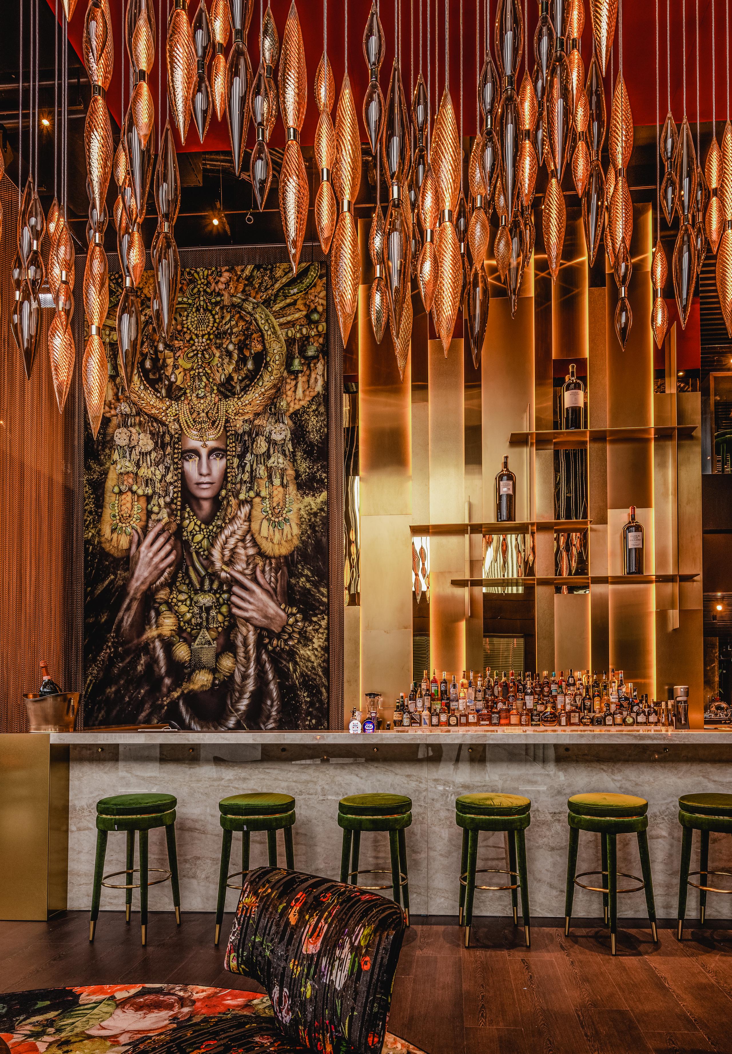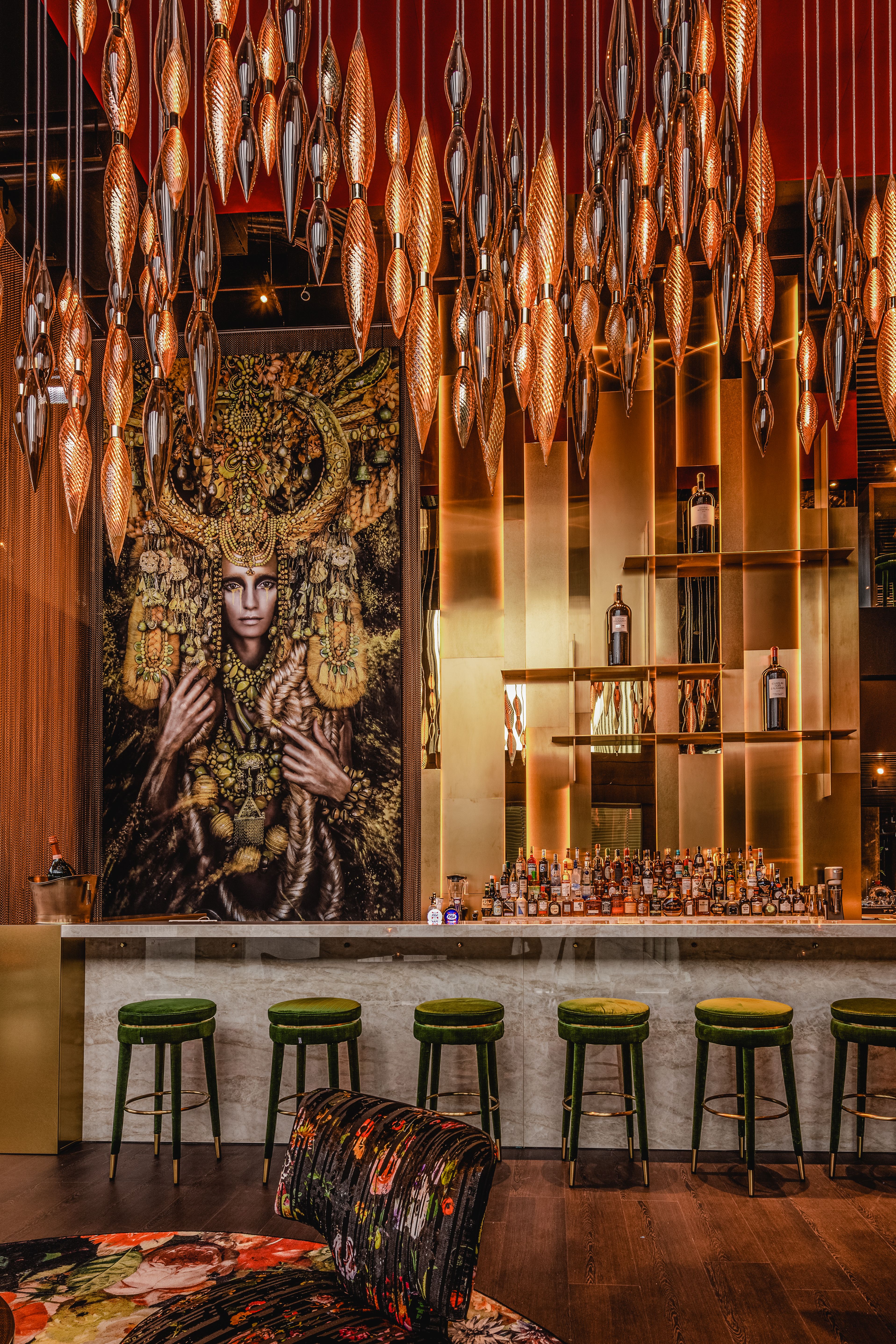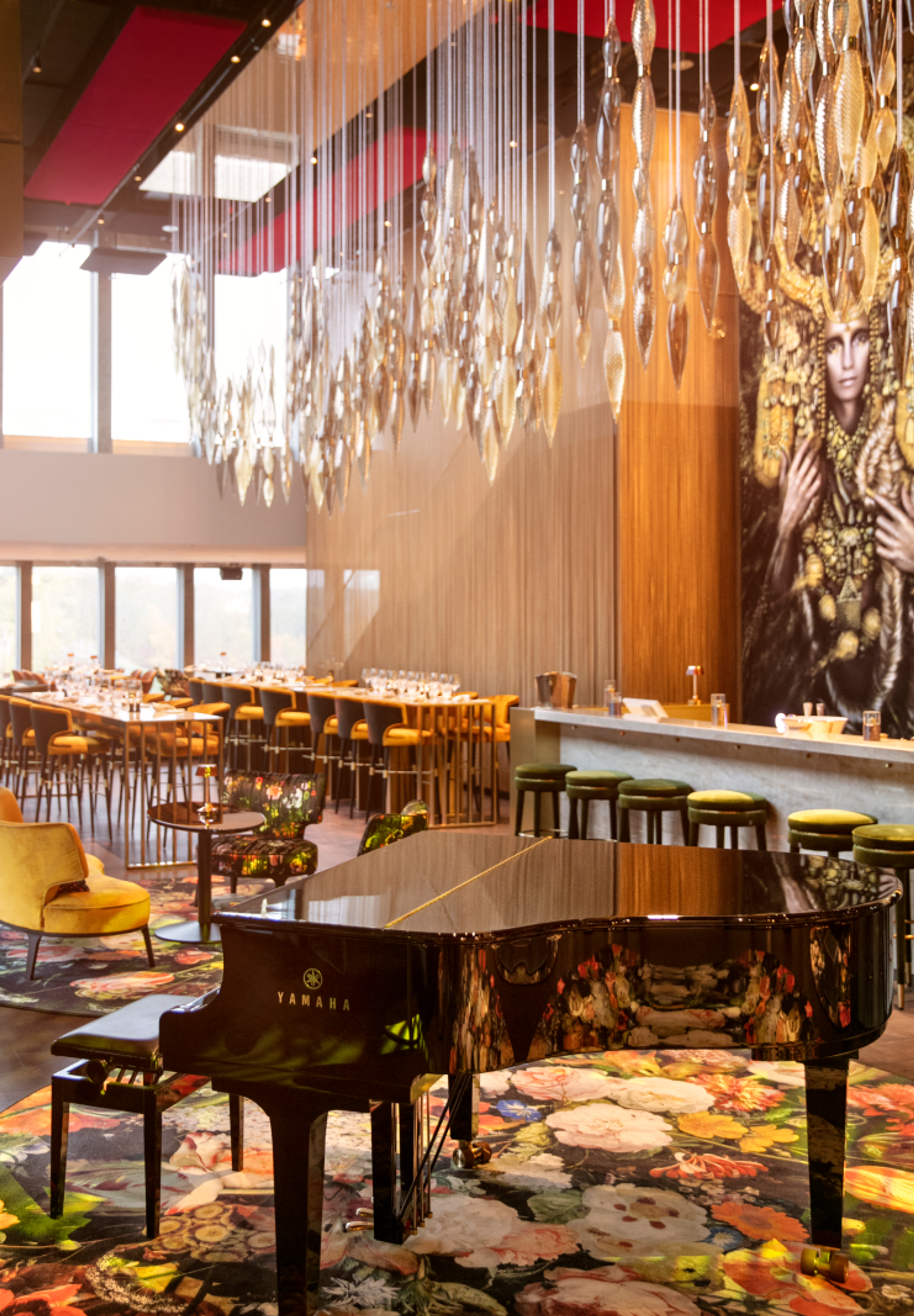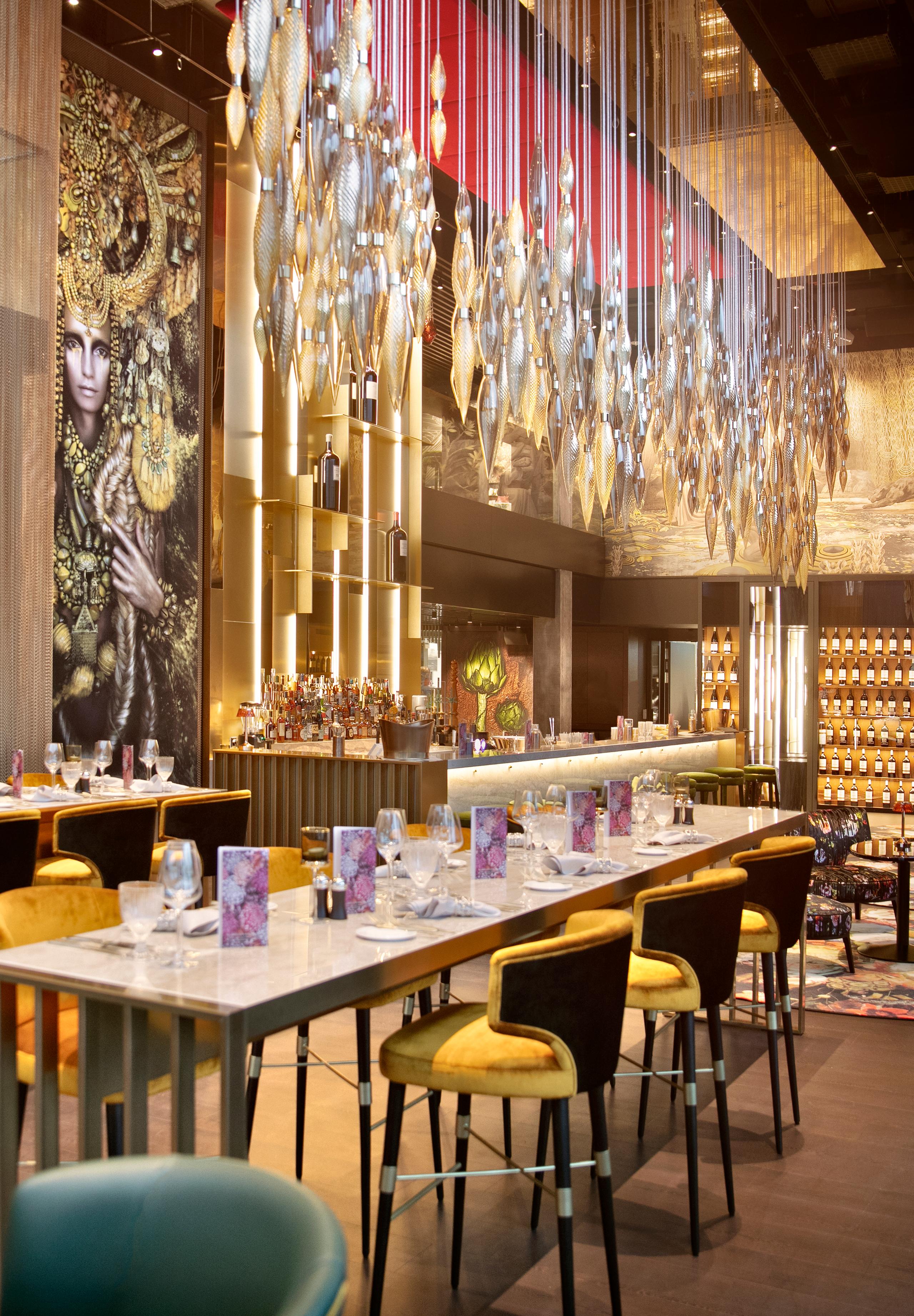 The OPERA installation runs 12 metres through the bar and restaurant. It is made from hand-blown glass components, suspended from the ceiling, in decadent golden hues.