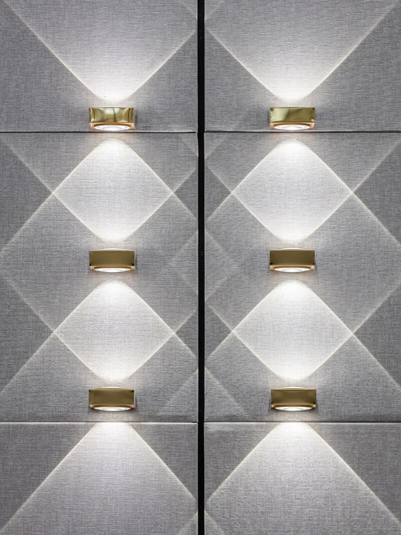 Alongside these pieces sit sleek wall lights finished with mirror effect to angle the light and create a pattern around the interior.