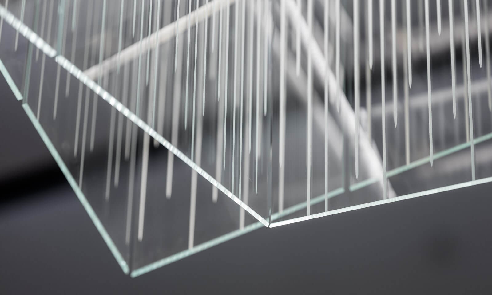 Grand chandeliers formed of modern angled structures were specially created for the diamond ballroom. Each is made from premium flat transparent glass, flawlessly finished to elegantly illuminate the space.
