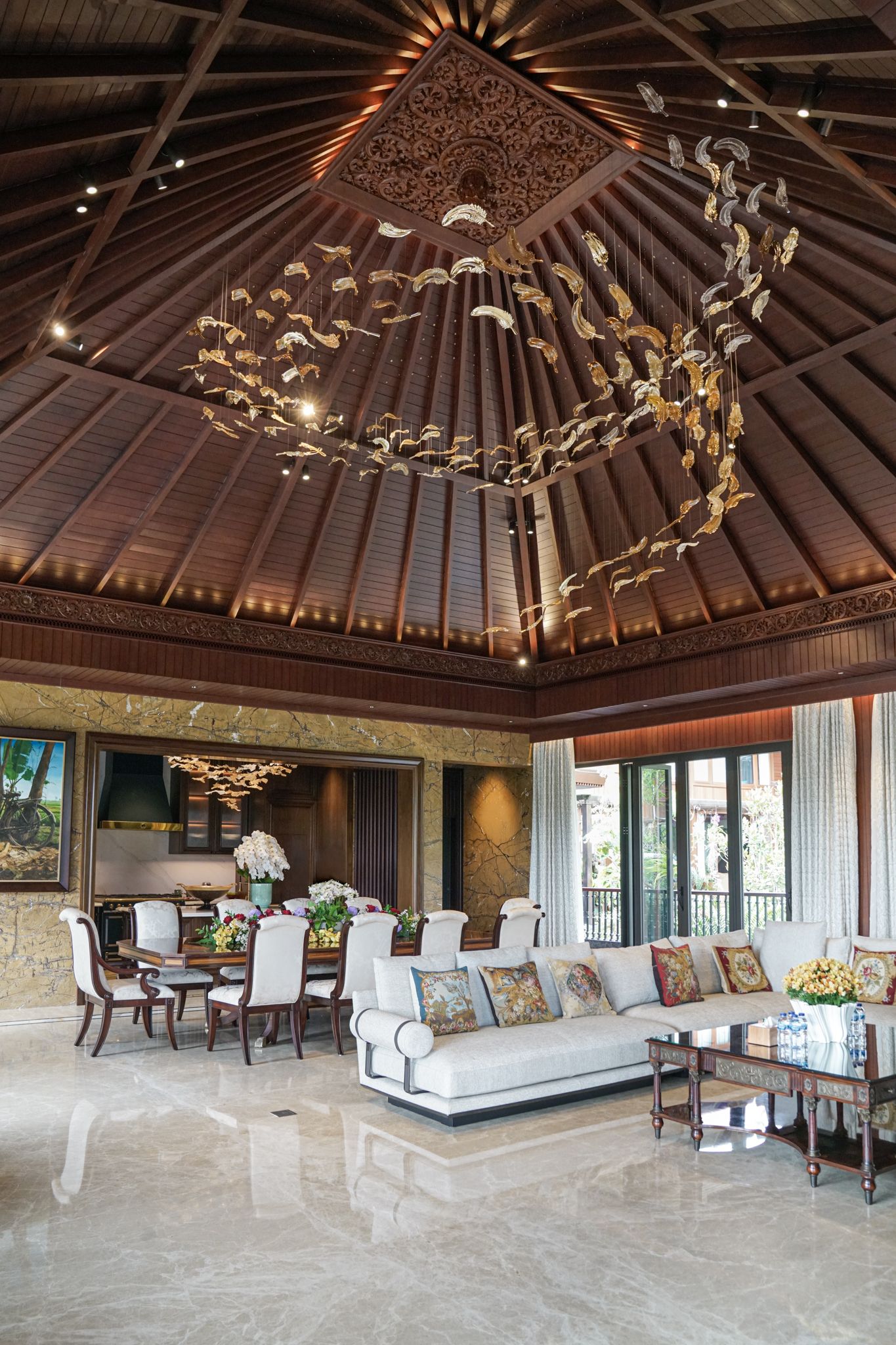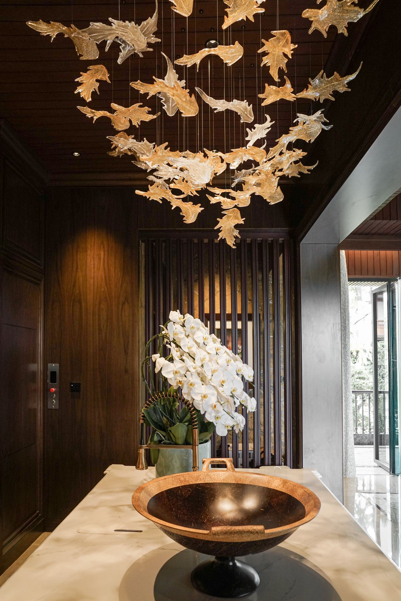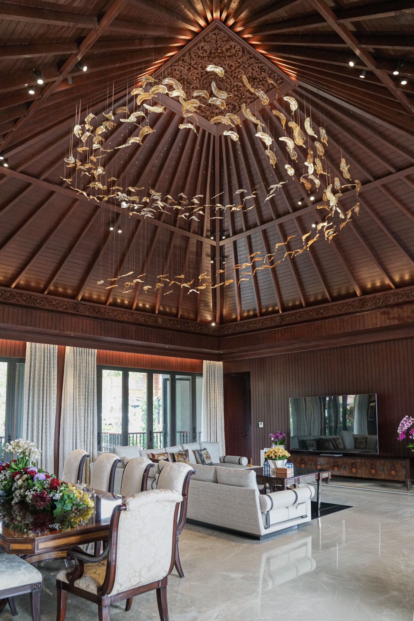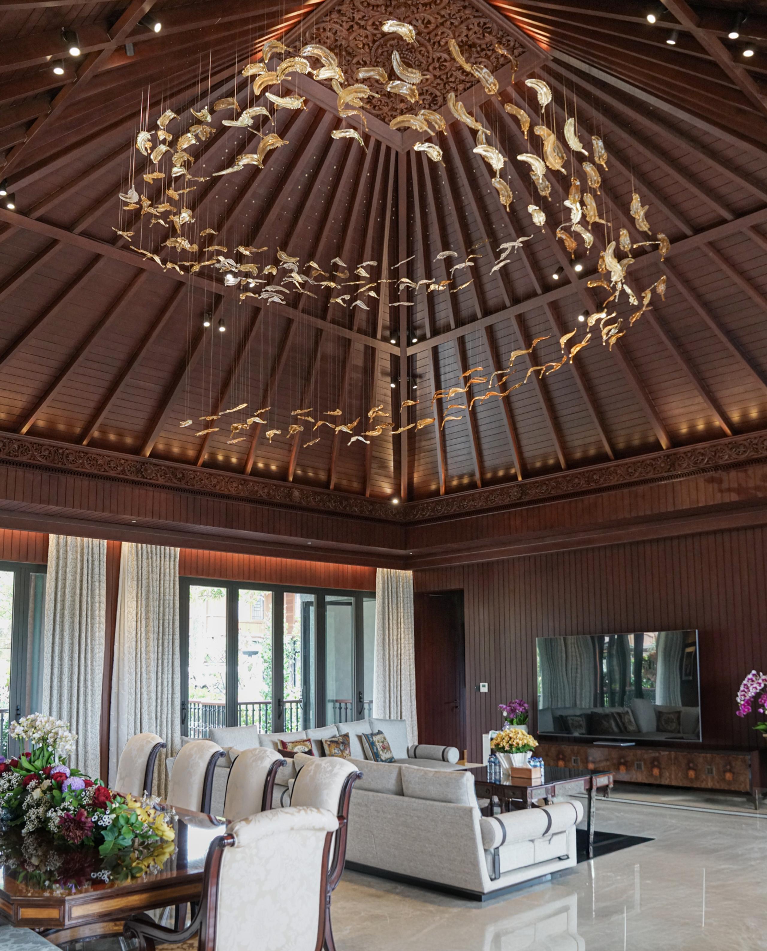 This private villa in Jakarta features two custom chandeliers from Sans Souci, selected to enhance the home’s warm, earthy palette and natural wood finishes.