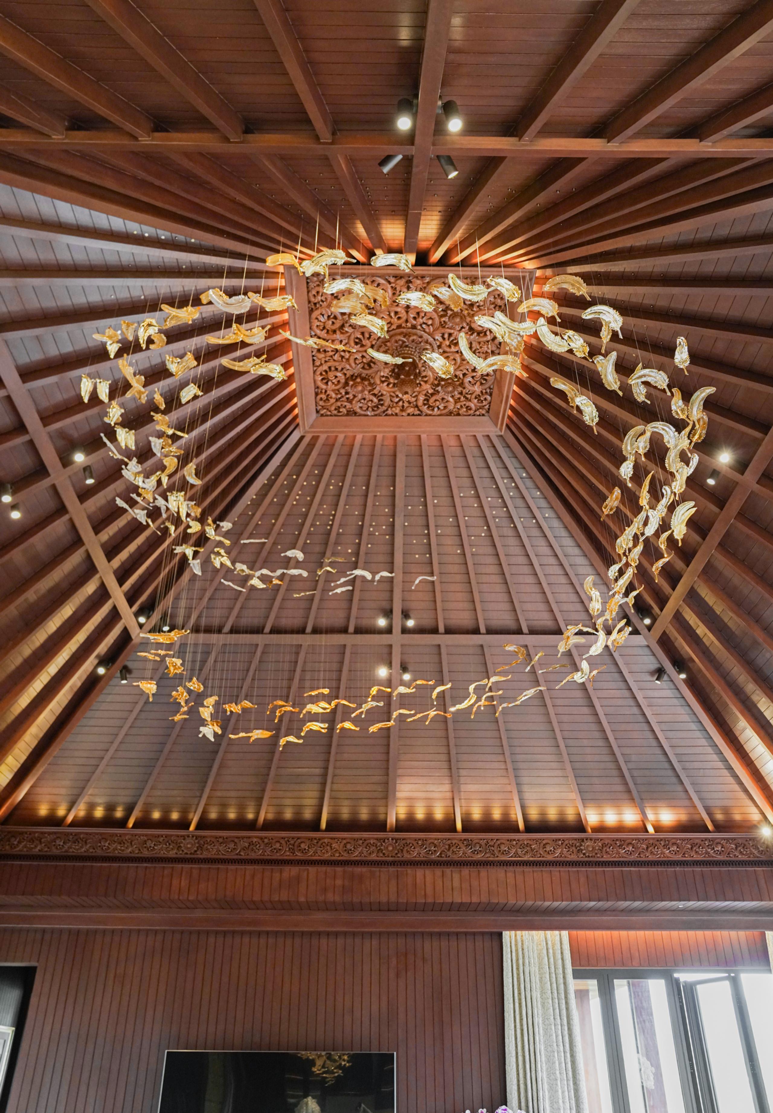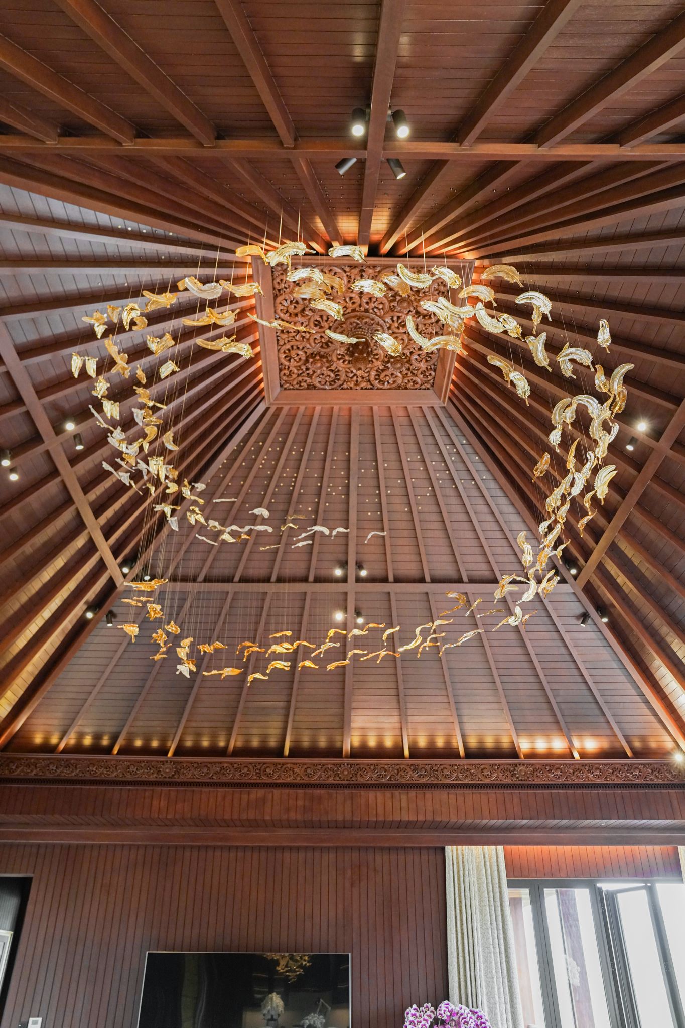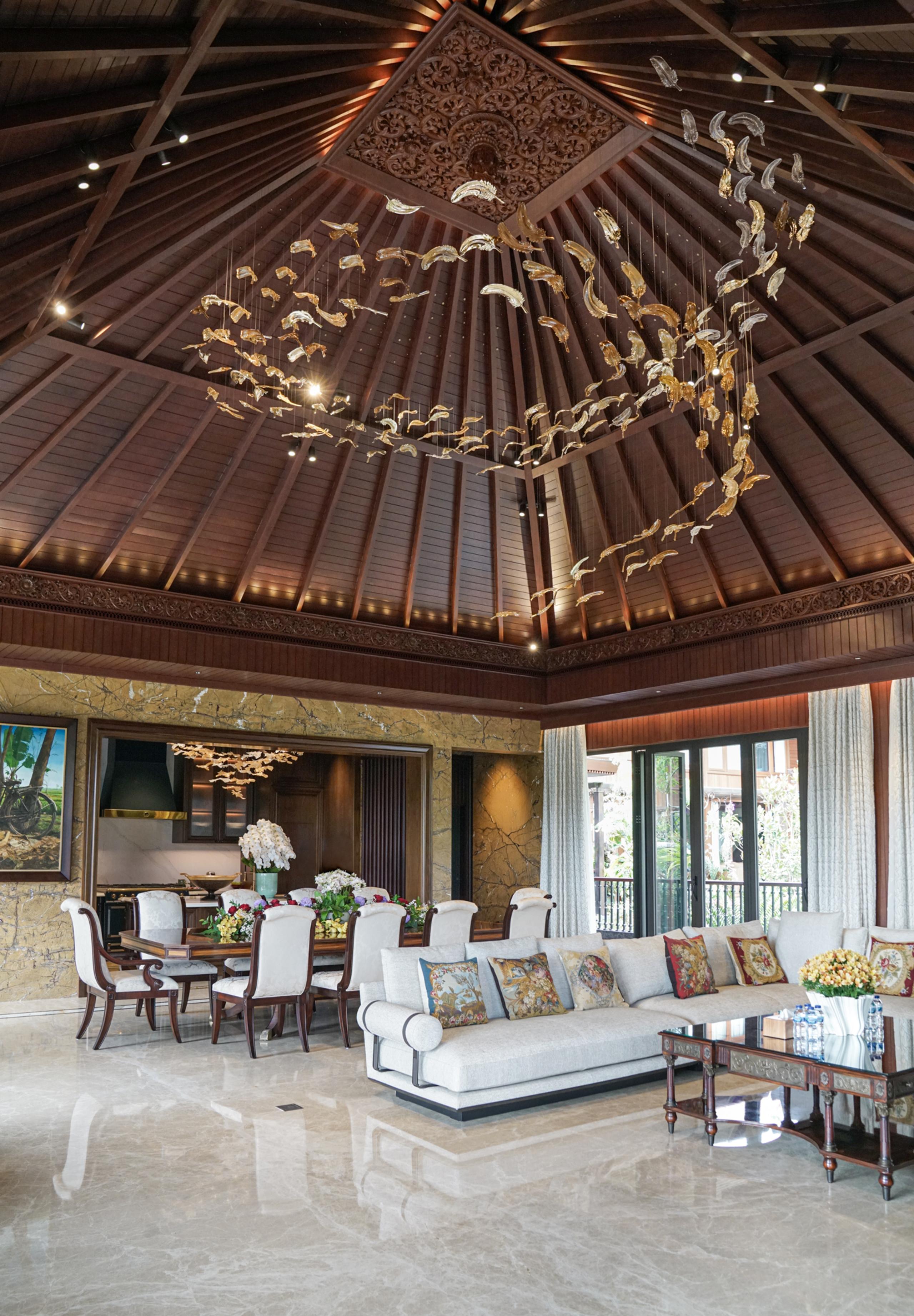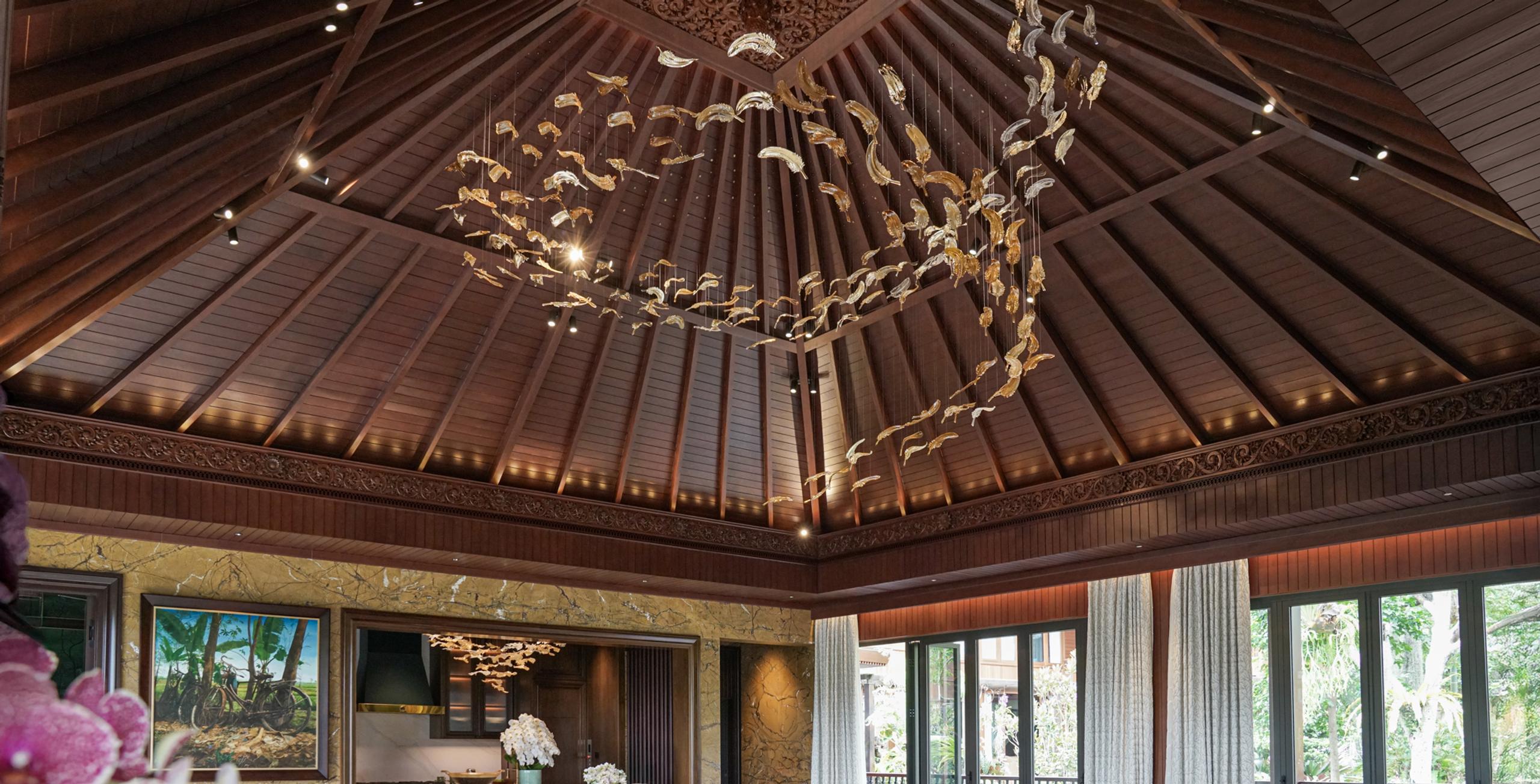 This private villa in Jakarta features two custom chandeliers from Sans Souci, selected to enhance the home’s warm, earthy palette and natural wood finishes.