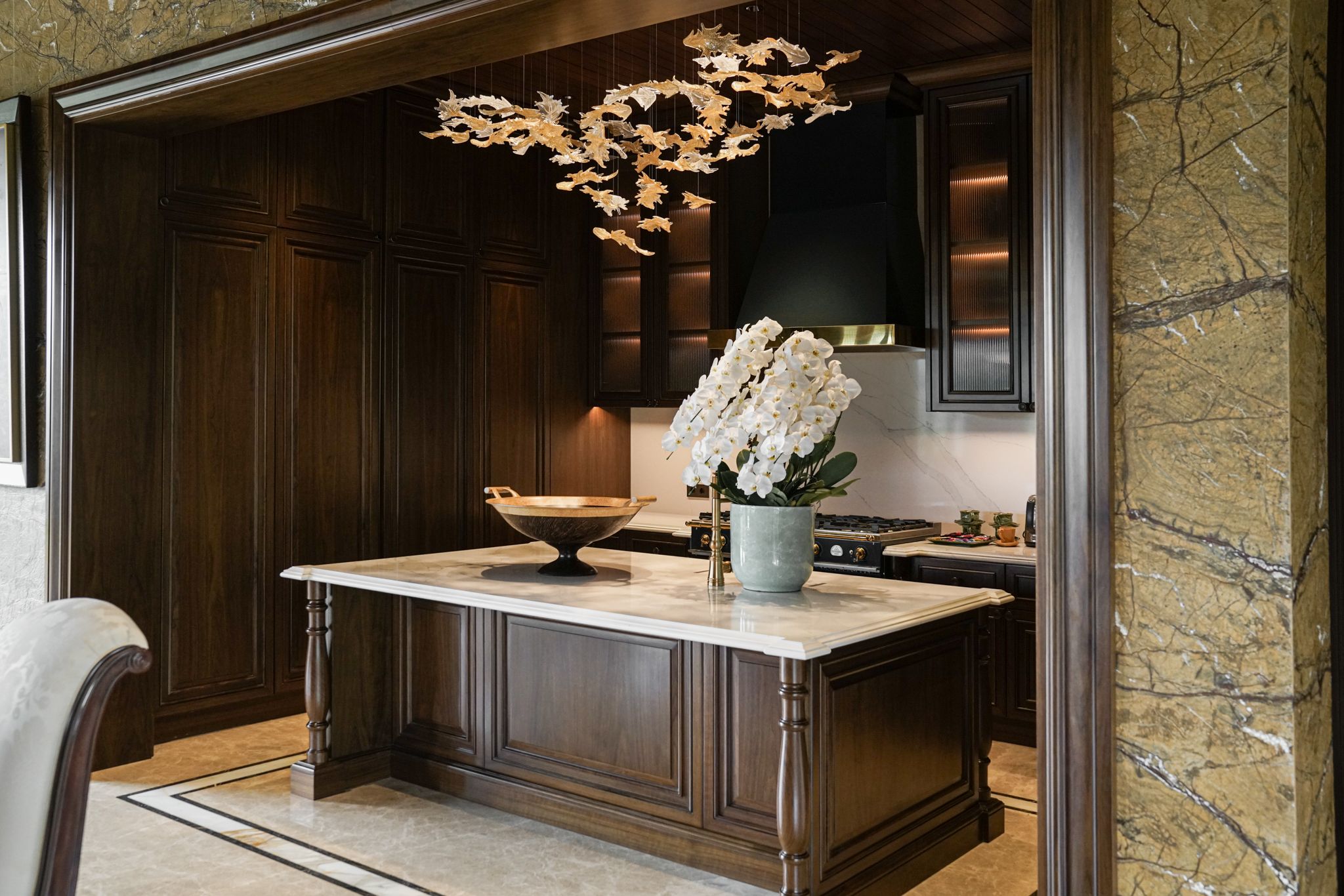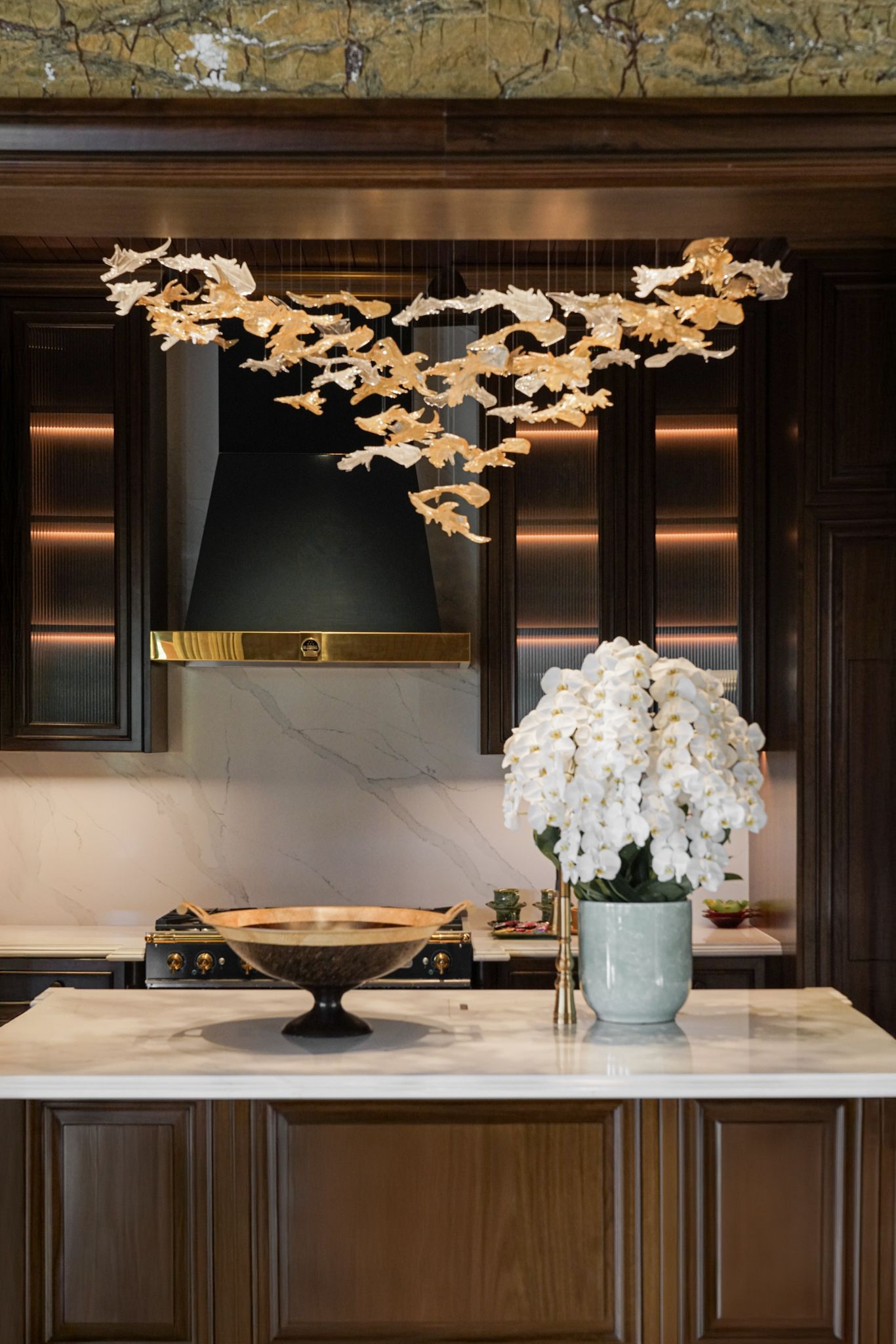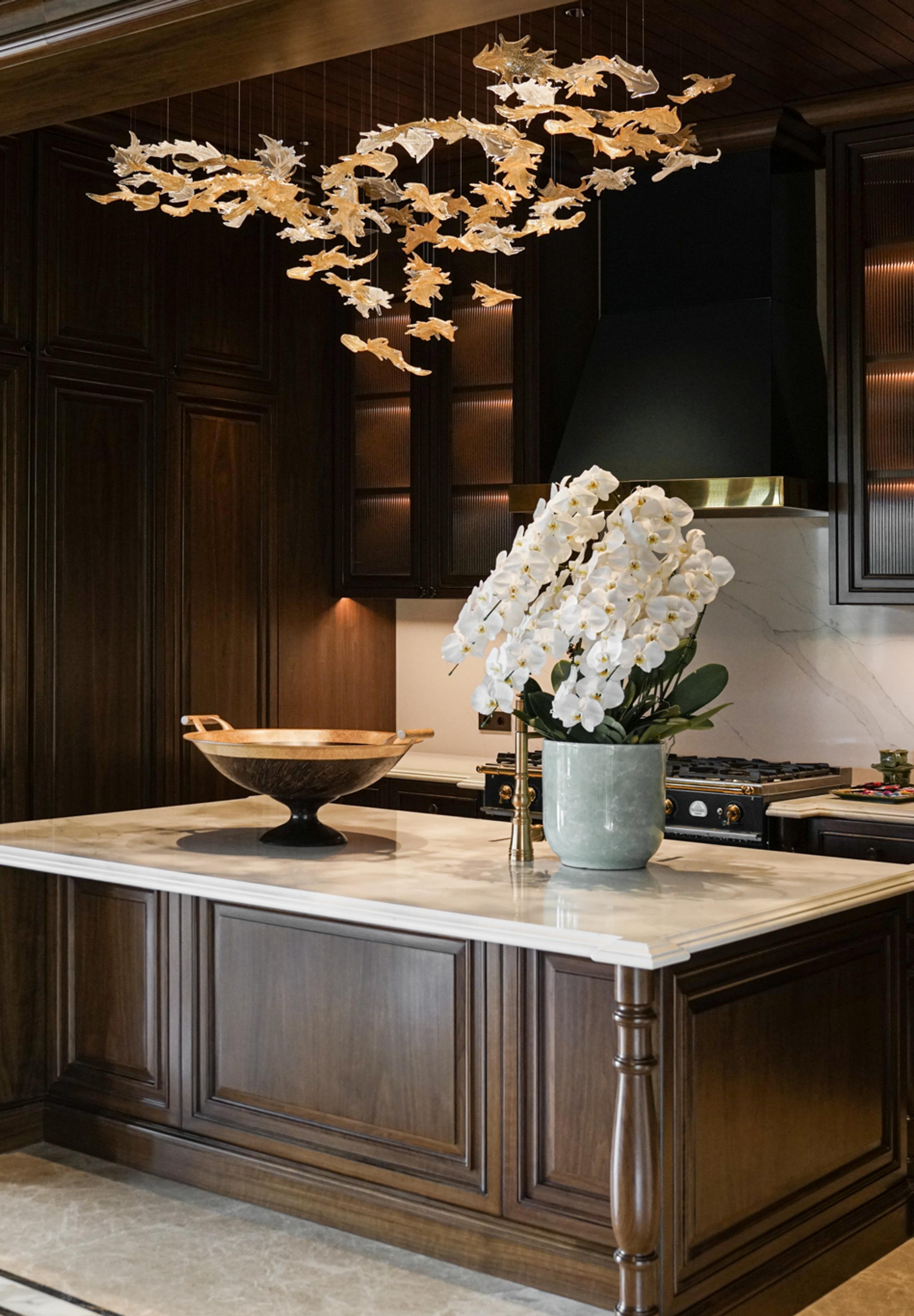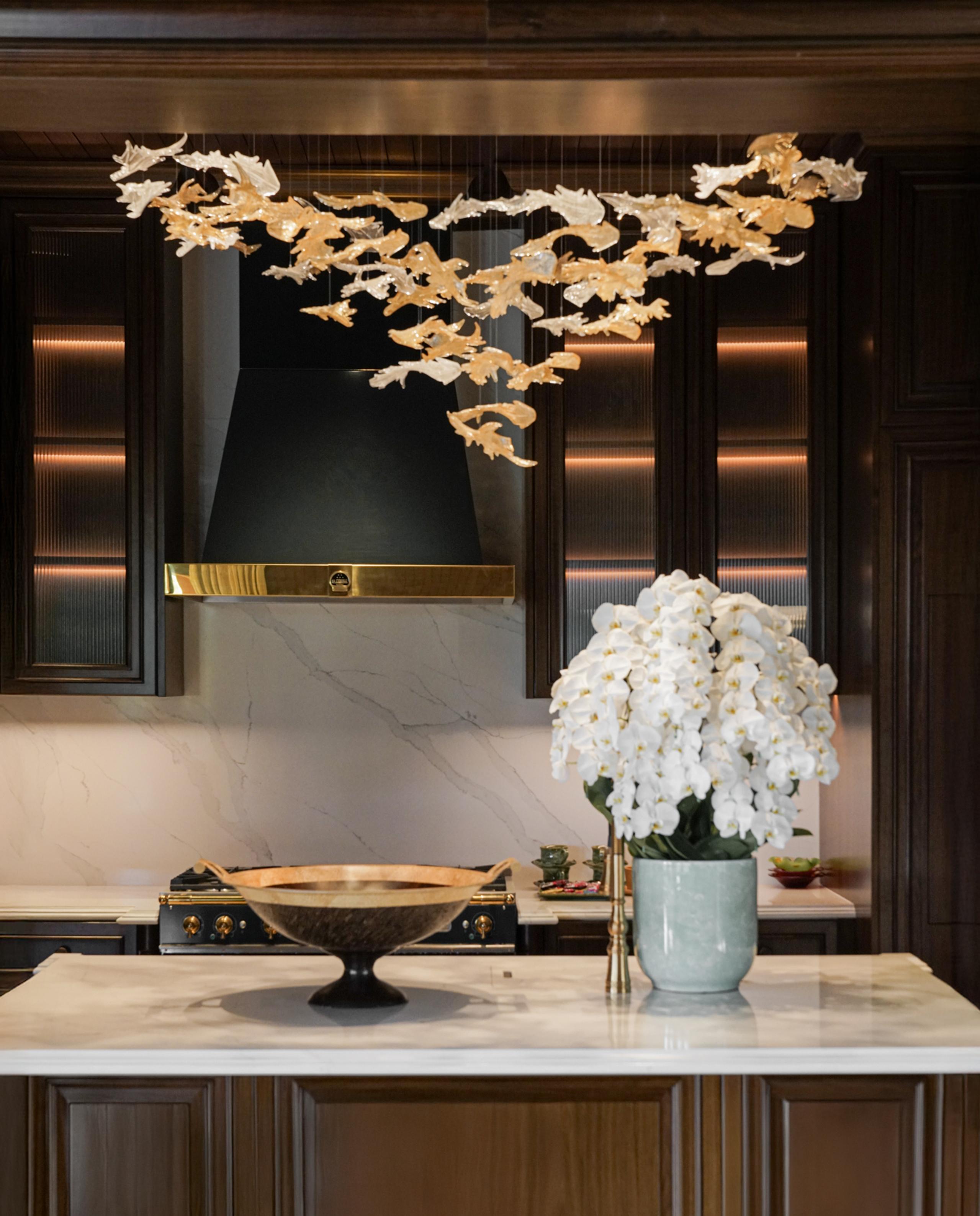 Above the central kitchen island, the Flying Leaves chandelier introduces a subtle flow of movement. Crafted in light amber and clear crystal with a soft mica accent, the piece complements the wooden cabinetry and surrounding materials. Its placement creates a focal point that ties the kitchen together, resulting in a refined and unified space.