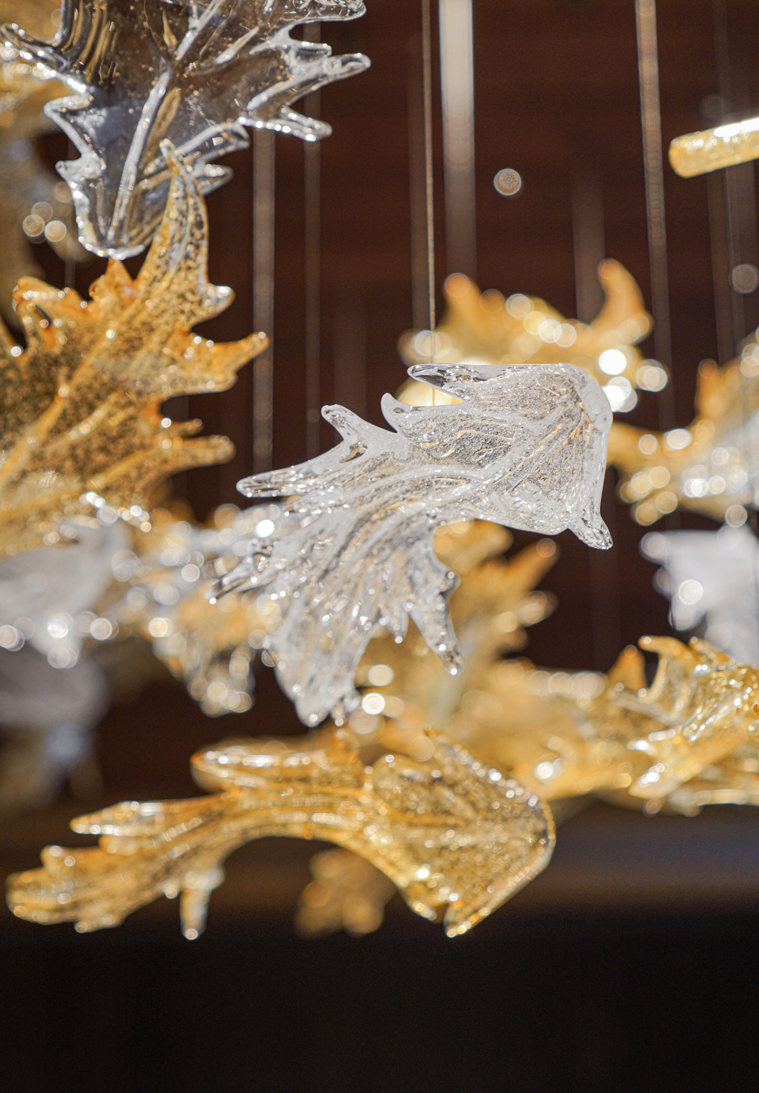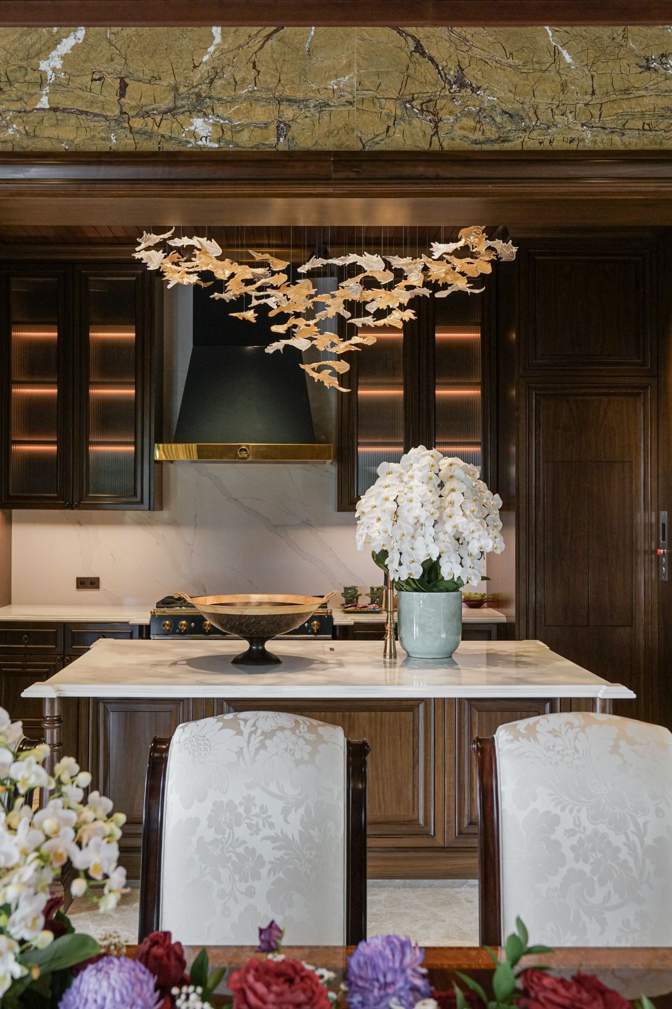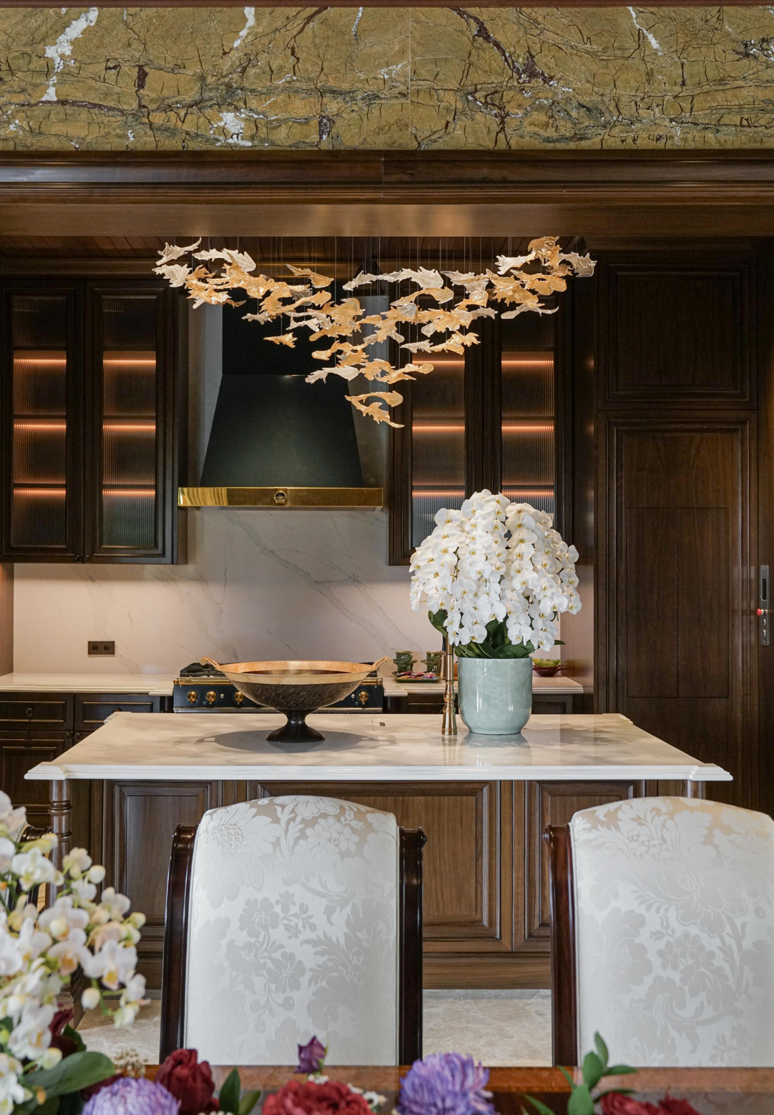 Above the central kitchen island, the Flying Leaves chandelier introduces a subtle flow of movement. Crafted in light amber and clear crystal with a soft mica accent, the piece complements the wooden cabinetry and surrounding materials. Its placement creates a focal point that ties the kitchen together, resulting in a refined and unified space.
