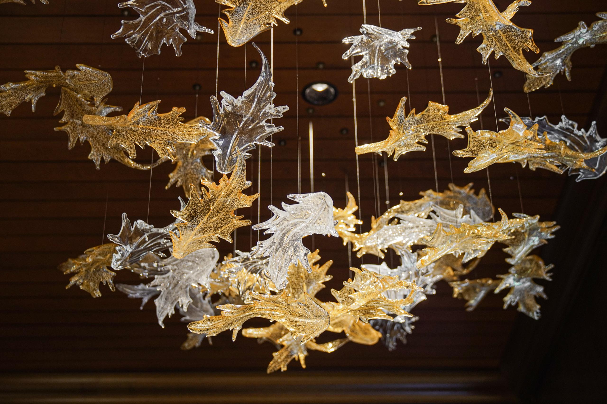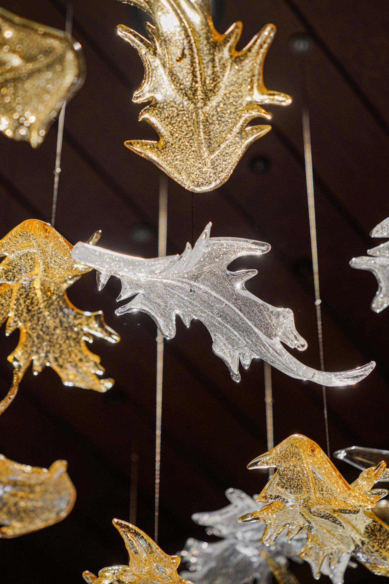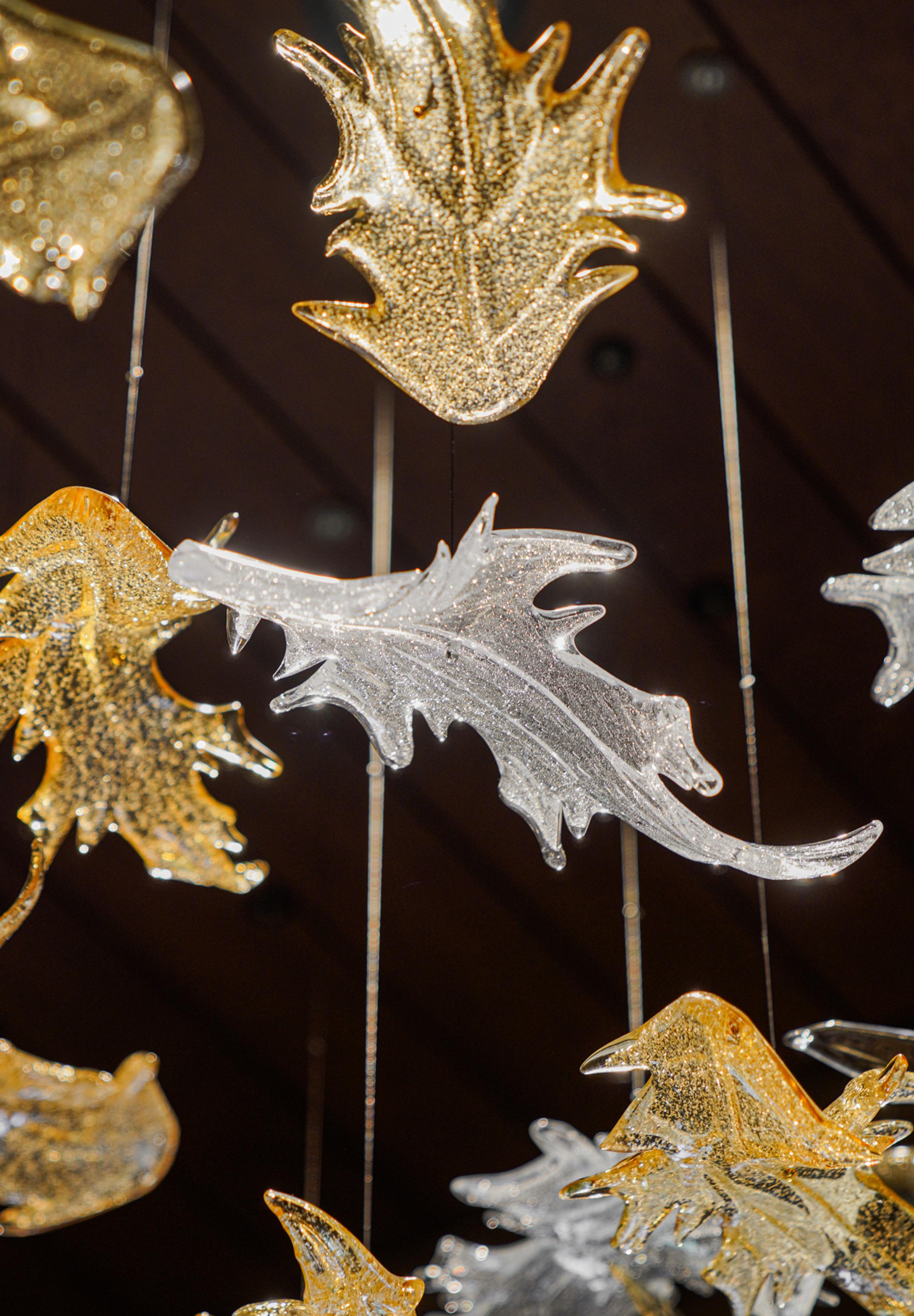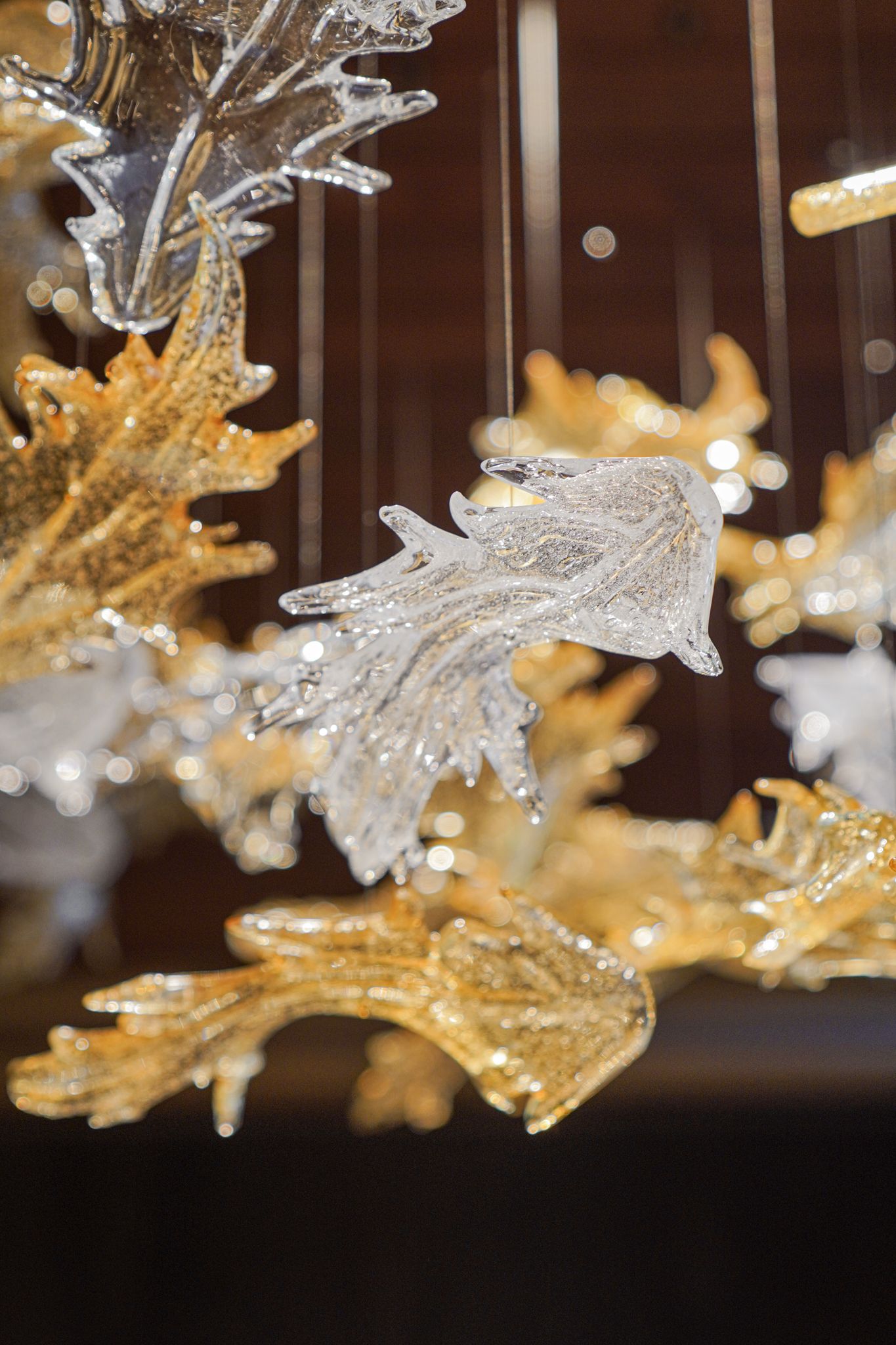 Above the central kitchen island, the Flying Leaves chandelier introduces a subtle flow of movement. Crafted in light amber and clear crystal with a soft mica accent, the piece complements the wooden cabinetry and surrounding materials. Its placement creates a focal point that ties the kitchen together, resulting in a refined and unified space.