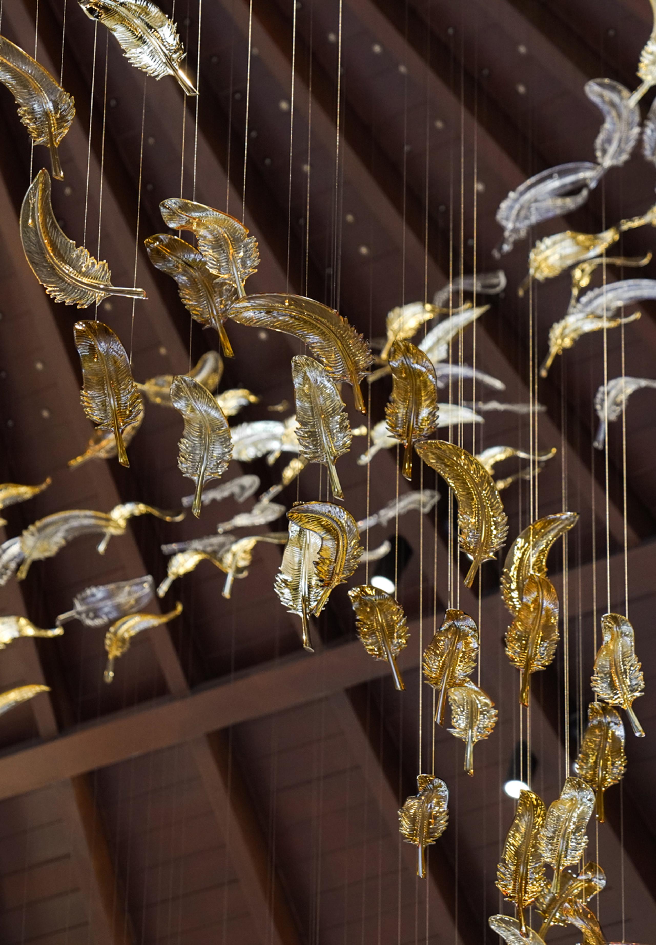 In the double-height living room, the Airy collection forms a striking installation that enhances the sense of height and openness. Inspired by gentle, free-flowing motion, the handblown components were customised in tones that harmonise with the wooden structural elements from which the chandelier is suspended. Expertly installed within the wooden structure, they seamlessly blend into the space. The design brings lightness and clarity to the room while supporting the overall architectural intent.