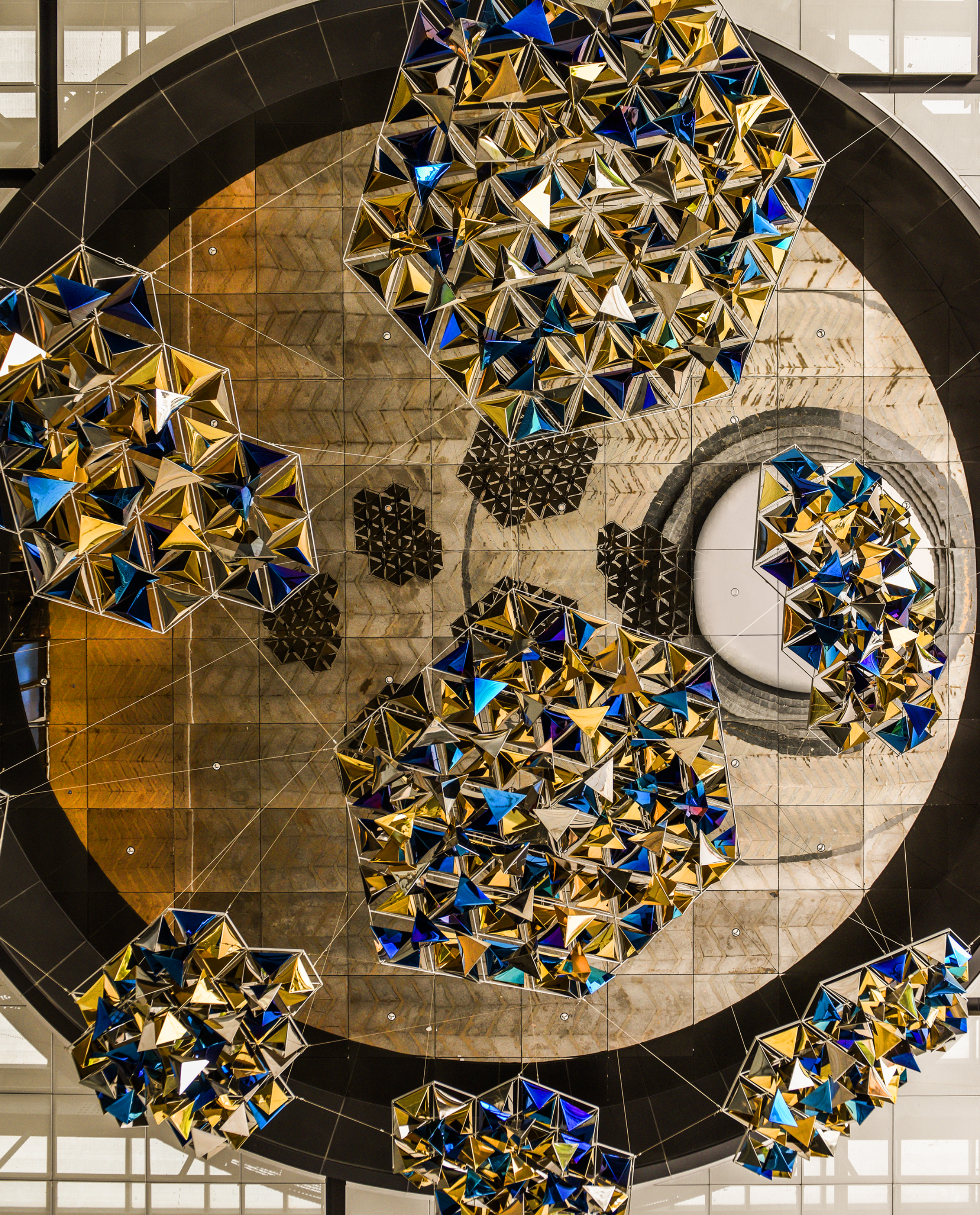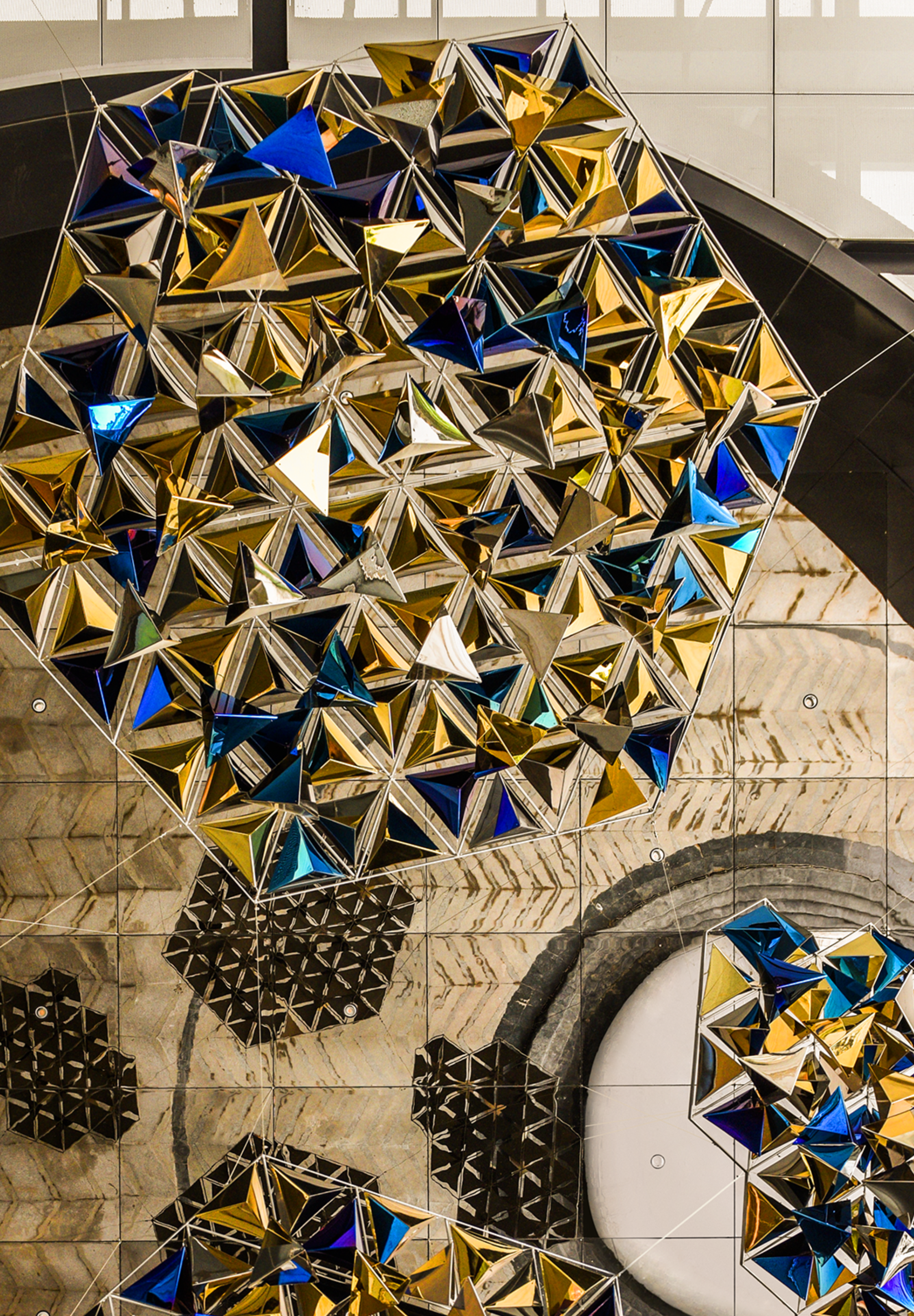 The installation is formed of sleek pyramids finished with nanocoating to produce beautiful metallic shades, combining technological and decorative processes. The translucent plated layers give this lighting installation a different look depending on whether the light is on or off.