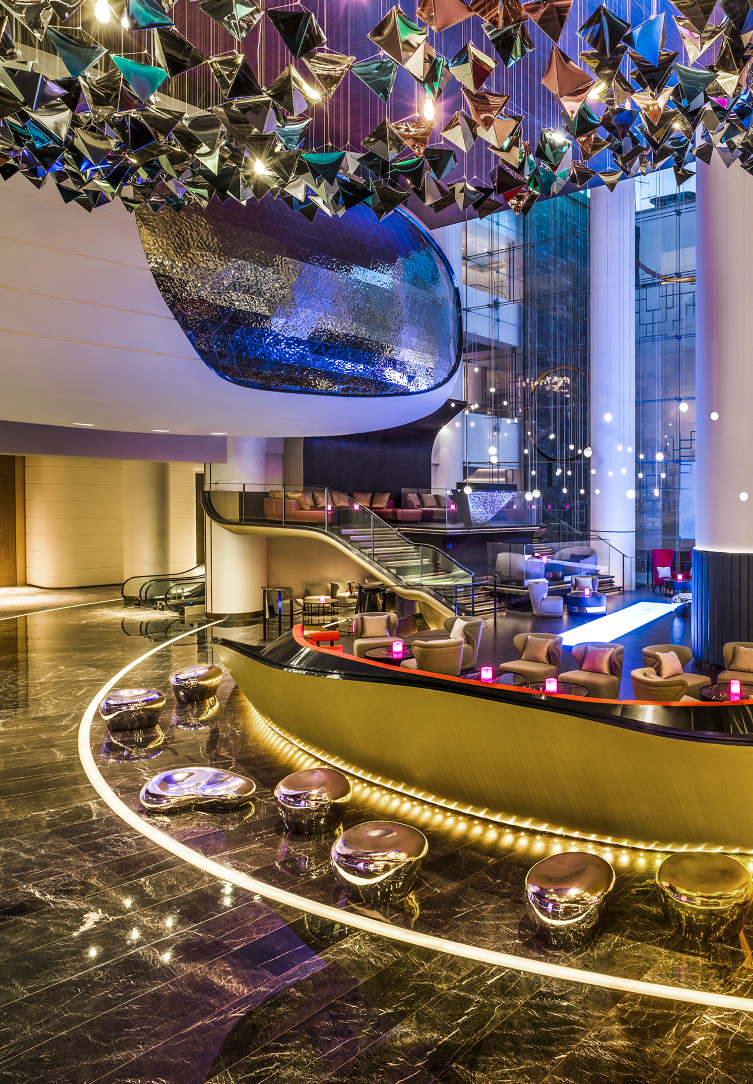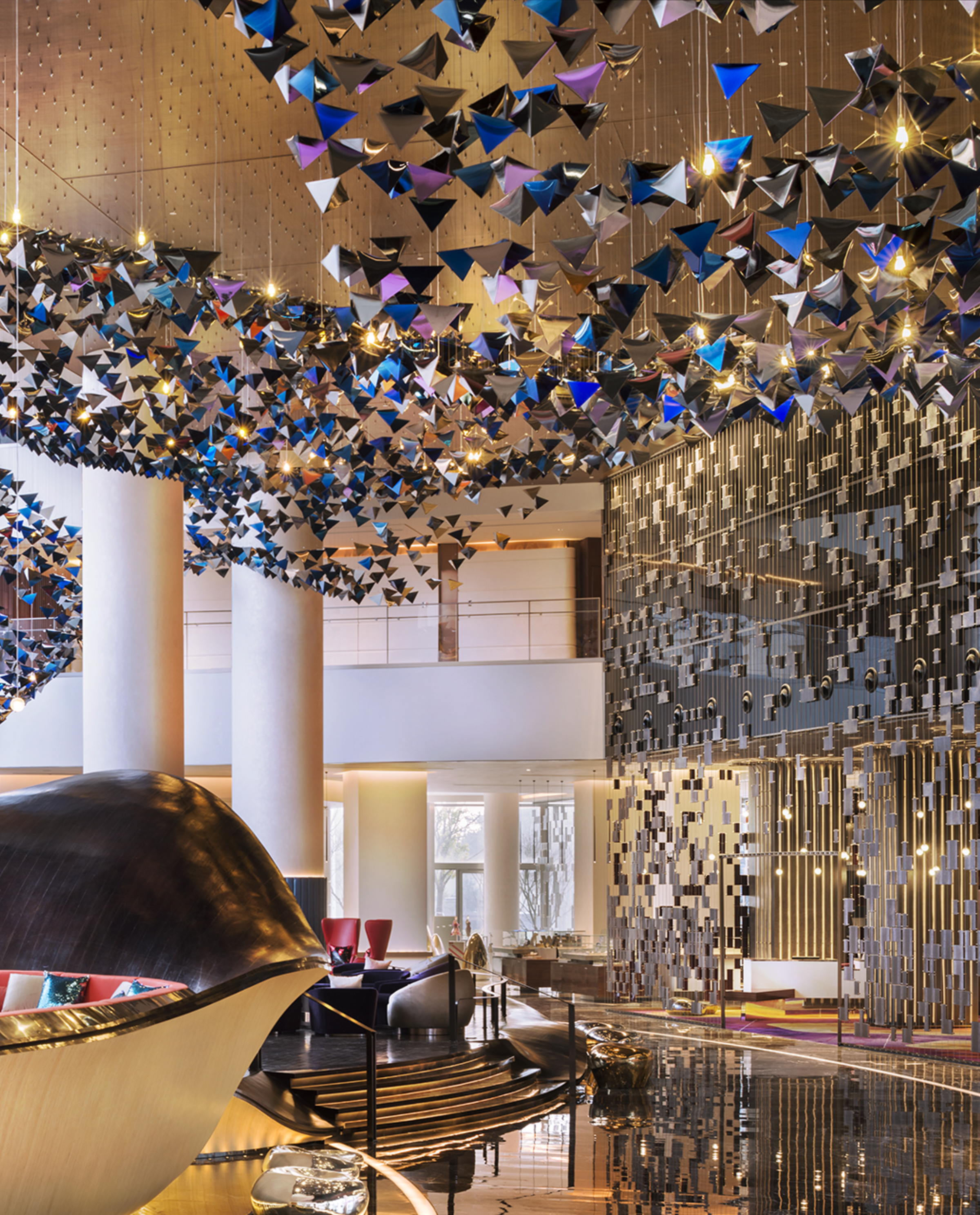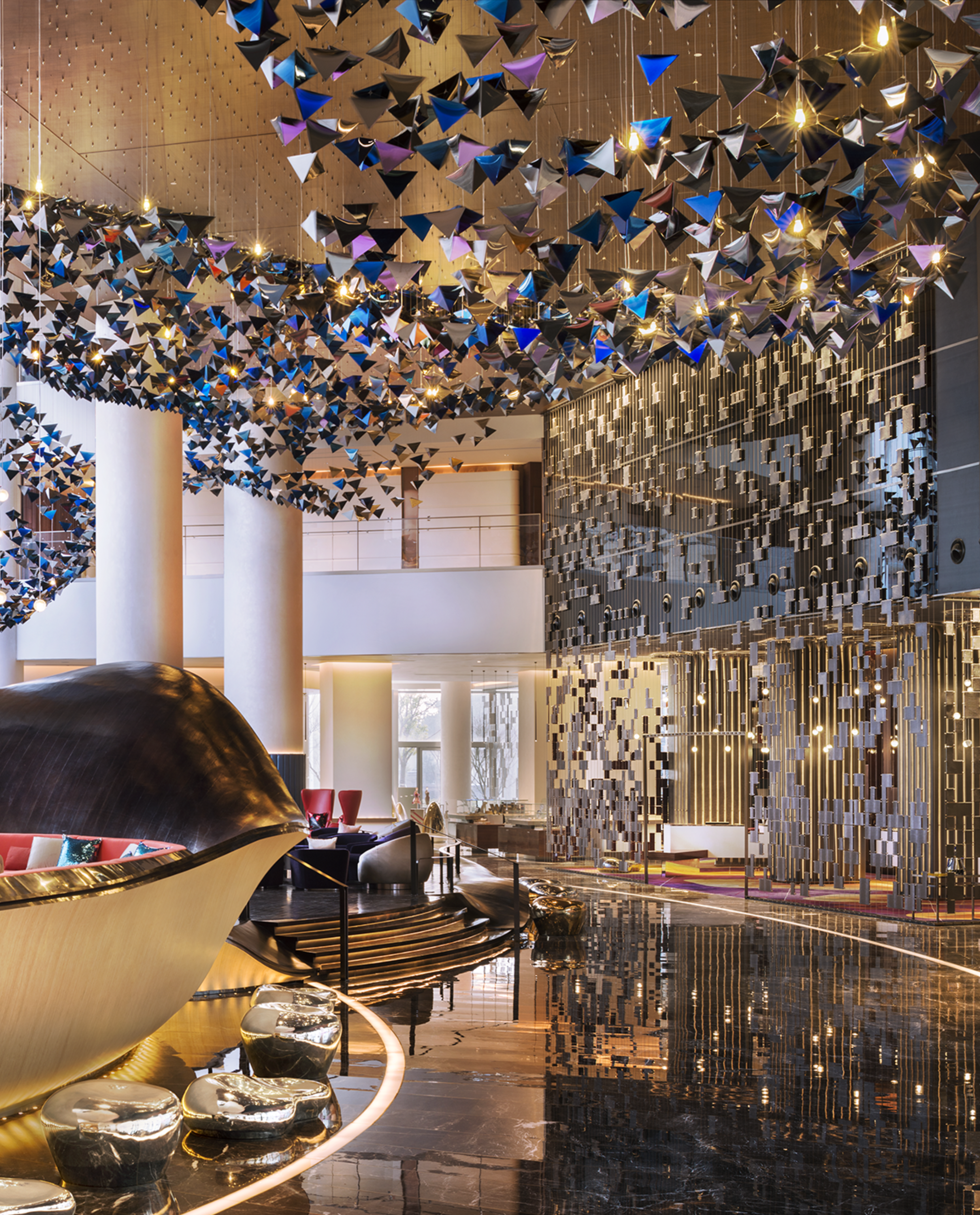 Combining decorative and futuristic design elements to crown the lobby of the W Suzhou Hotel in China, Sans Souci’s bespoke installation uses the latest technologies to achieve a flawless finish.