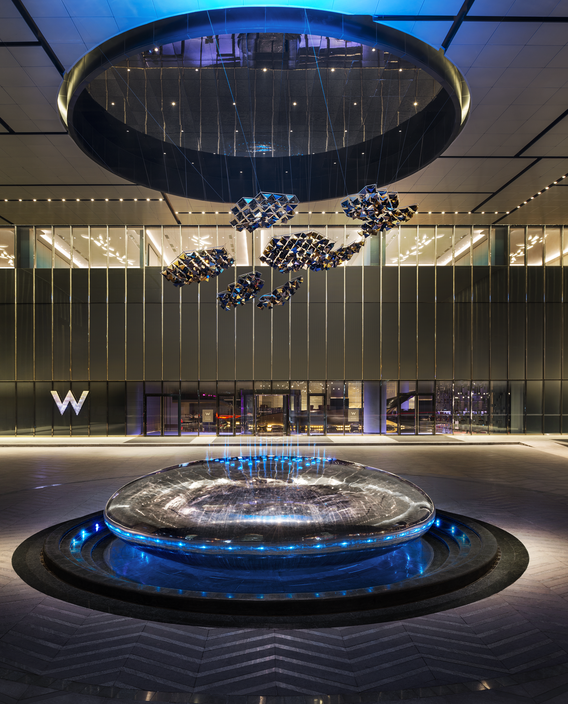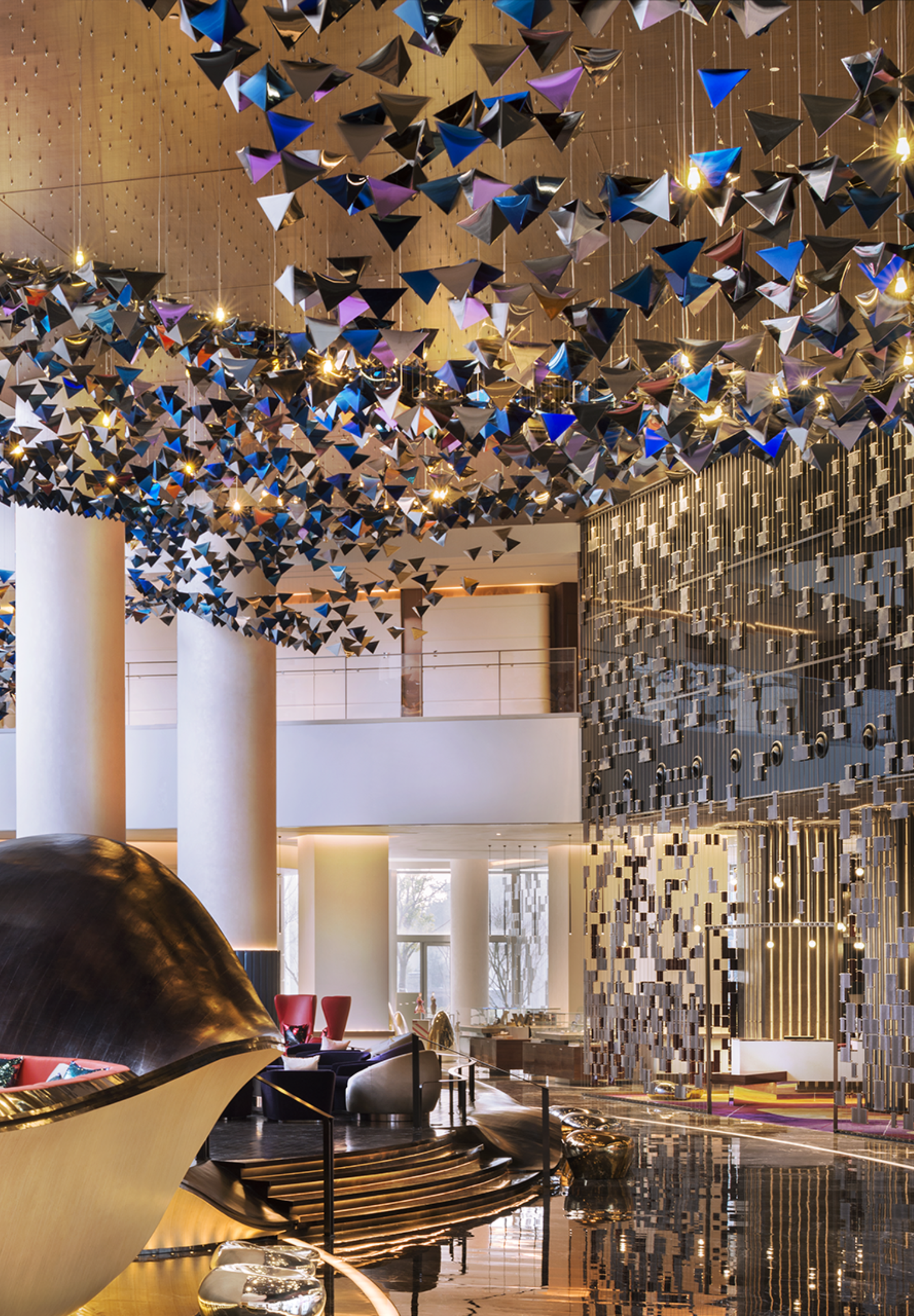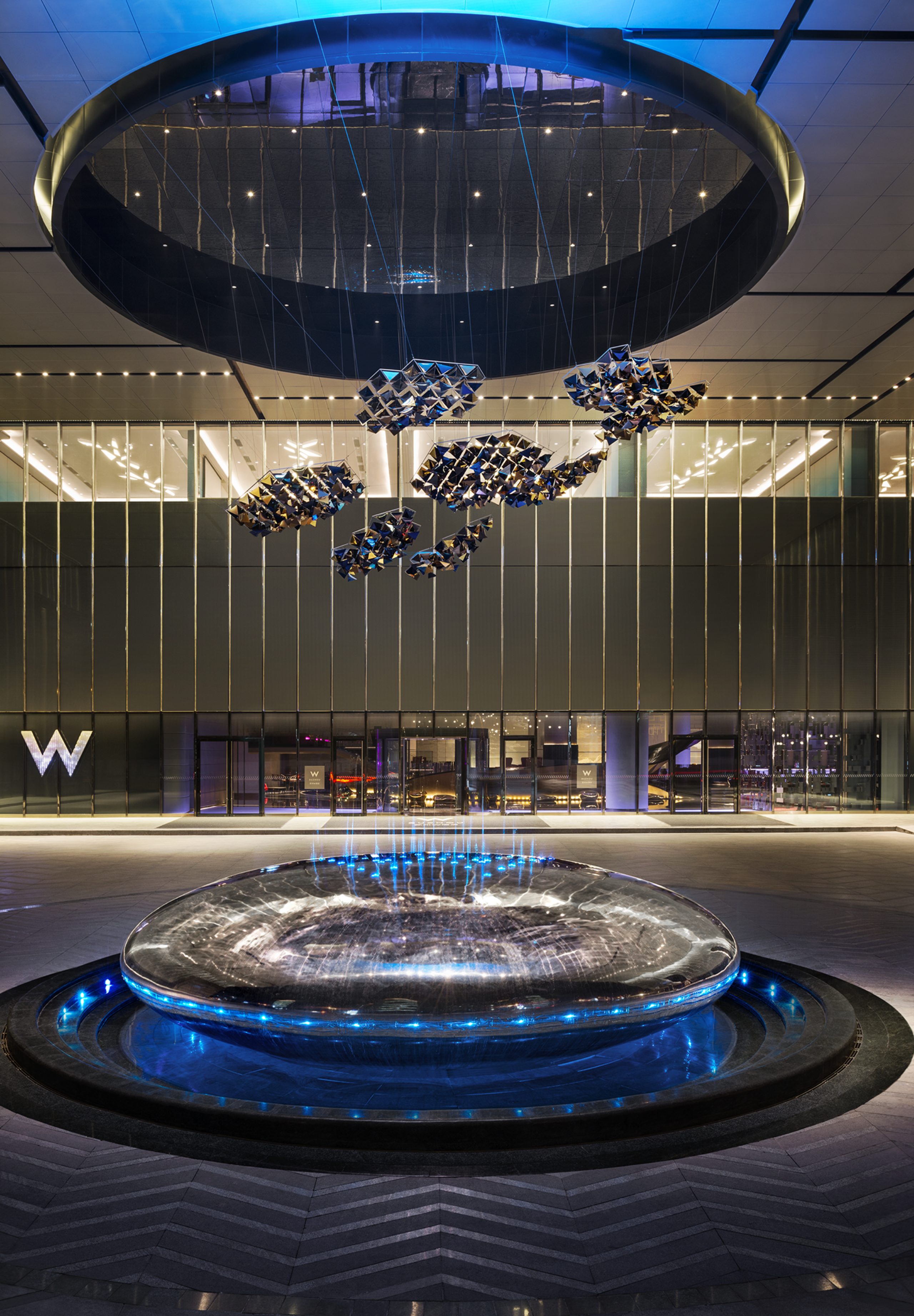 W Suzhou Hotel, China, represents a modern take on the local architectural heritage inspired by the region’s deep connection to nature. We created a unique piece to flow through the hotel’s “Living Room” lobby as an artistic centrepiece to delight visitors to the hotel.