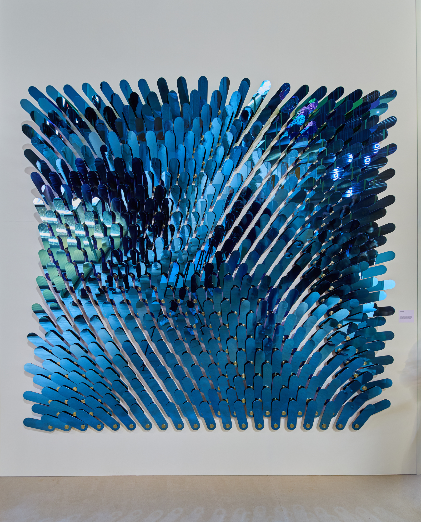 A symbol of our time, Switch installation transforms a simple yet powerful gesture – the slide of a digital switch – into an immersive experience that challenges perception. Mirrored forms multiply and shift, guided by an invisible force field, distorting reflections and fragmenting reality into shifting perspectives. As we stand before it, we see ourselves altered – morphed, refracted, ever-changing. More than an object to observe, Switch invites interaction, encouraging us to question what is real and offering a fleeting glimpse beyond the familiar surface of the everyday.