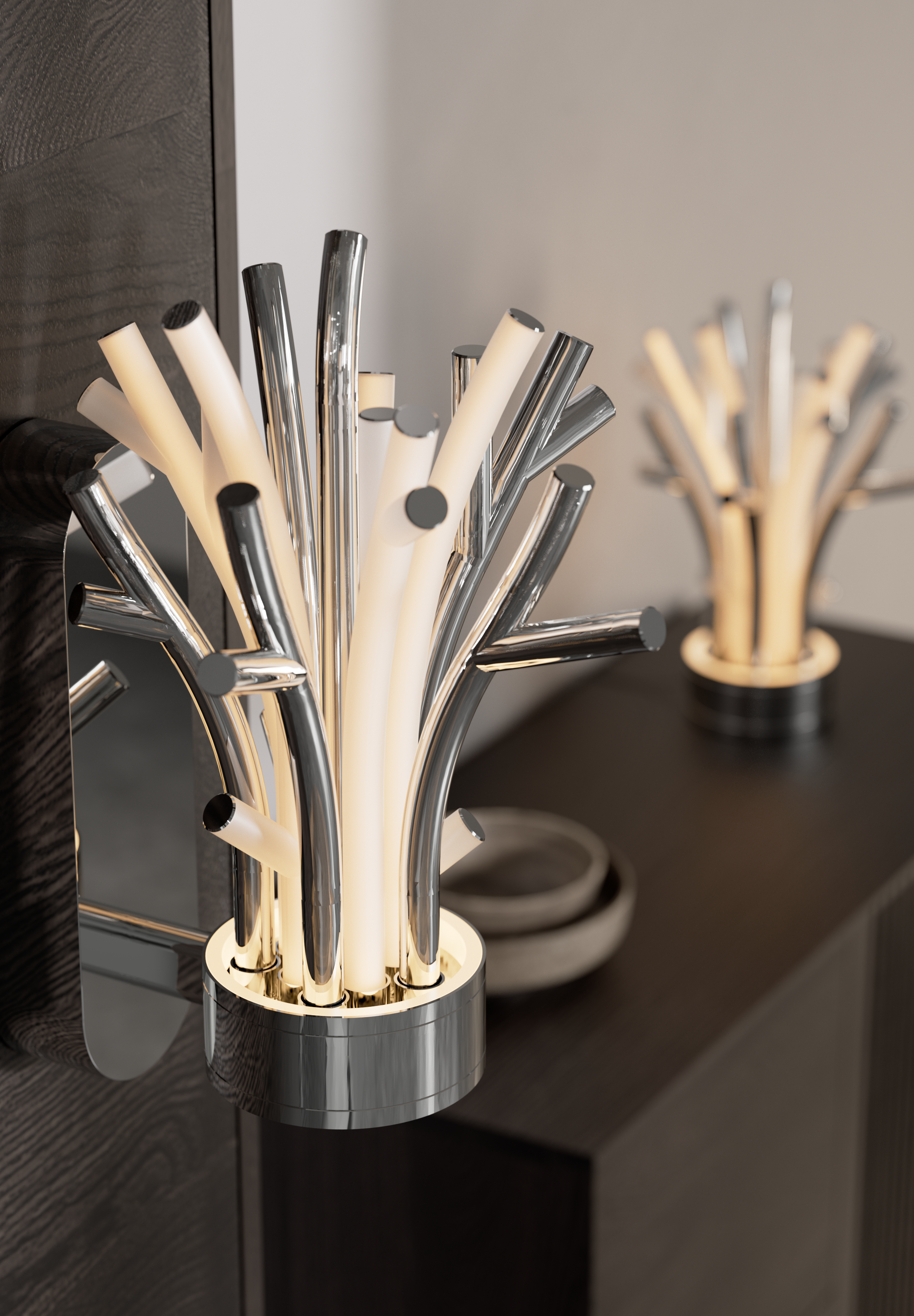 BRANCHY combines flawless design with emerging technologies to create exciting installations that are the ultimate artistic focal point for your space. Fitted together with metal bindings, the range of sleek crystal tubes are finished in transparent, golden, silver and rose gold nanocoating together with sandblasted elements that expertly disperse the light.