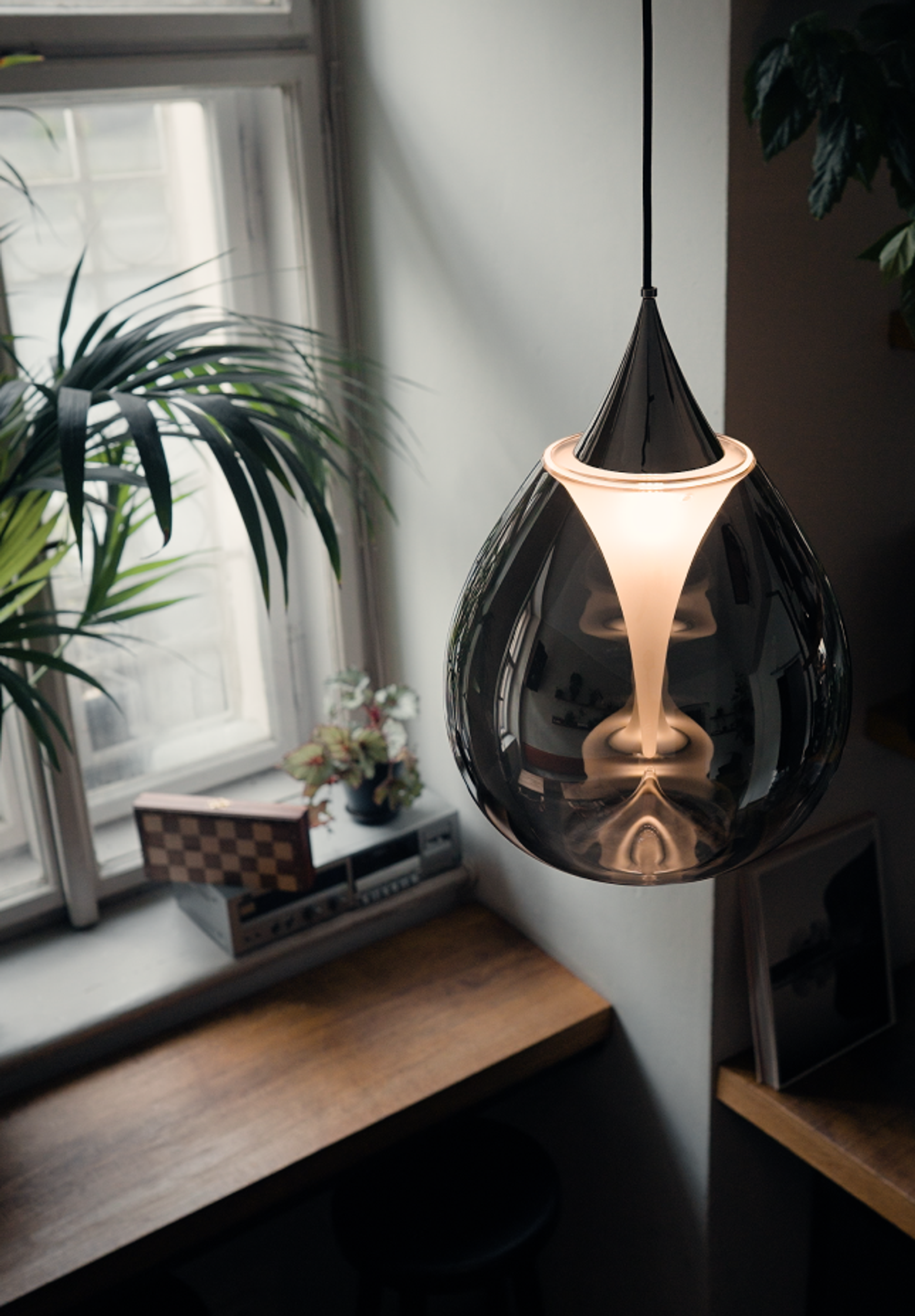 Two beautifully crafted glass pendants – one convex, one concave – are fitted together with an integrated light source. BOND reflects and transmits light differently depending on the natural light that surrounds it, giving your interior a different ambience during different times of day or seasons.
