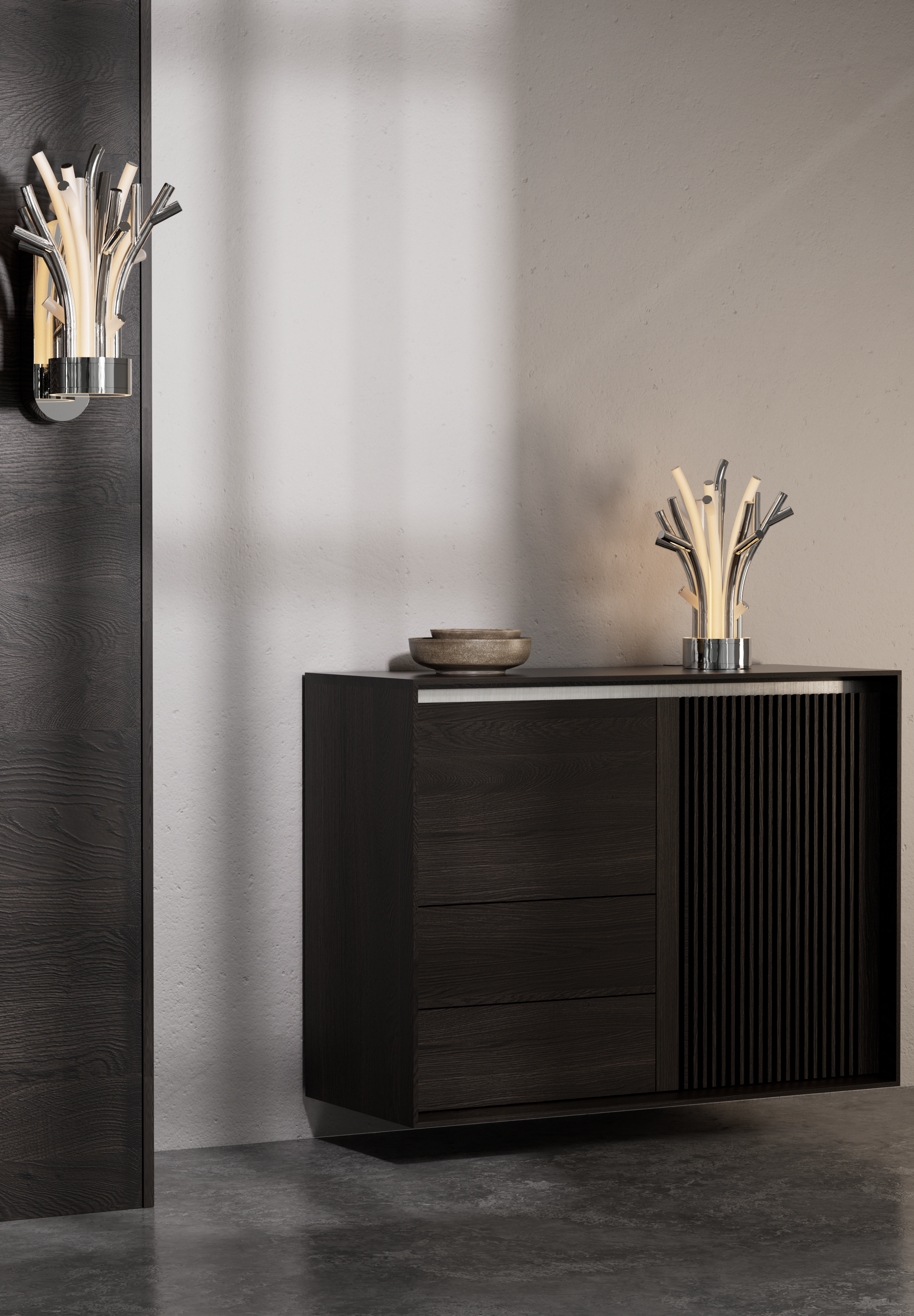 Branchy tells the story of elemental energy, transforming the moment of the first lightning strike into a bold aesthetic language. Designed by William Sawaya, the collection uses elongated, branch-like forms in nanocoated and sandblasted crystal to capture nature’s tension between chaos and control. The expanded range includes: